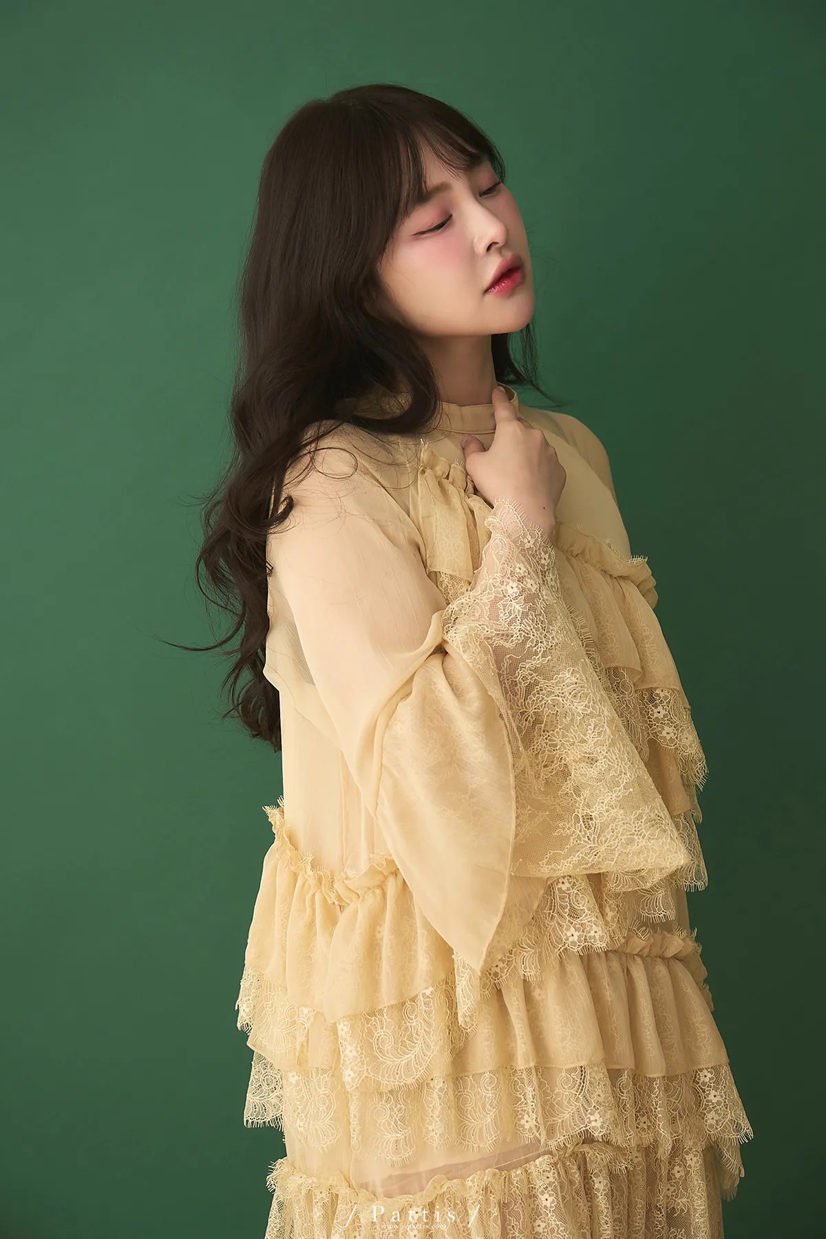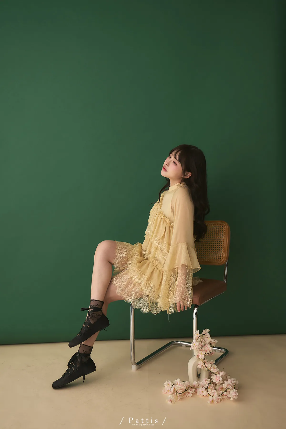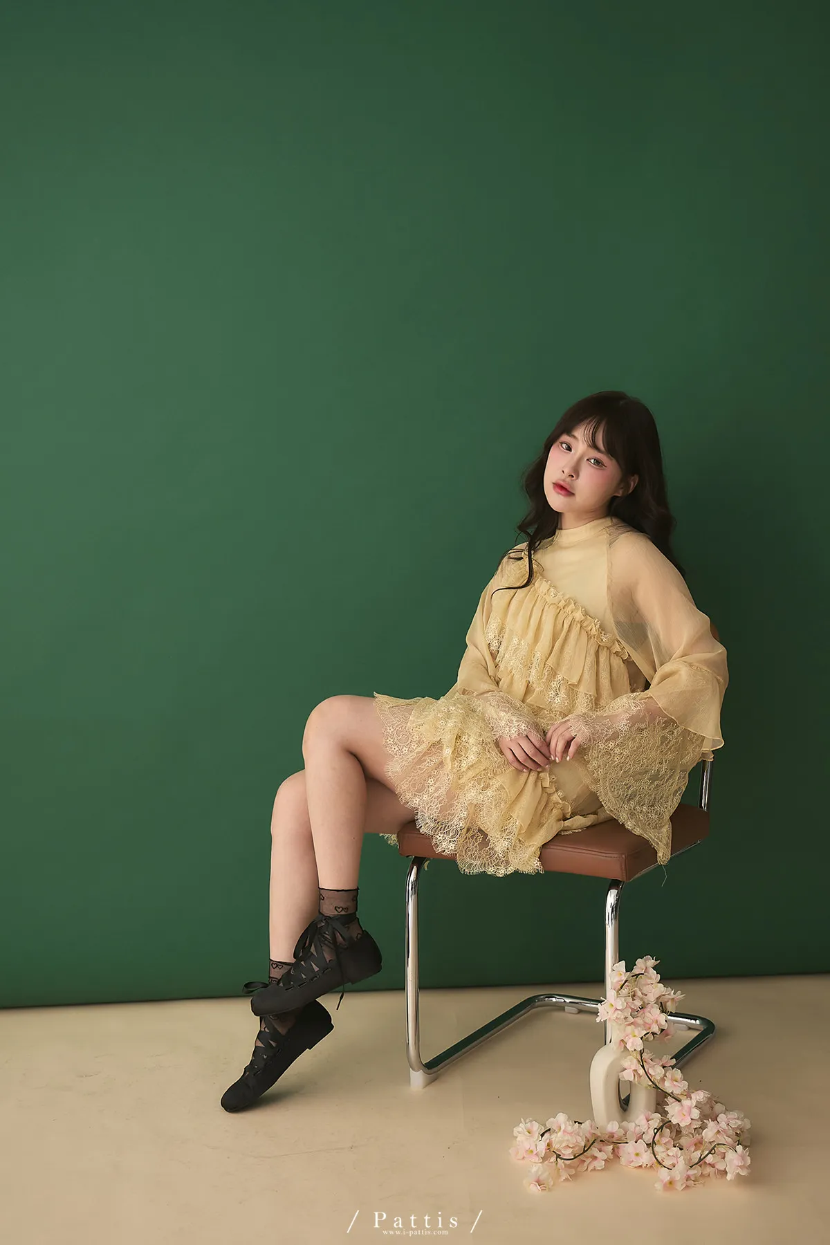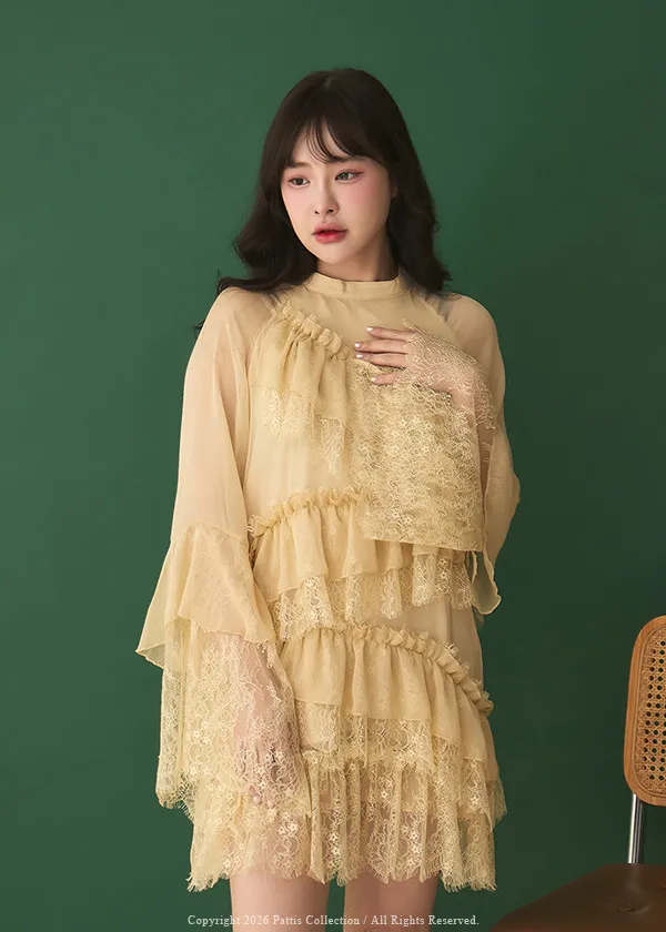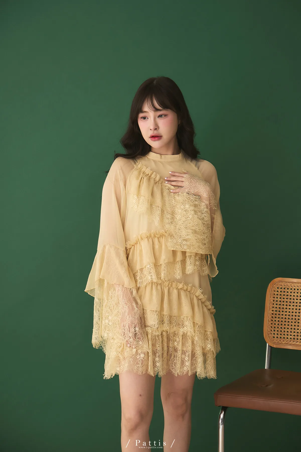 (現貨)*特*/廣州選品/ 古董蕾絲荷葉斜拼接短洋裝(黃杏)