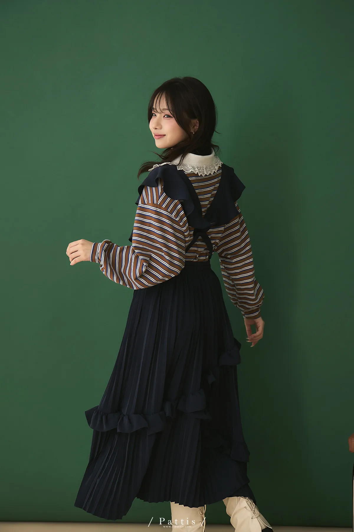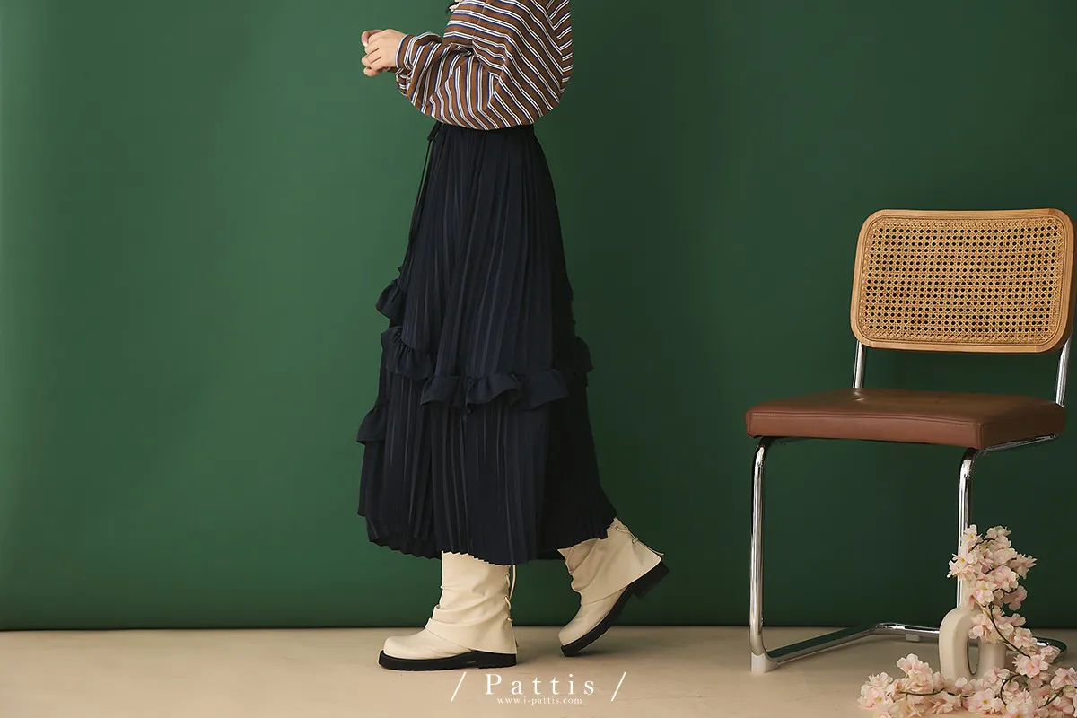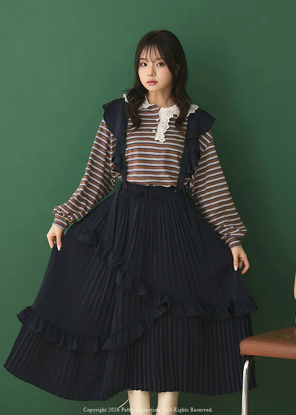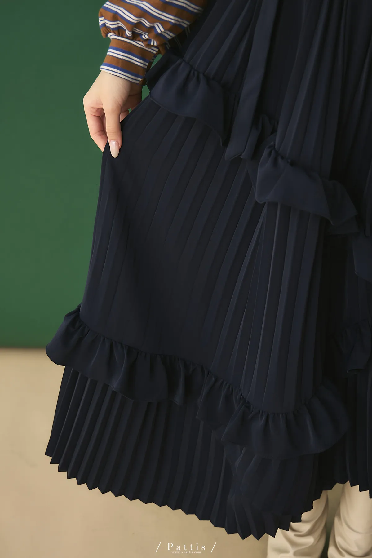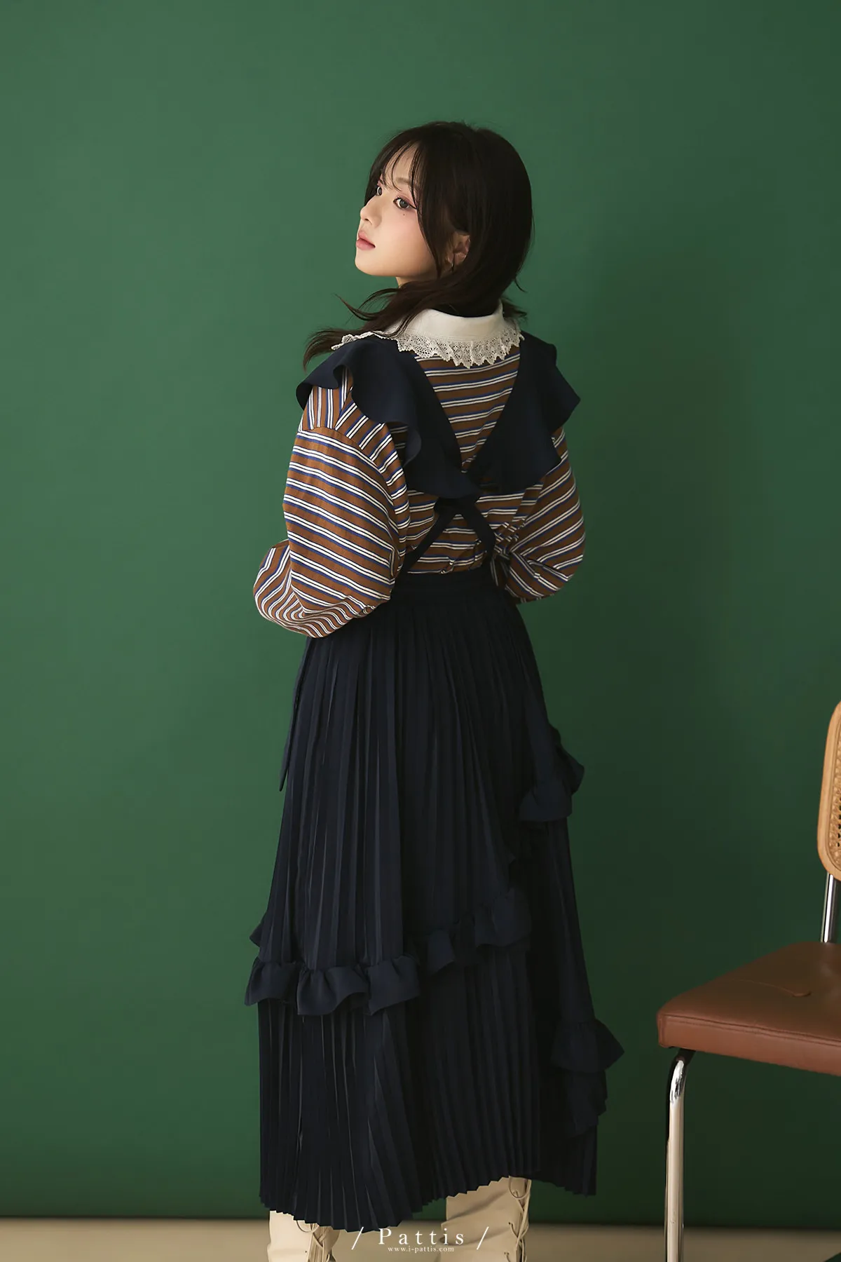 若花般盛開時 | 2way可拆肩帶不規則抓皺多層壓摺吊帶裙(深藍)