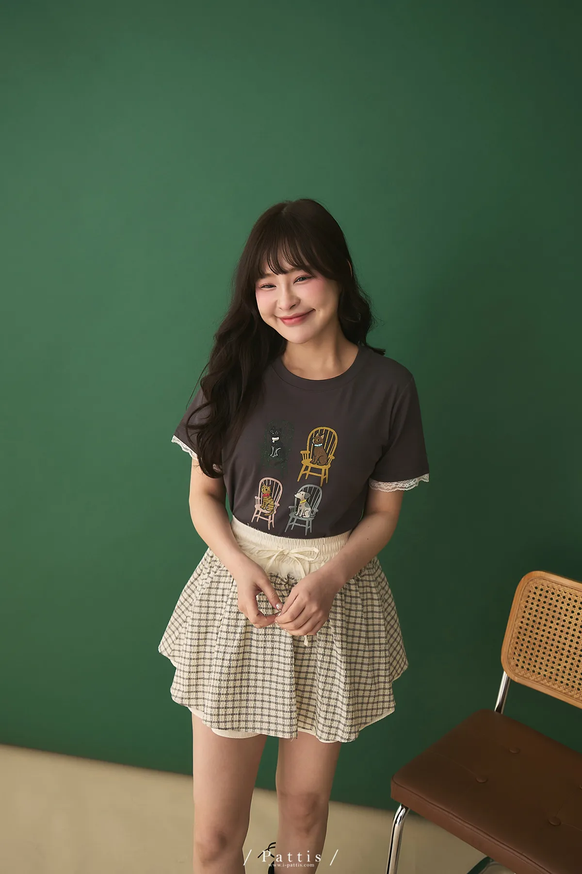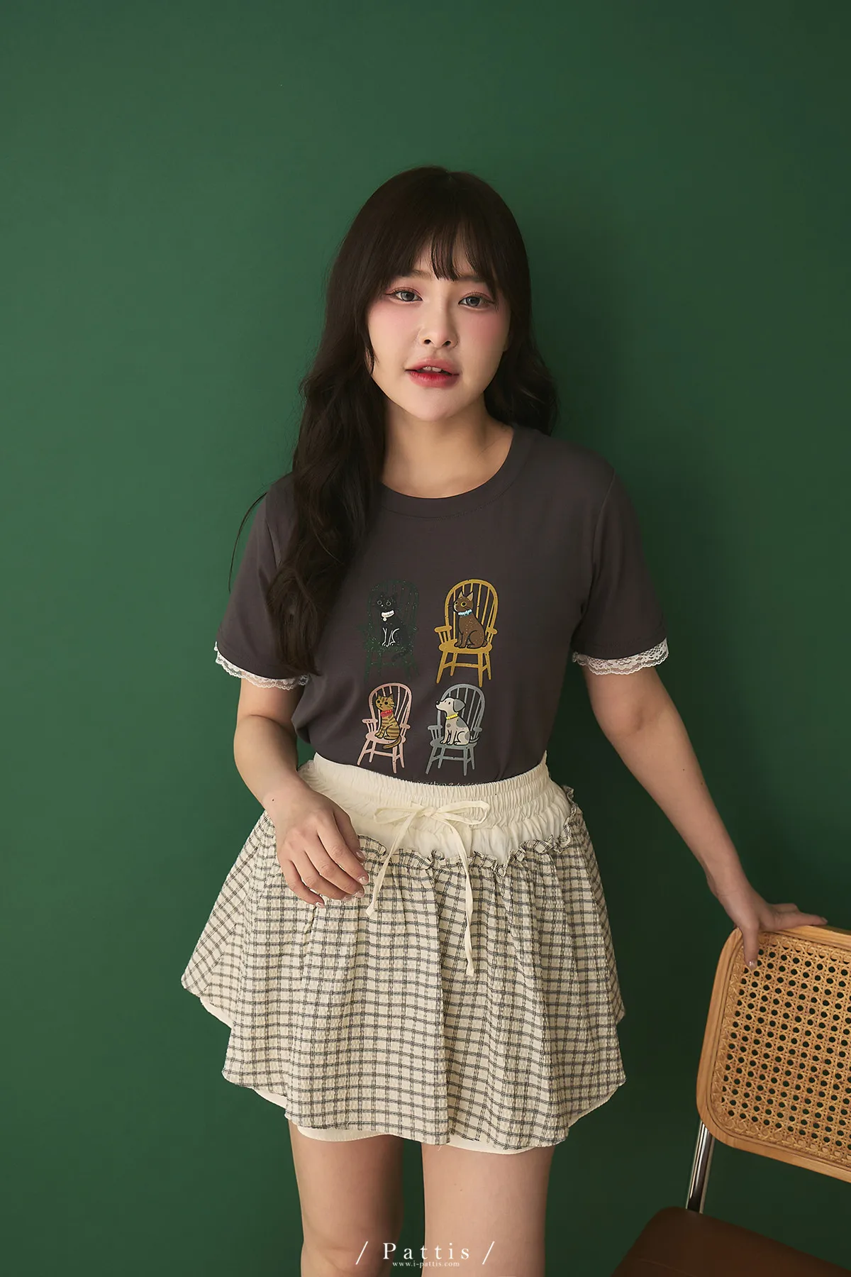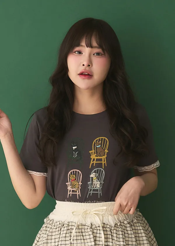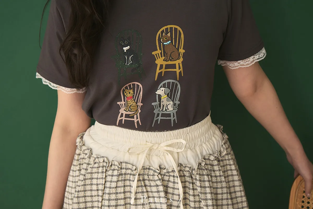 小家庭成員 | 小串珠項鍊貓咪狗勾蕾絲袖T恤(灰綠)