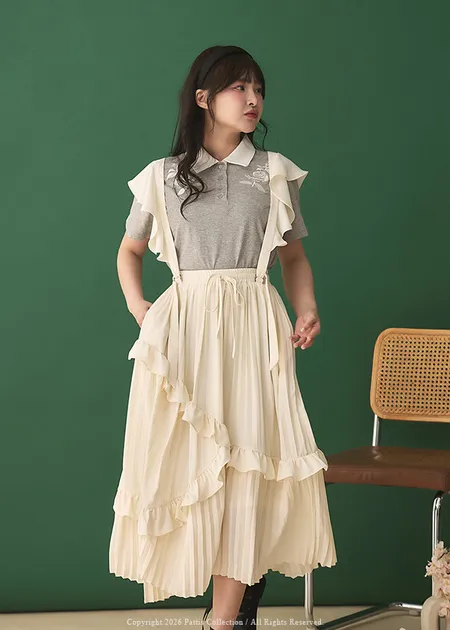 若花般盛開時 | 2way可拆肩帶不規則抓皺多層壓摺吊帶裙(米白)