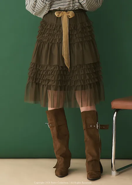 芭蕾室的清晨光 | 抓皺網紗綁帶層次紗裙(深綠)