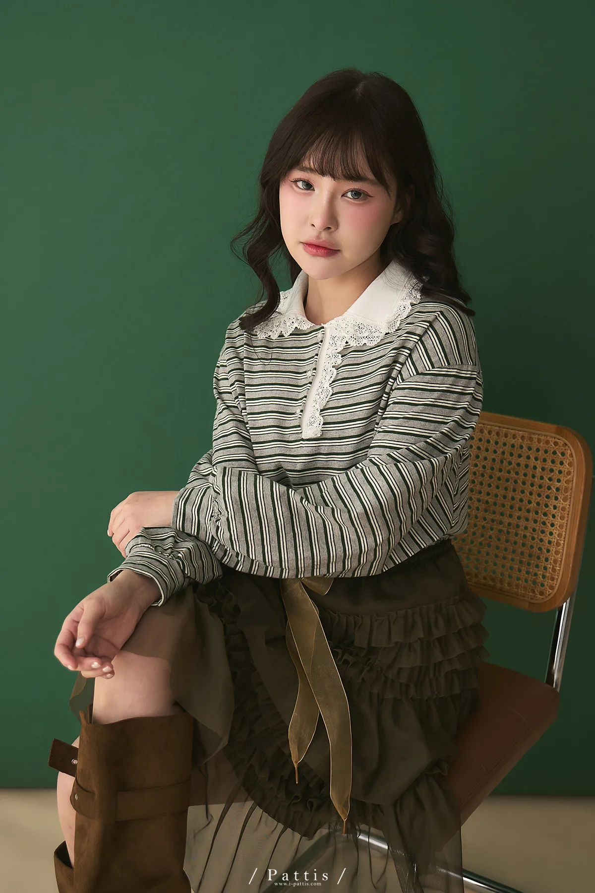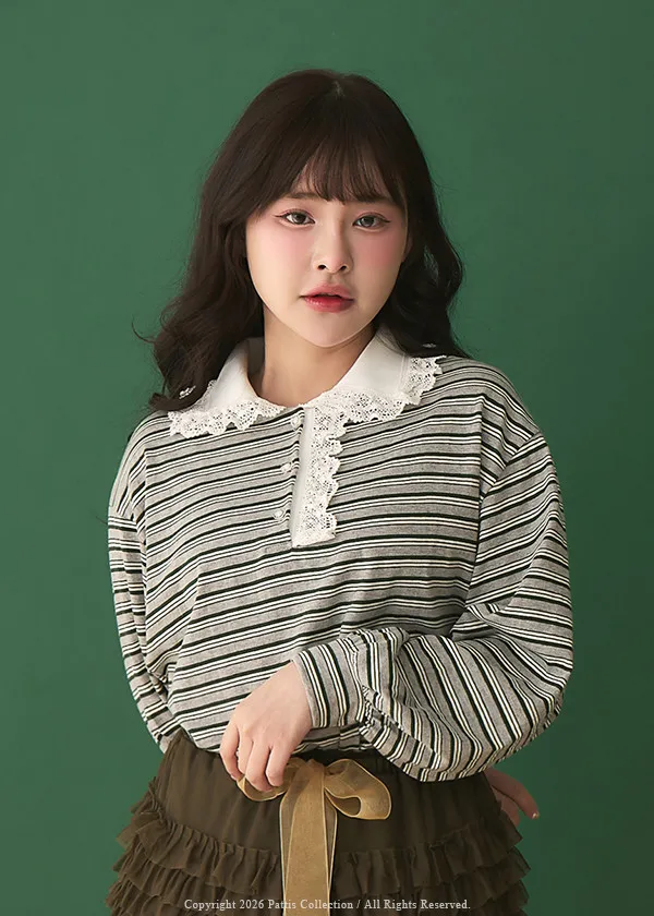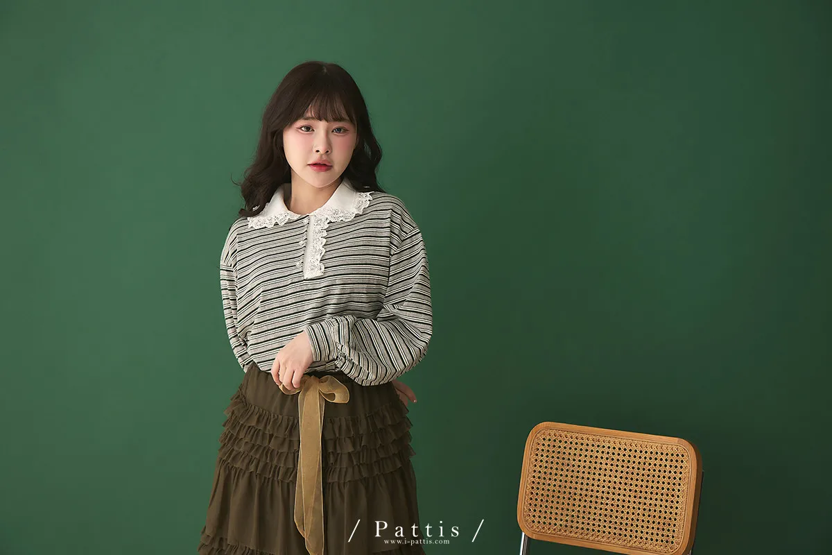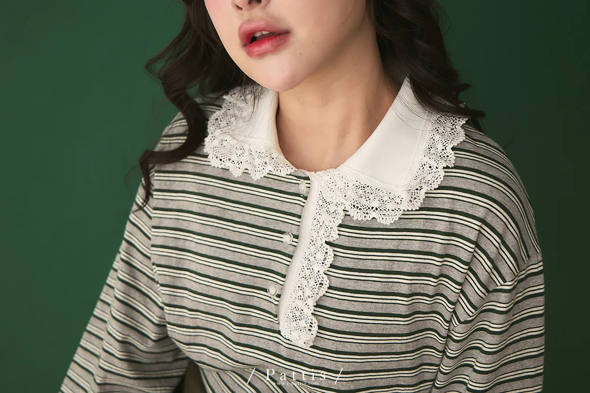 把時間花在跟你見面 | 蕾絲荷葉領片條紋上衣(灰綠)