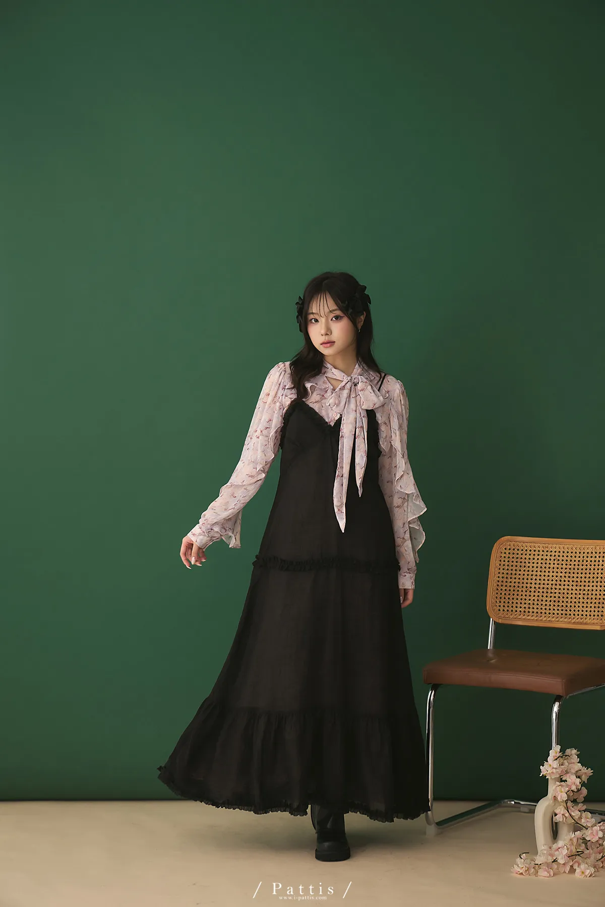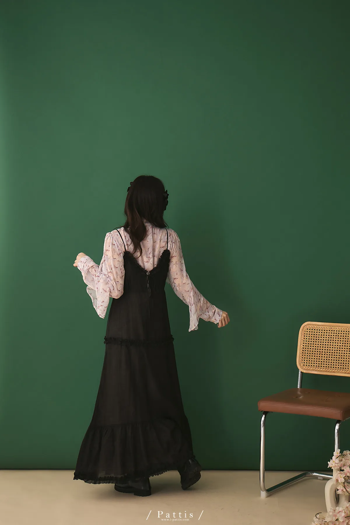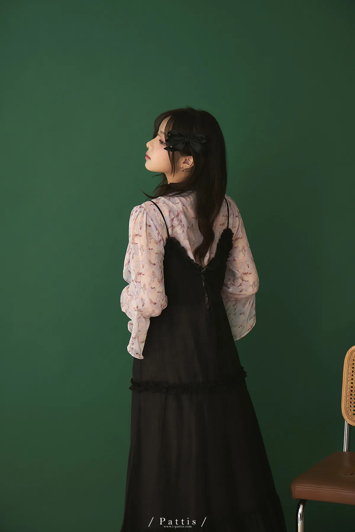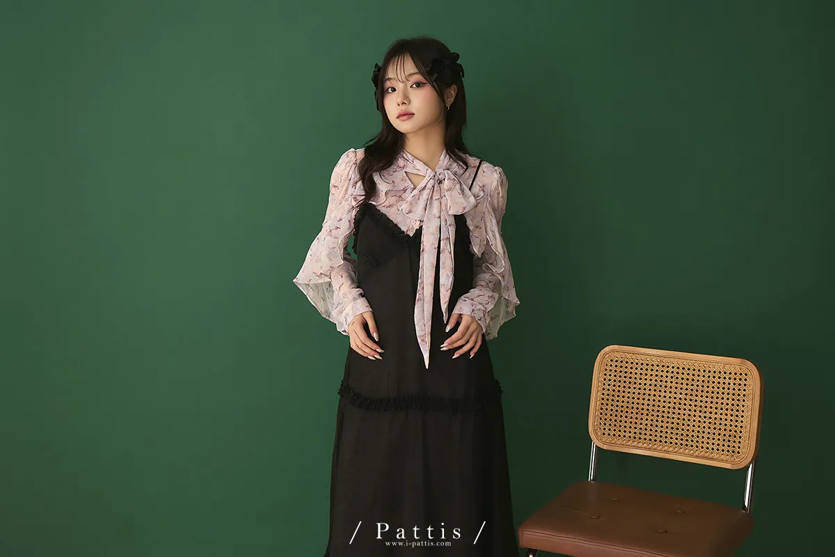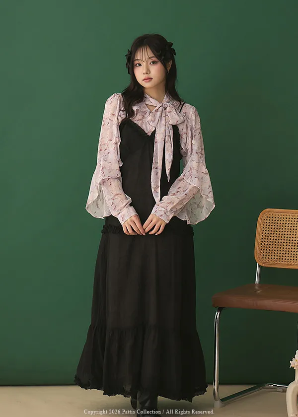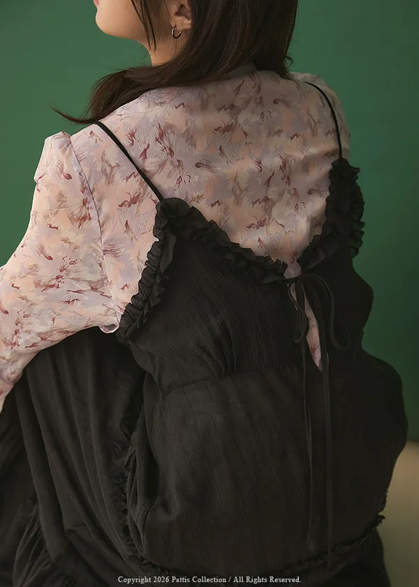月光暈染了春夜 | 絲光透膚荷葉後綁帶V領吊帶洋裝(黑)