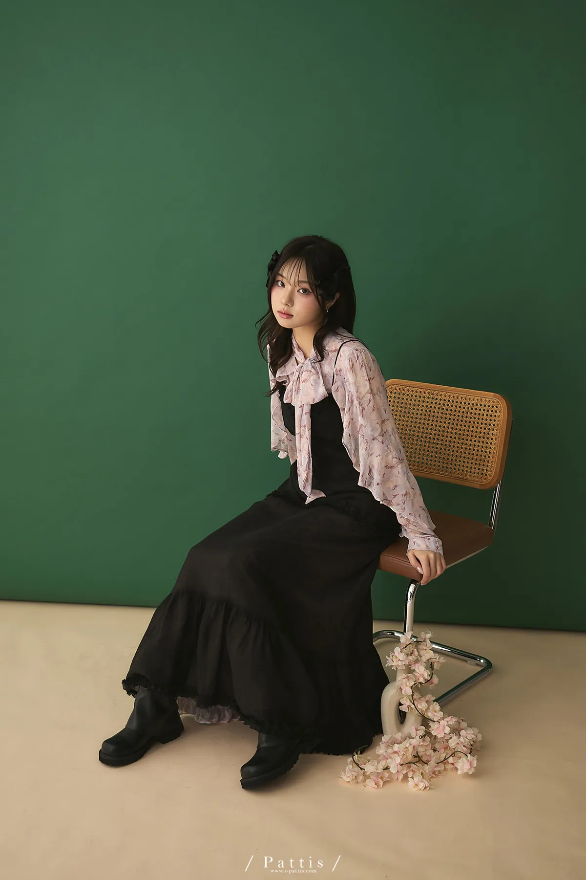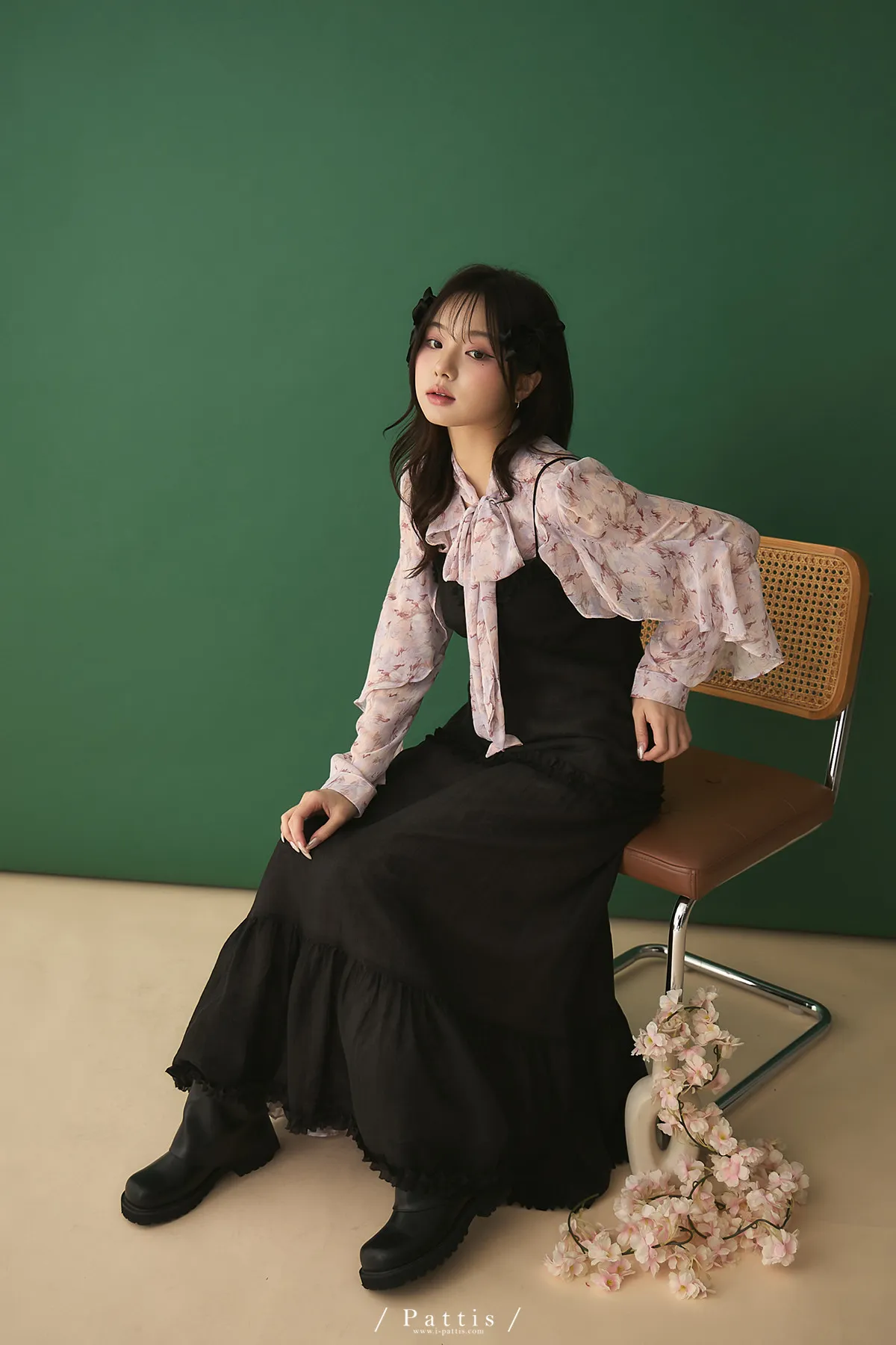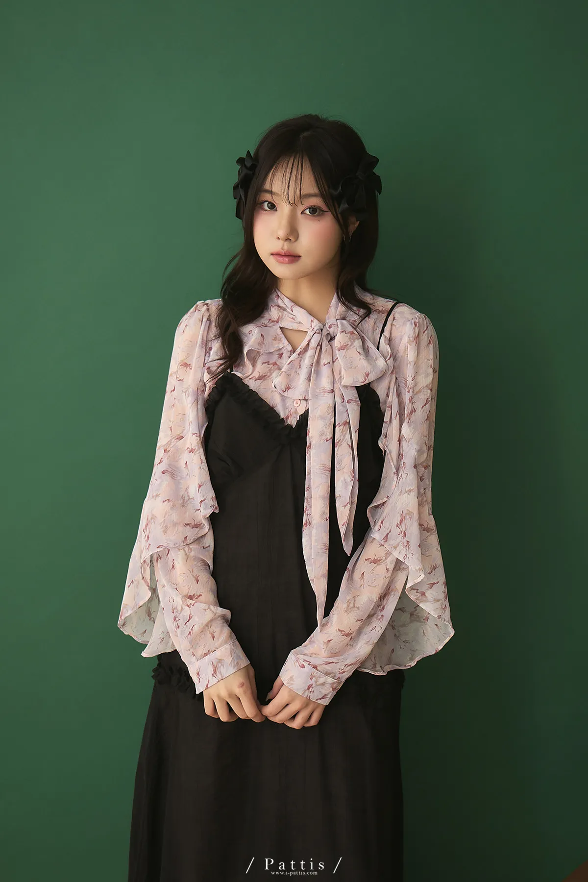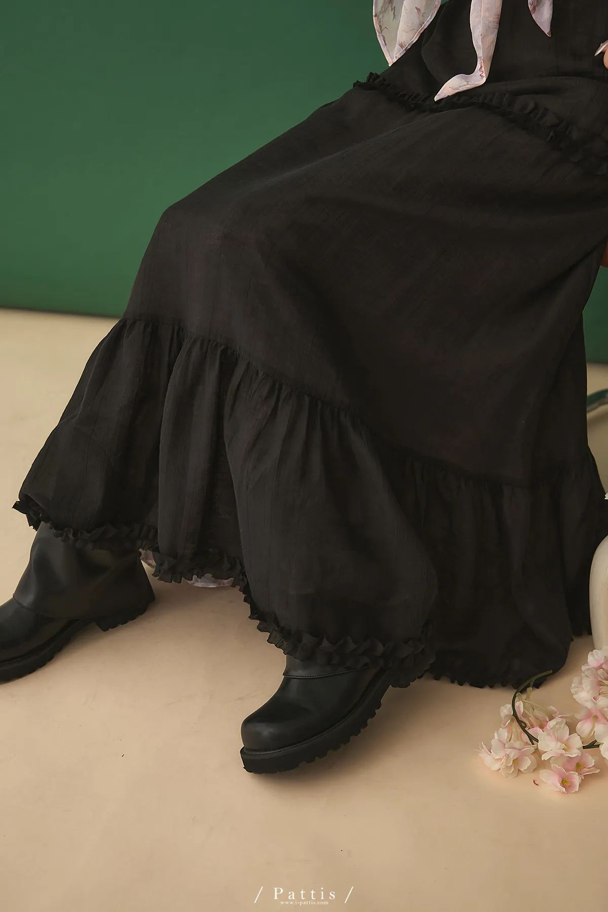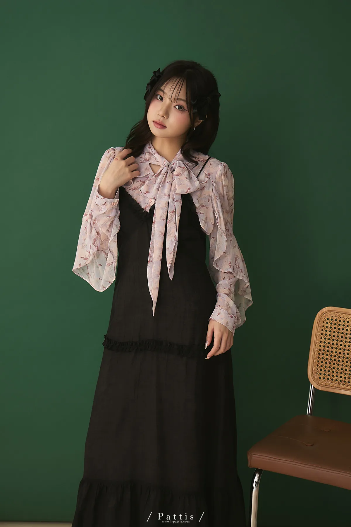 月光暈染了春夜 | 絲光透膚荷葉後綁帶V領吊帶洋裝(黑)