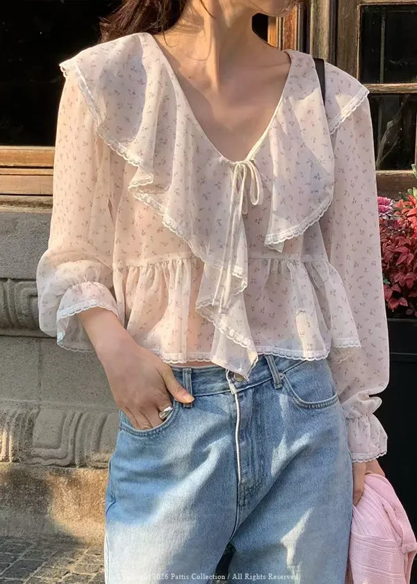 陽光拯救者 | 綴蕾絲小碎花荷葉短版上衣(米白)