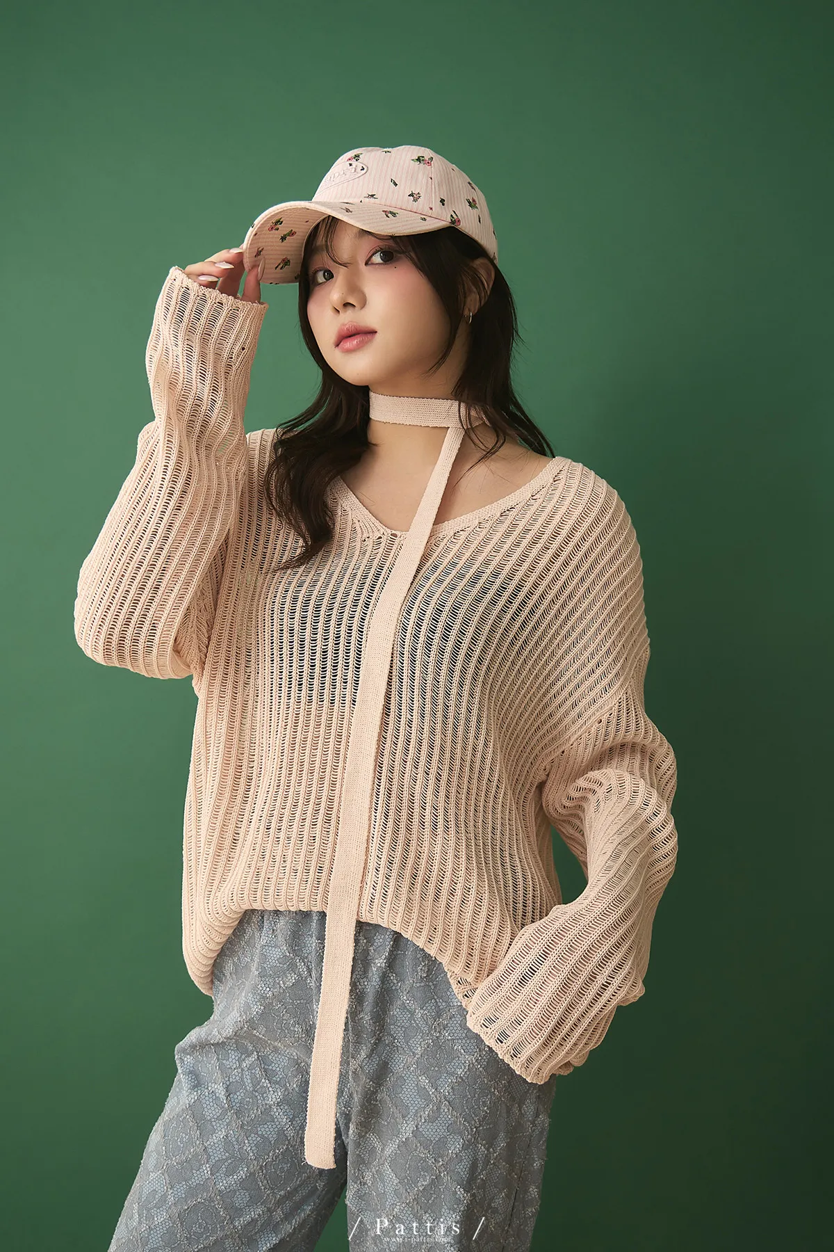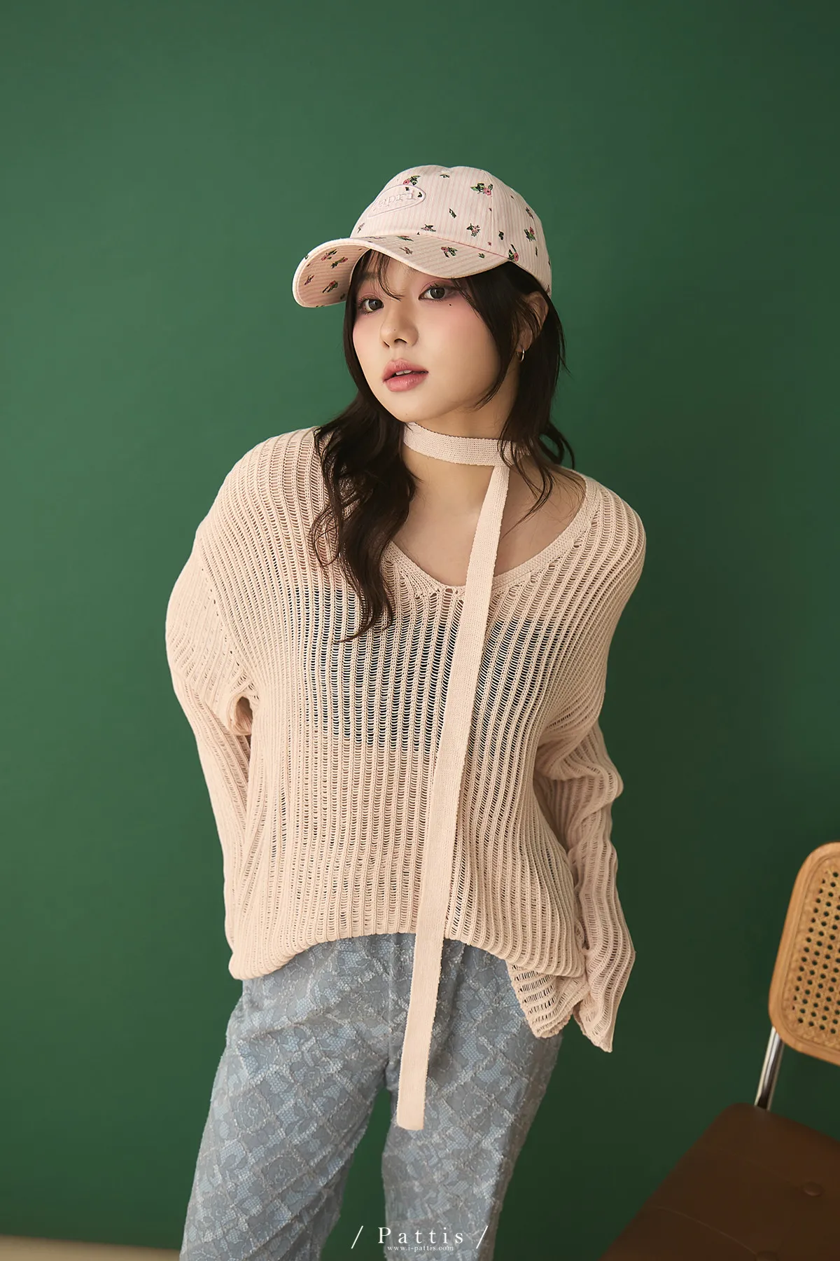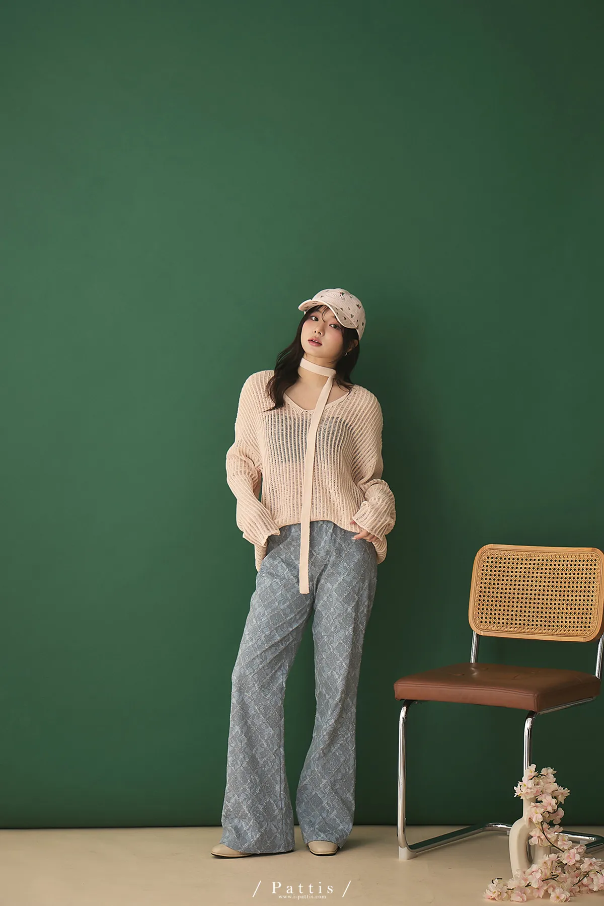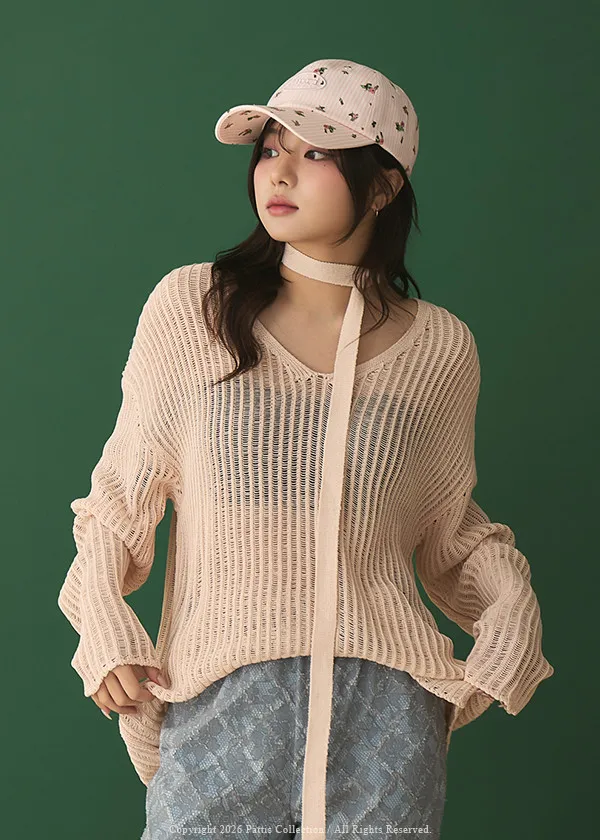 清晨偶遇了粉茱萸 | 配綁帶V領針織格紋上衣(淺粉)