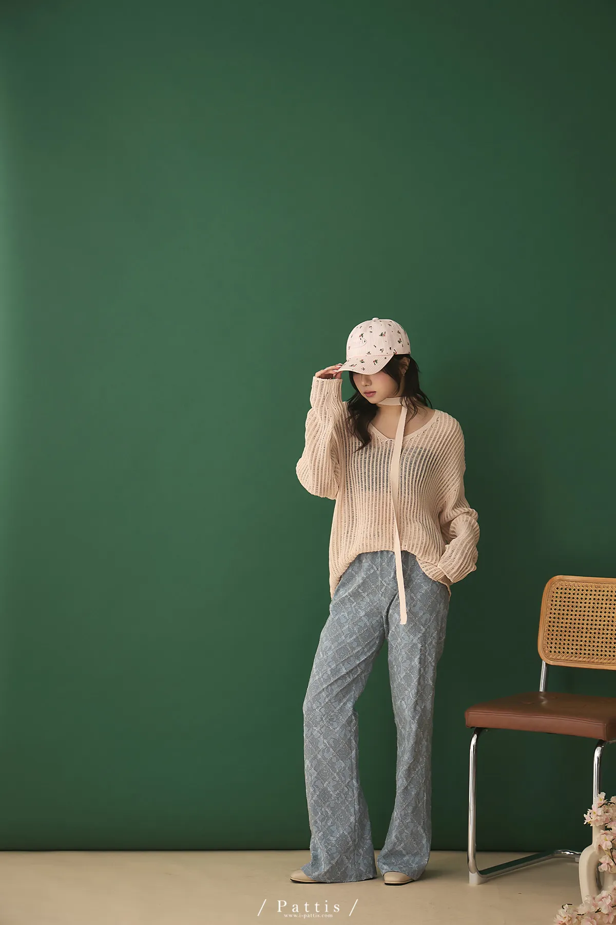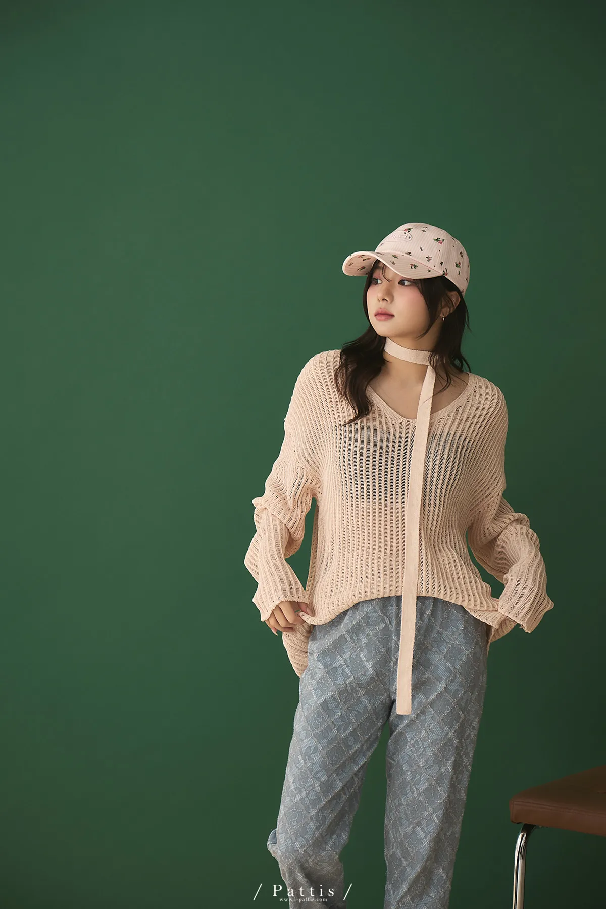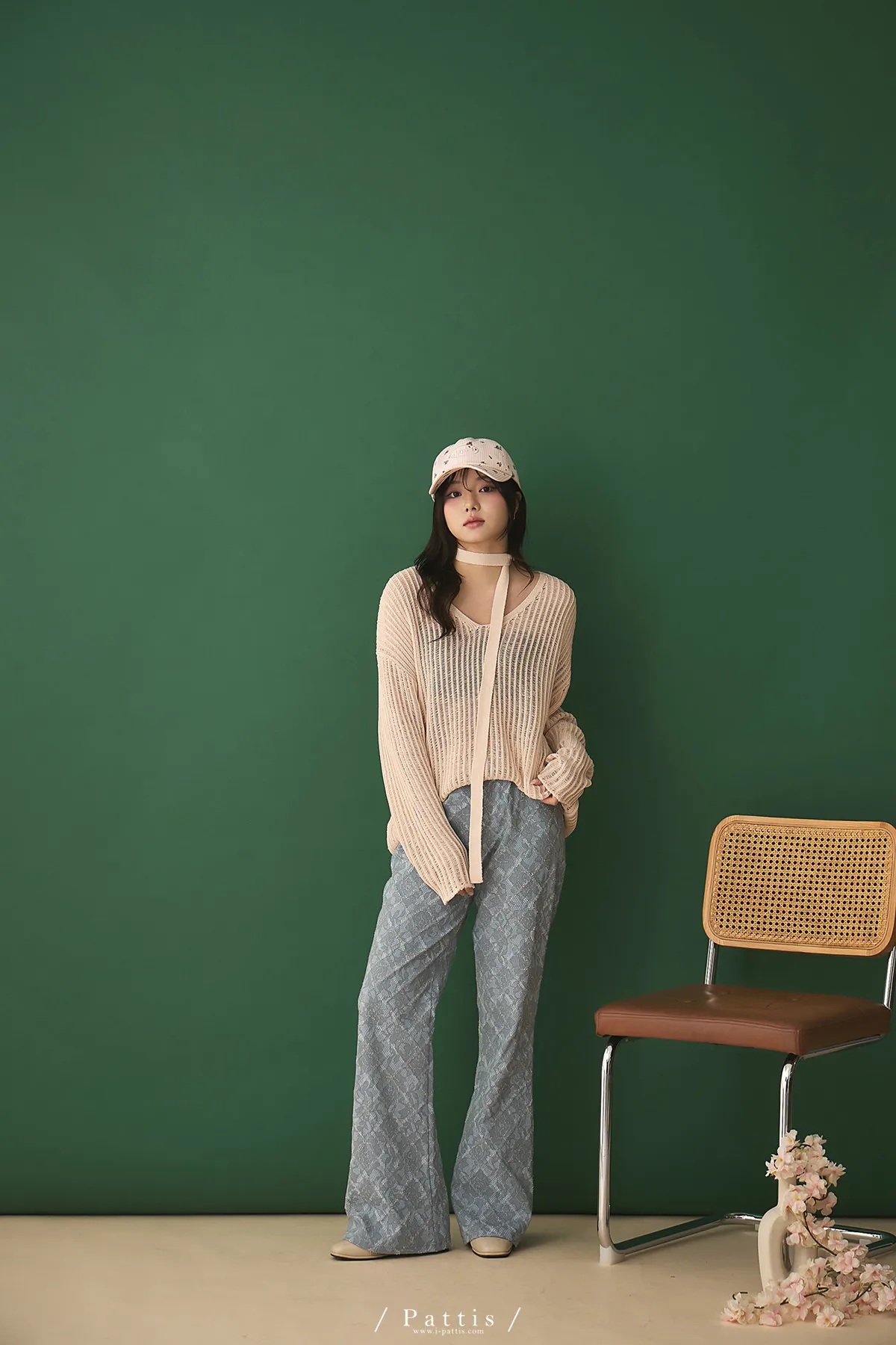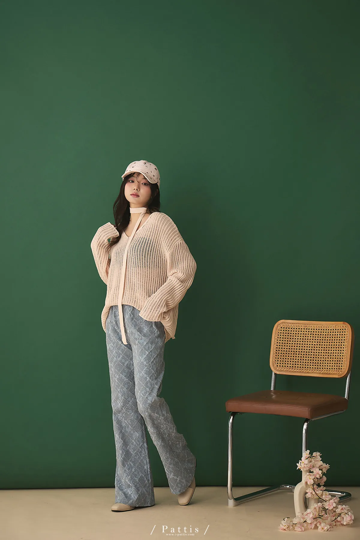 清晨偶遇了粉茱萸 | 配綁帶V領針織格紋上衣(淺粉)
