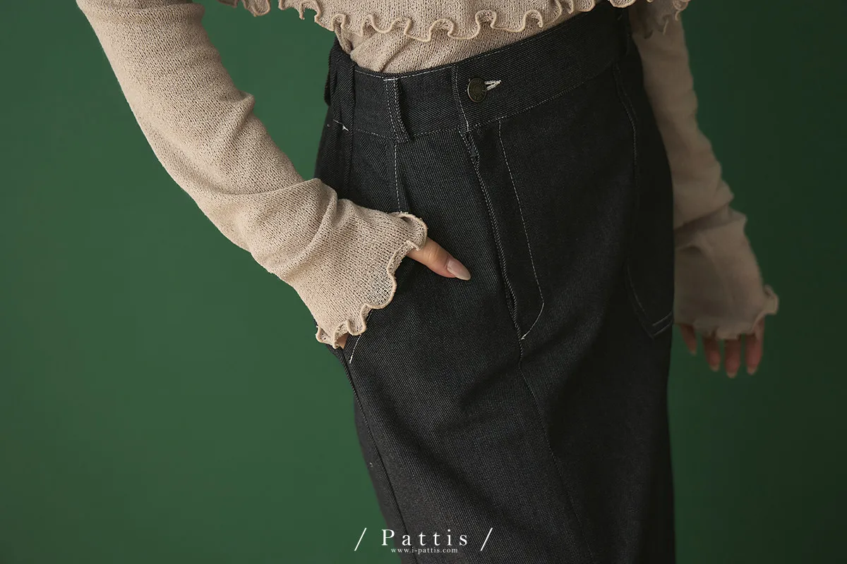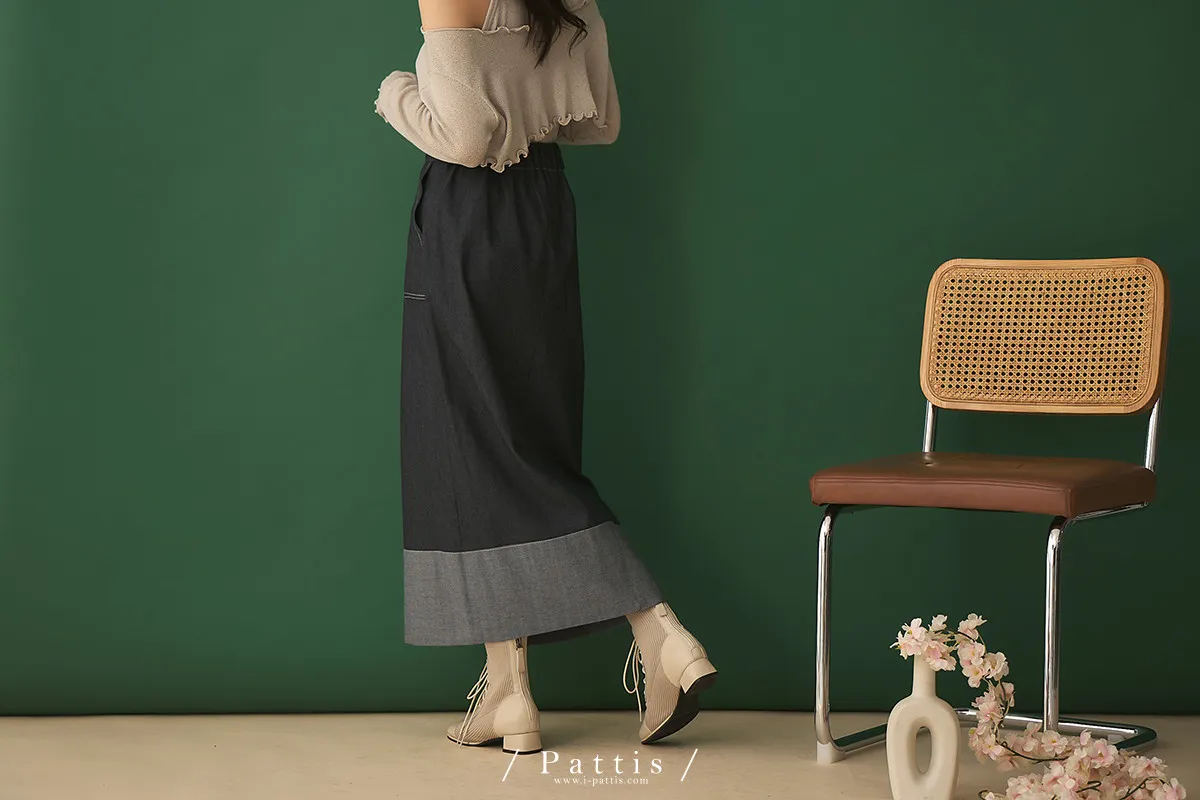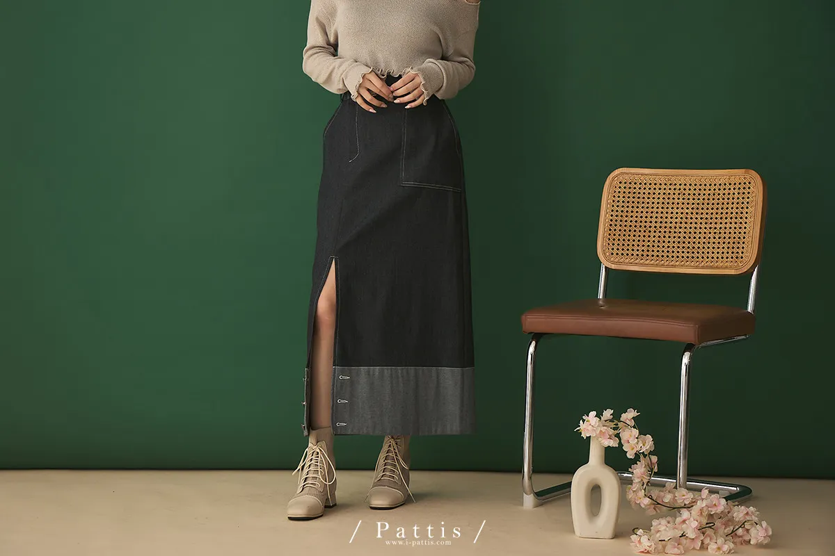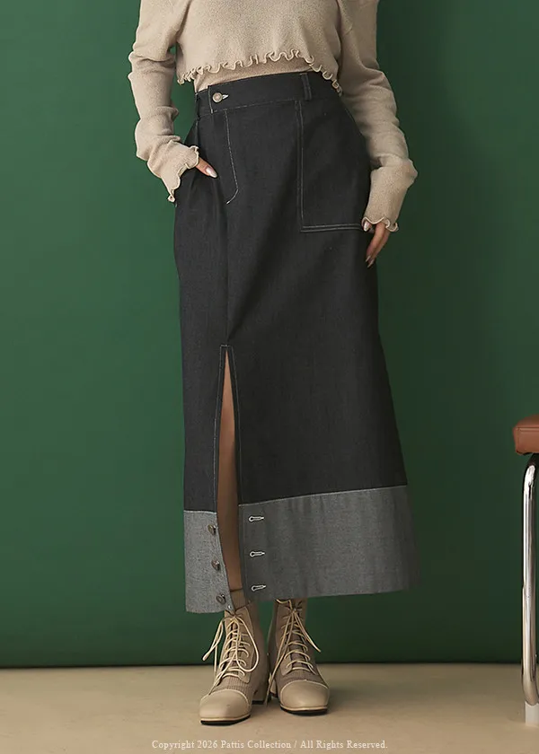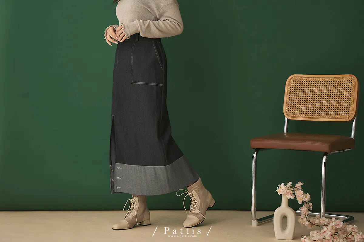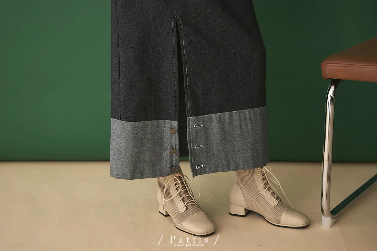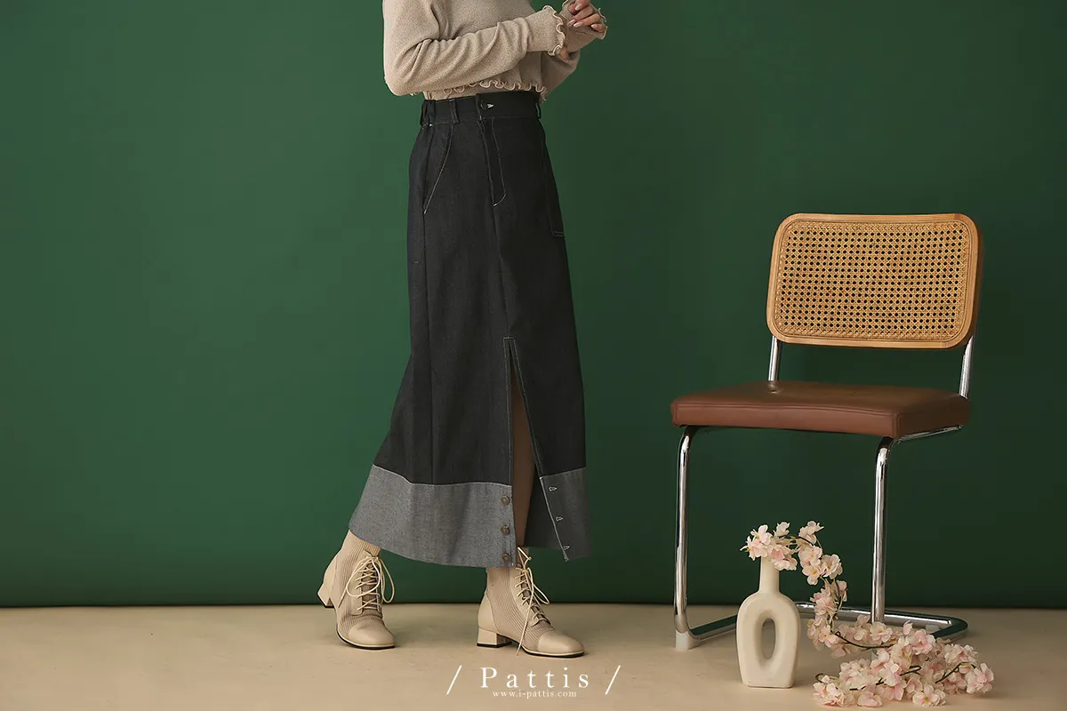 第二間錄音室裡 | 不對稱鈕扣拼接彈性設計長裙(丹寧藍)