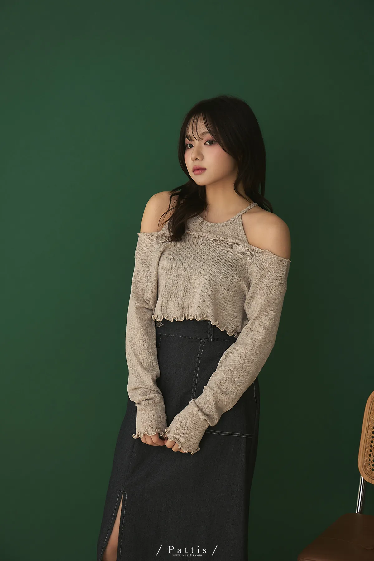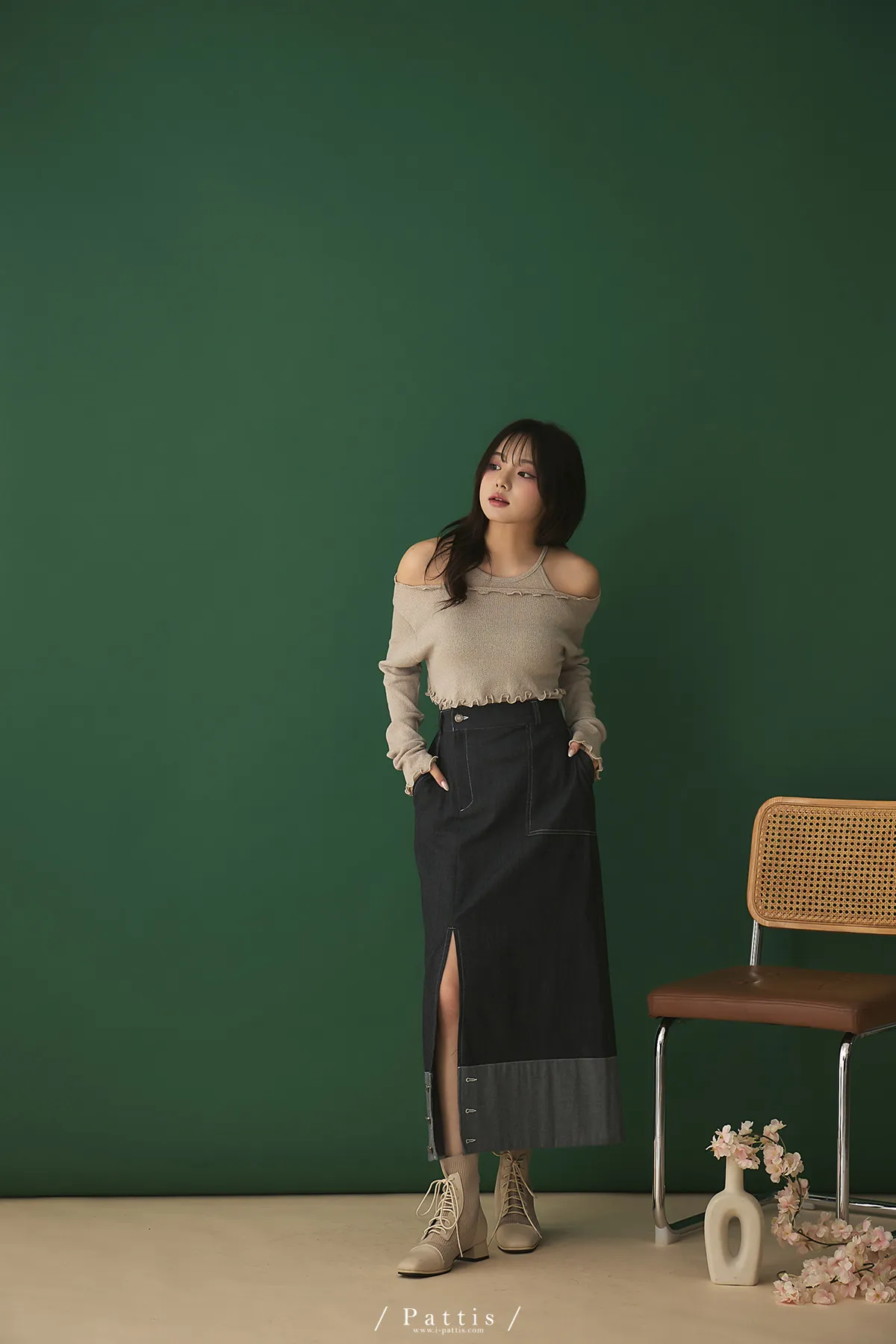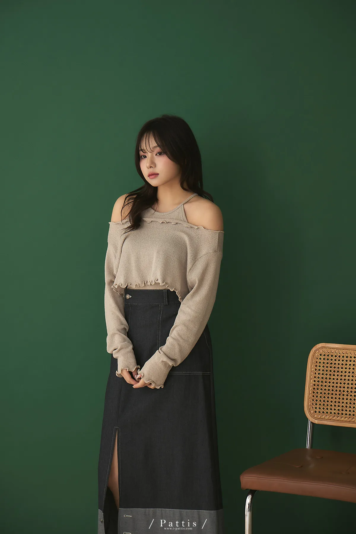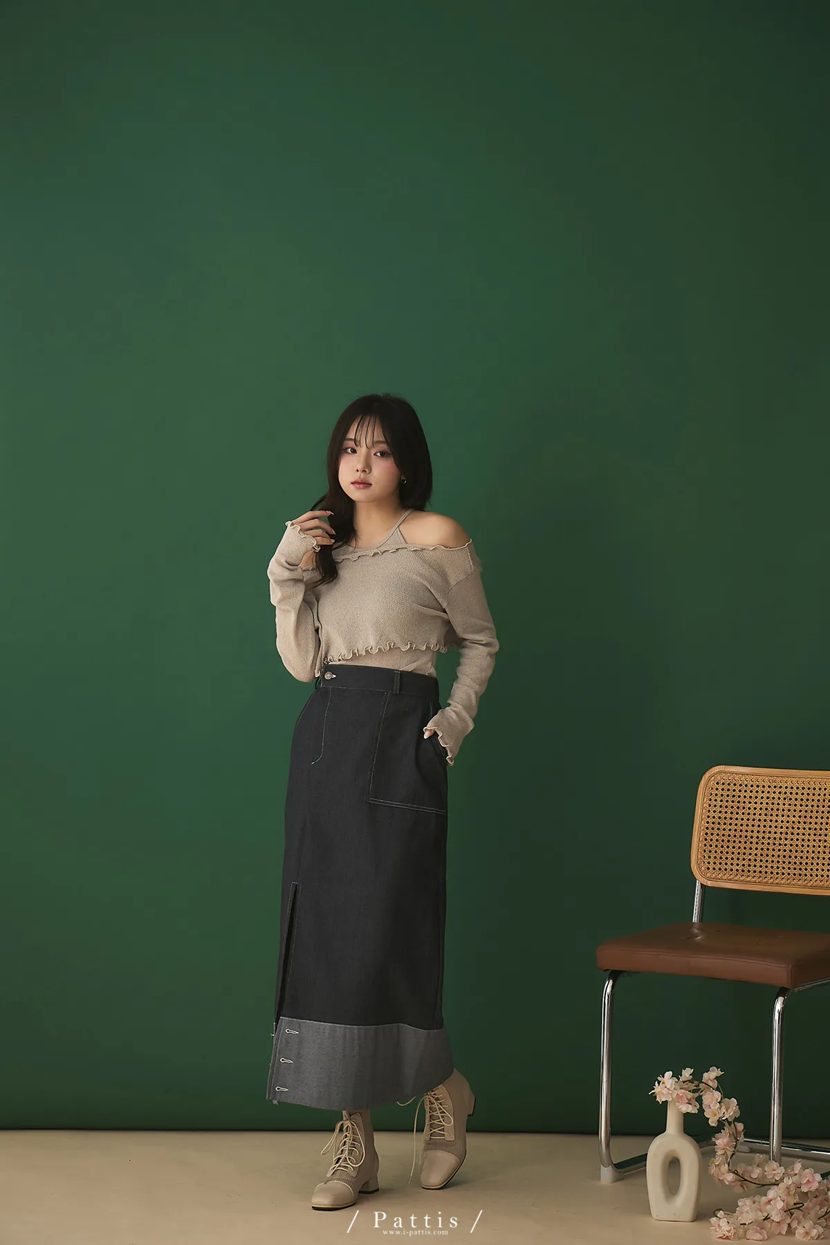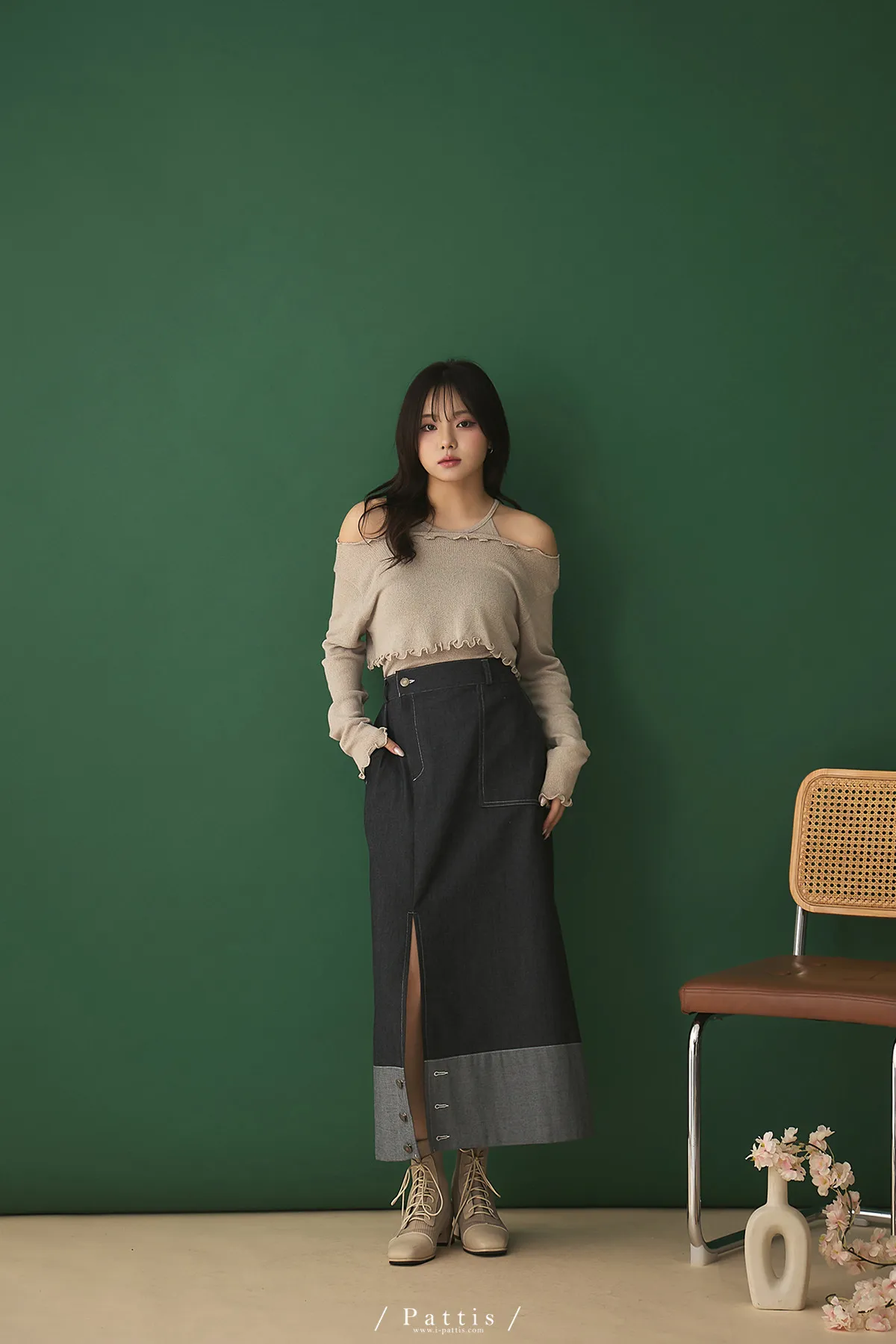 第二間錄音室裡 | 不對稱鈕扣拼接彈性設計長裙(丹寧藍)