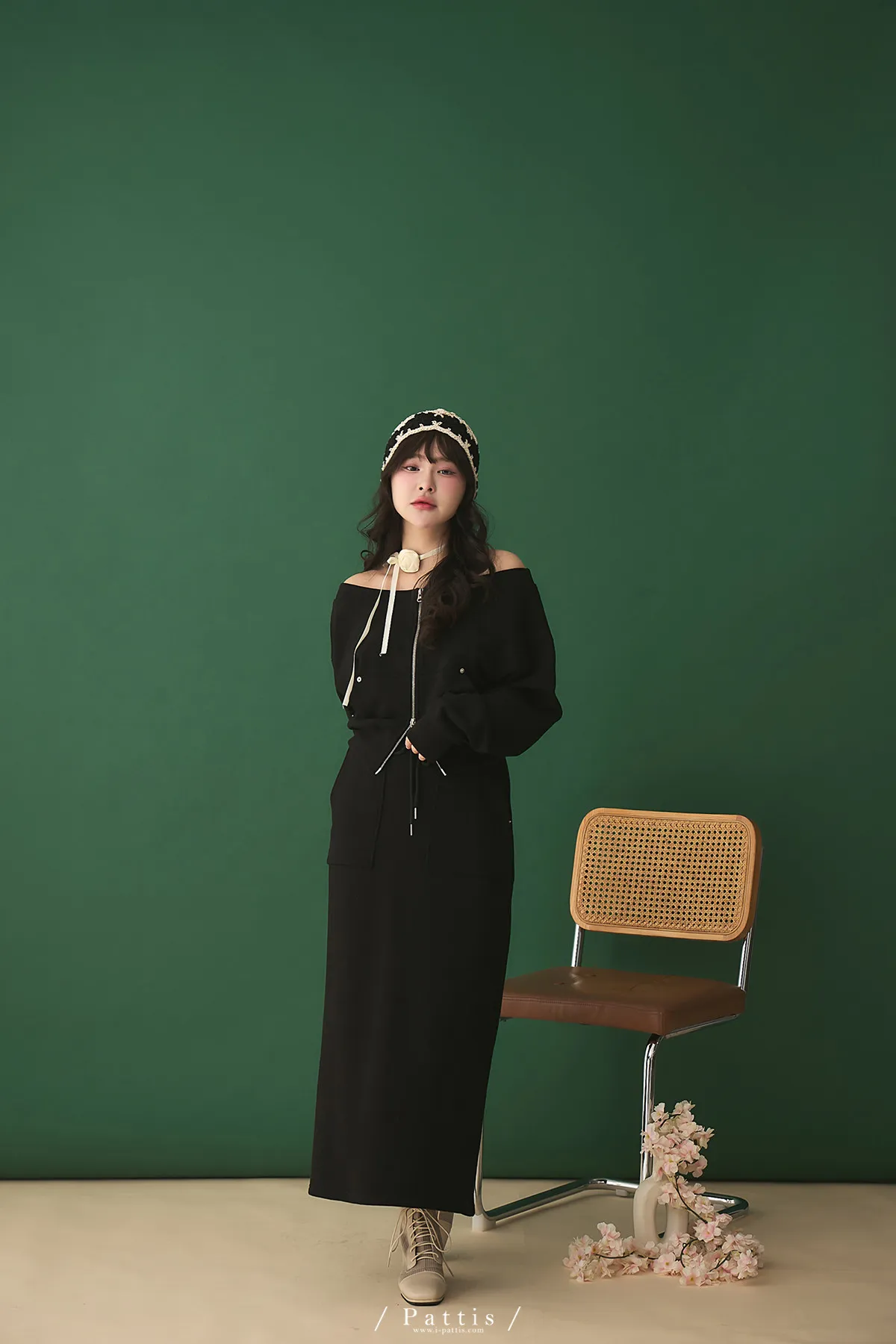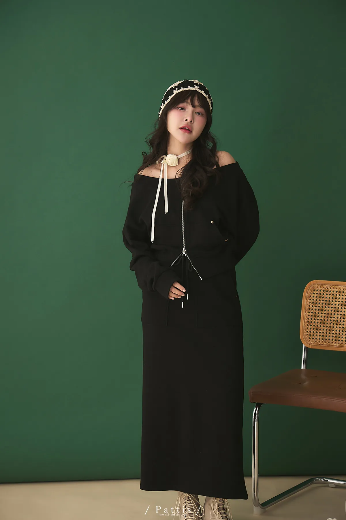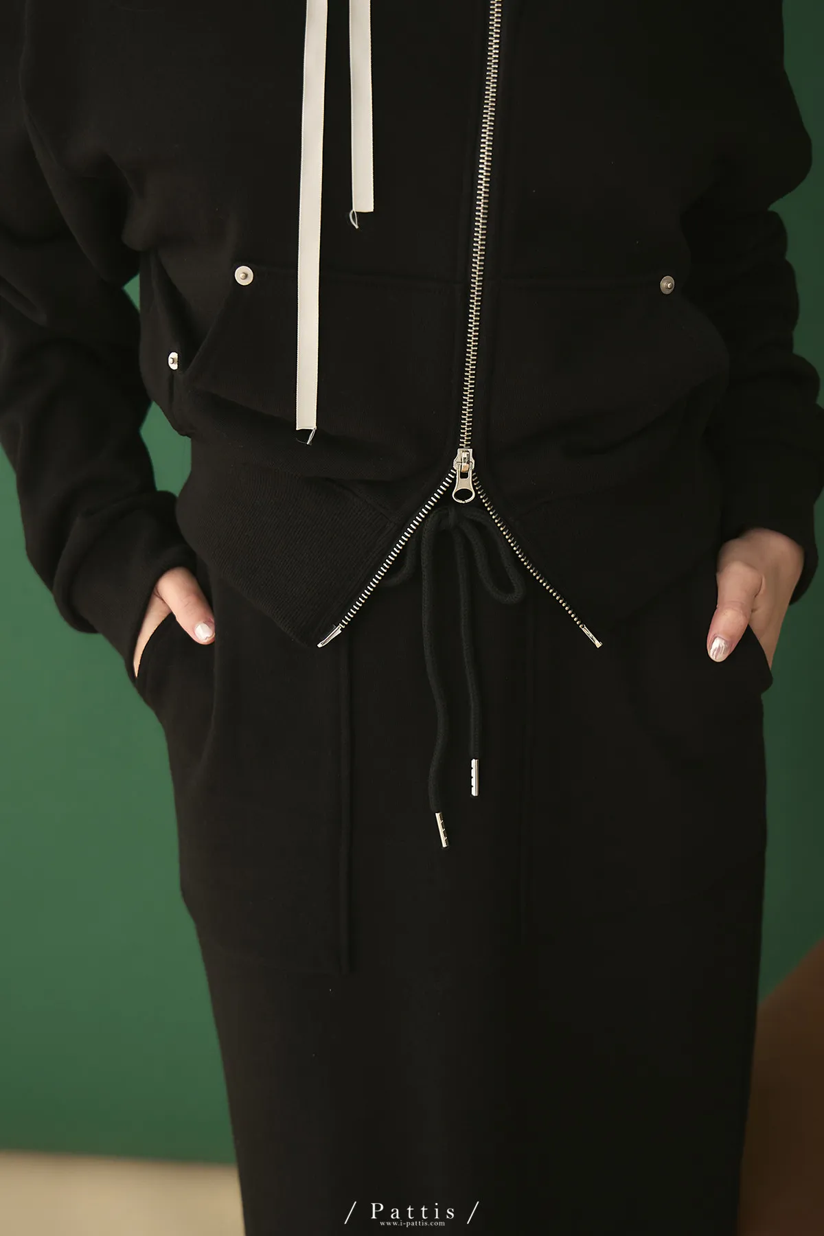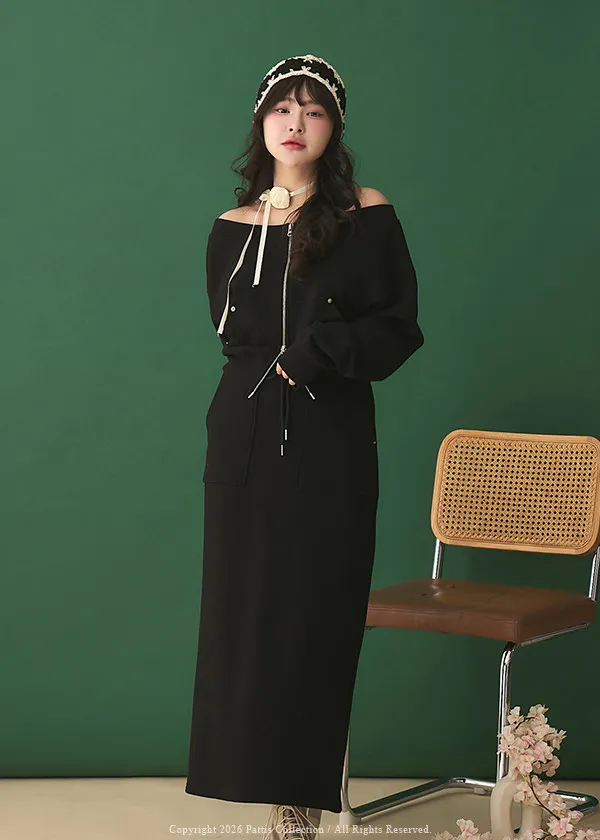 類似隱喻 | 2way雙頭拉鍊一字領外套+開叉長裙set(黑)