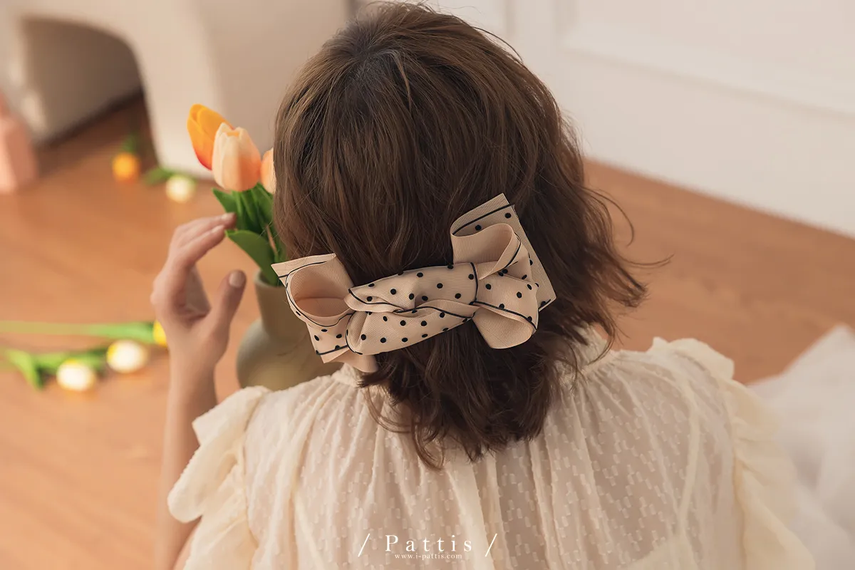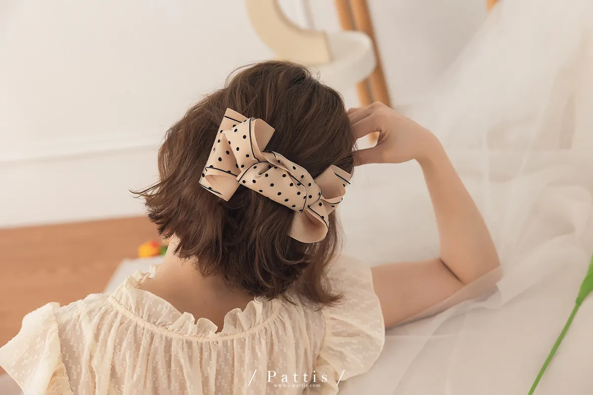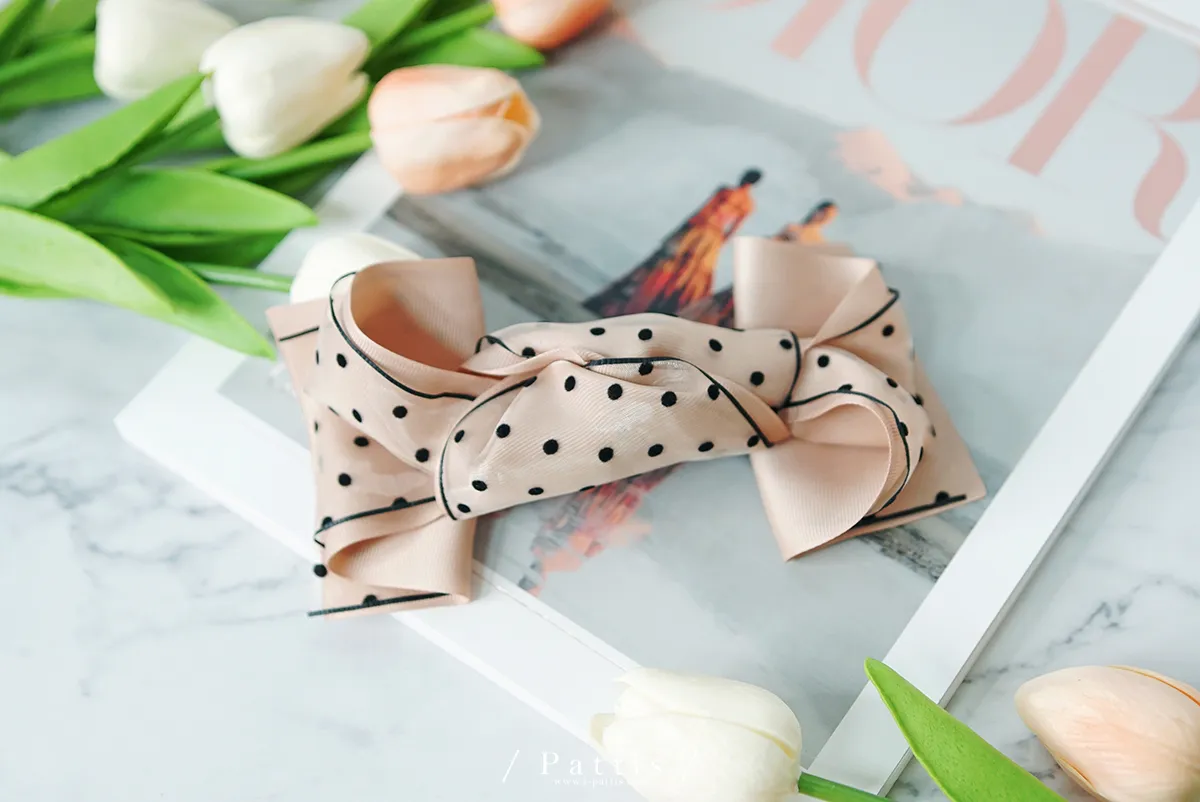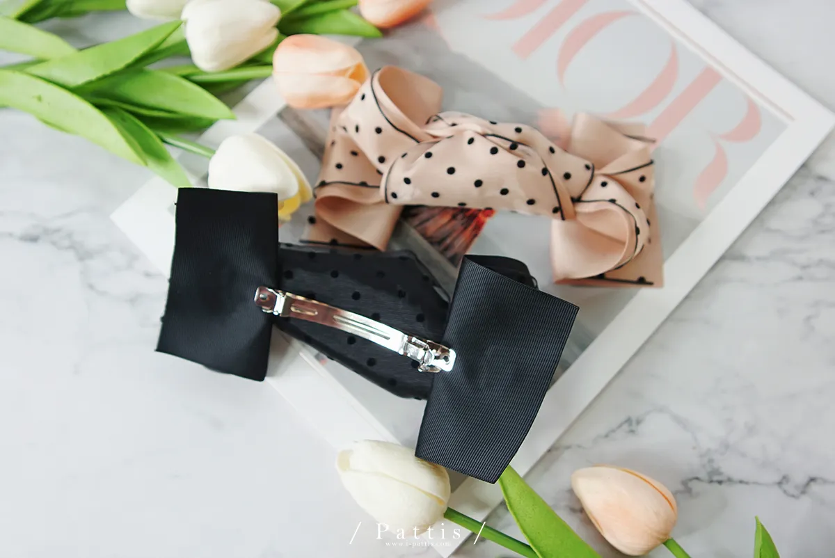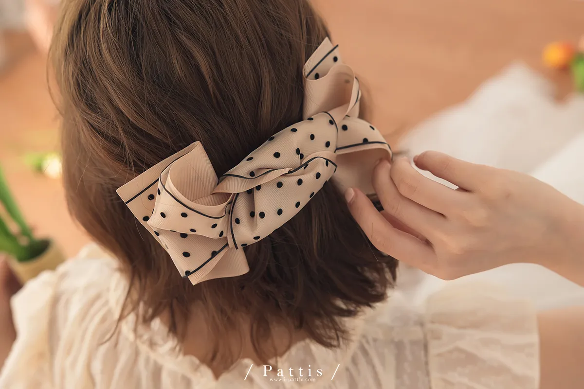 點點立體翻摺大蝴蝶結髮夾(米杏/黑)