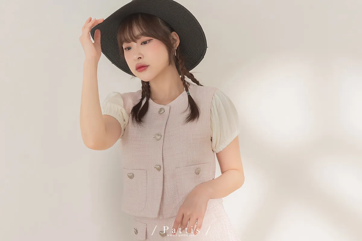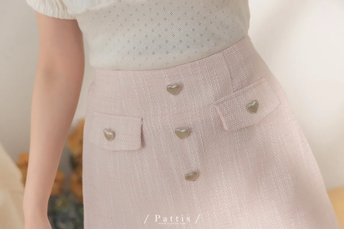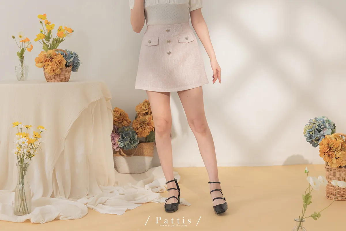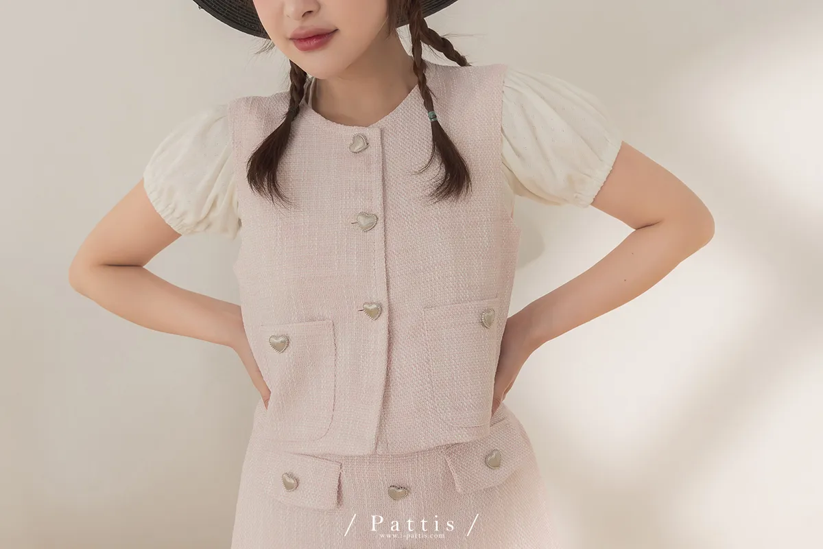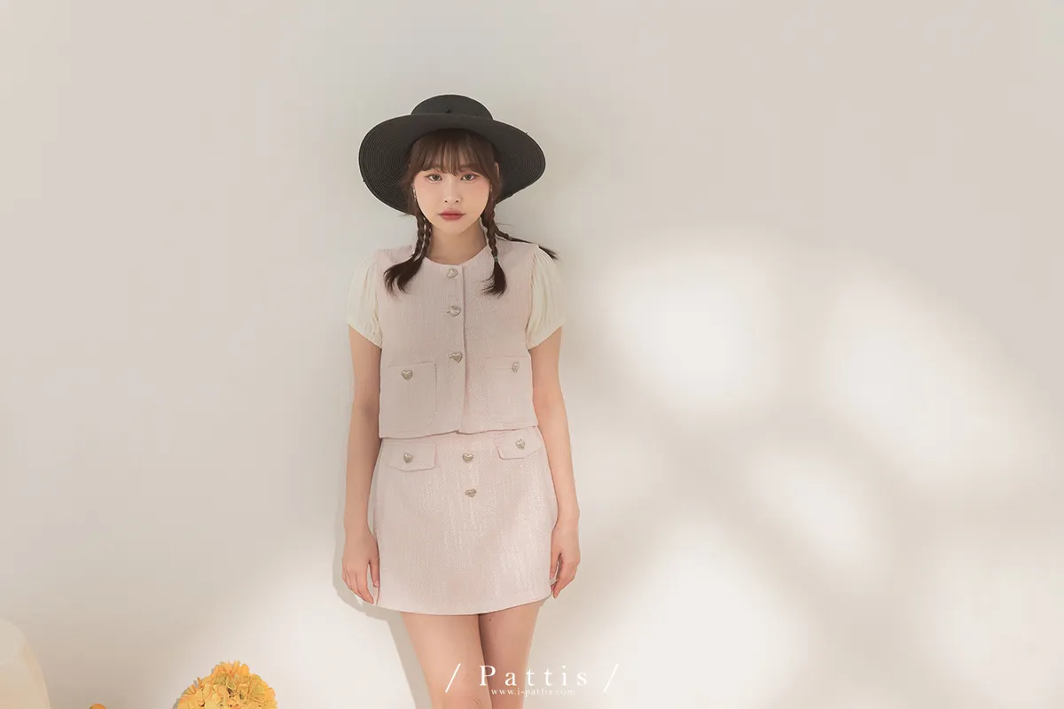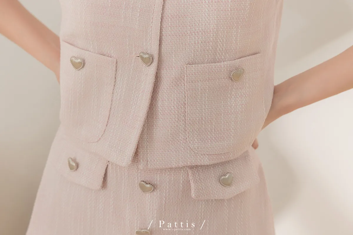 大人味糖果盒 | 銀色愛心釦小香風口袋背心+短褲裙set(粉)