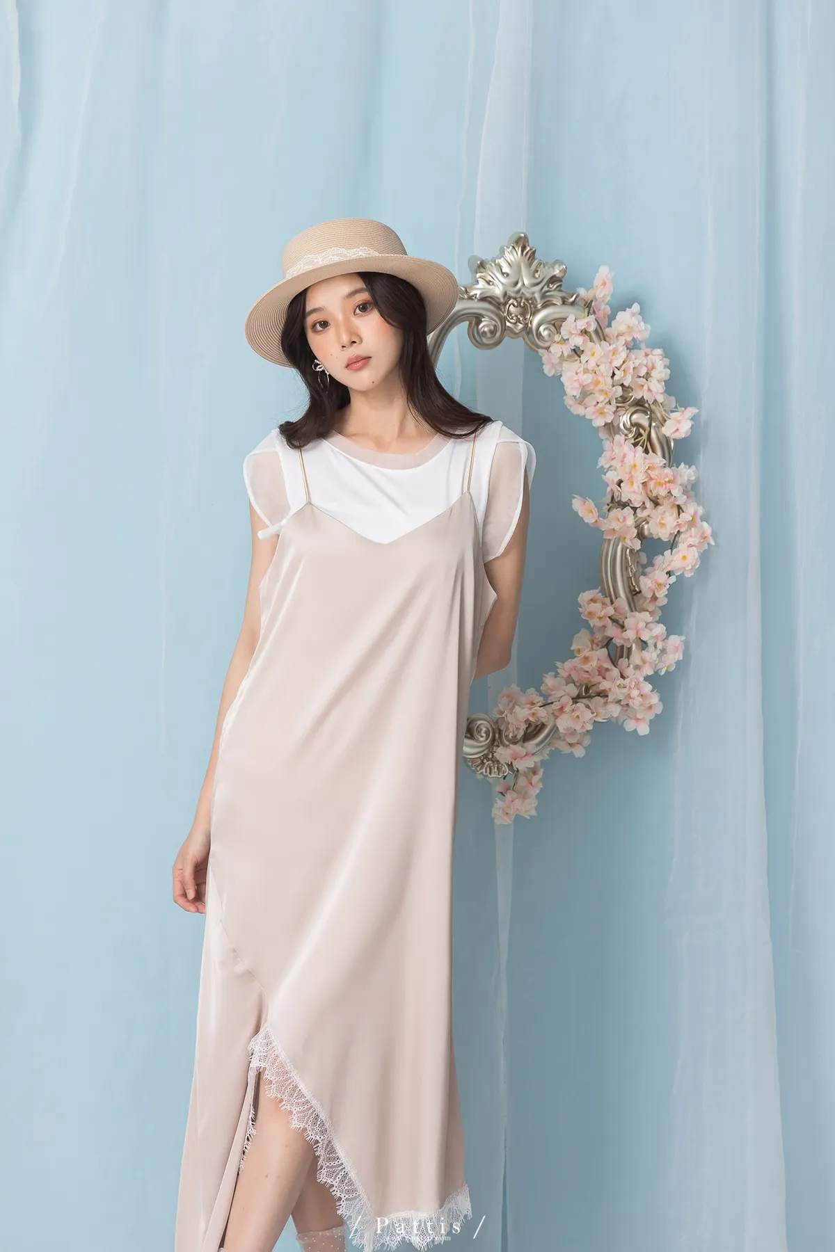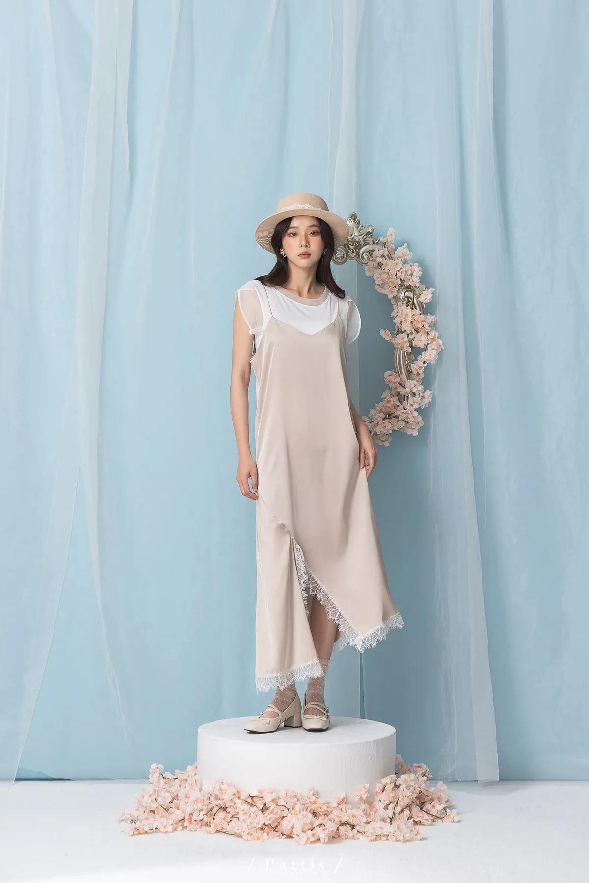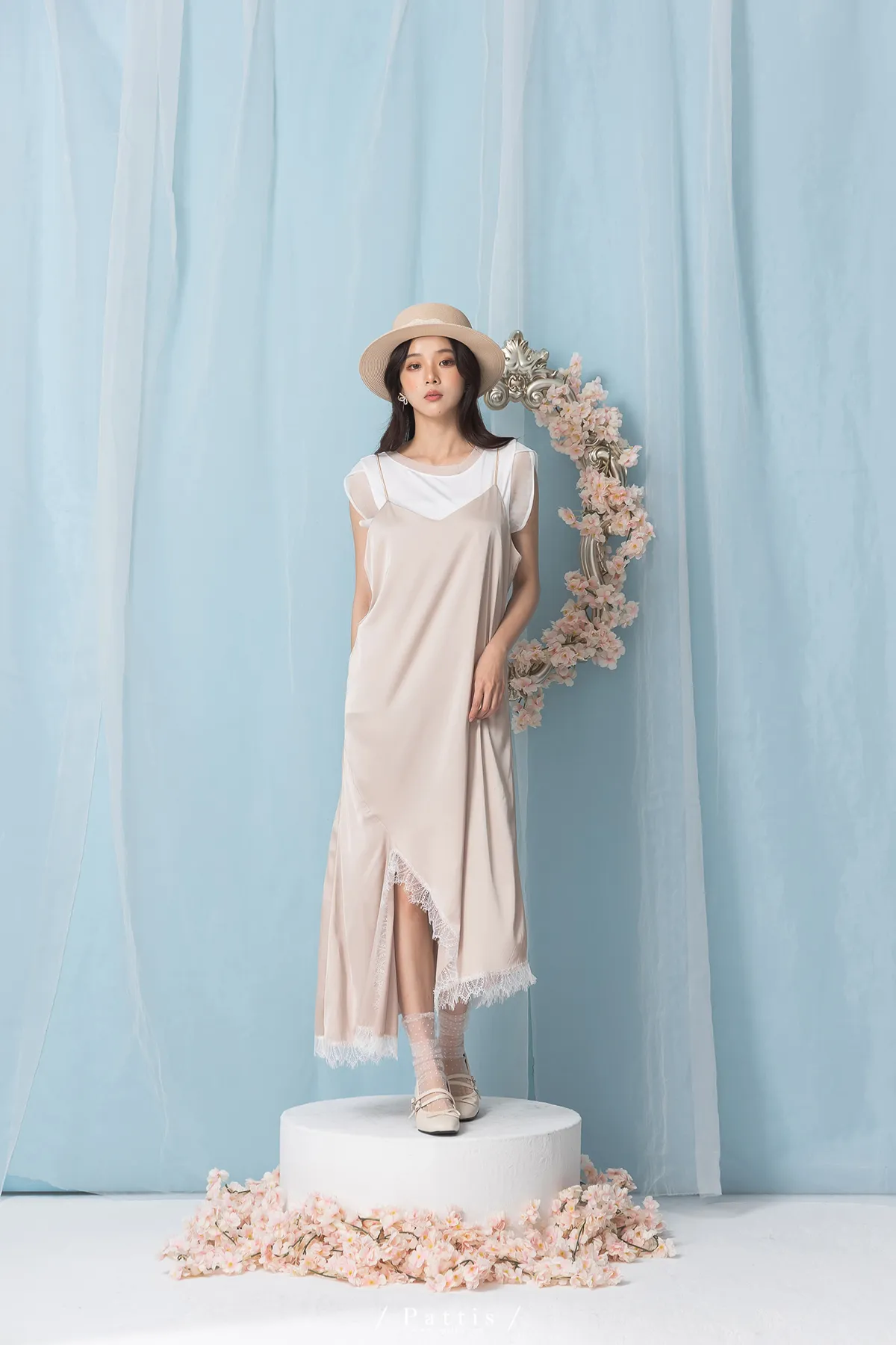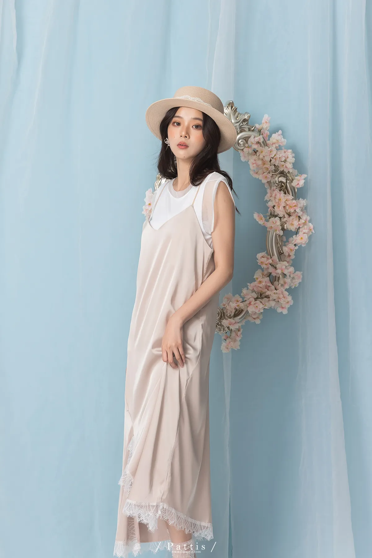 (現貨) 蜜糖夢境 | 滑布拼接蕾絲吊帶洋裝(米杏)