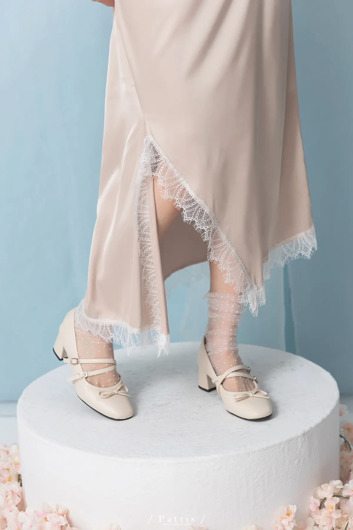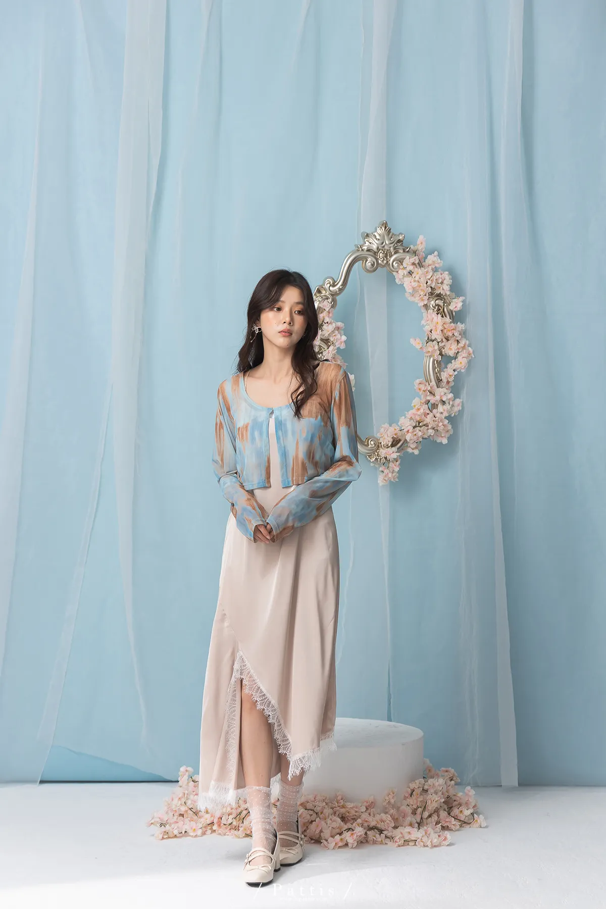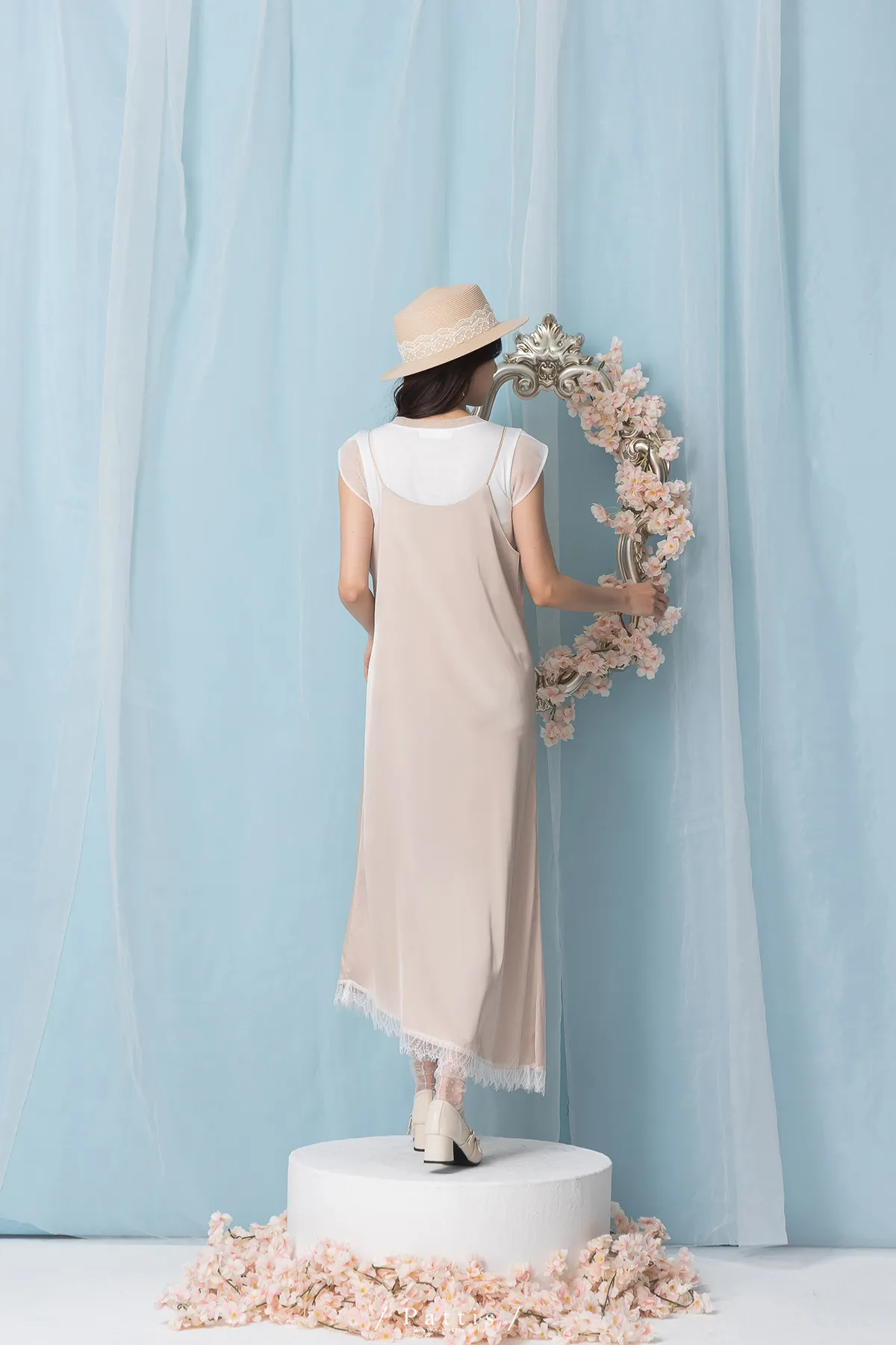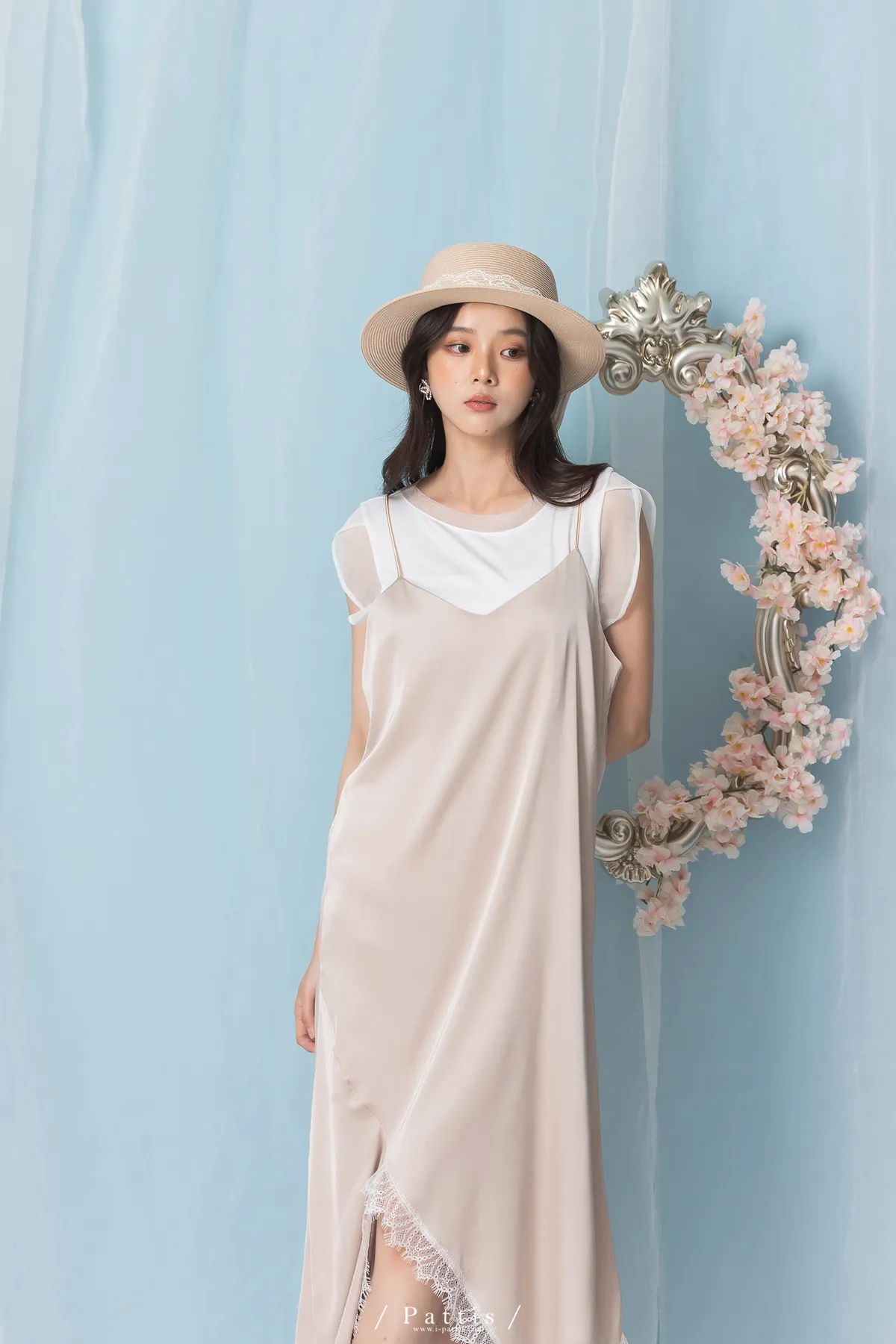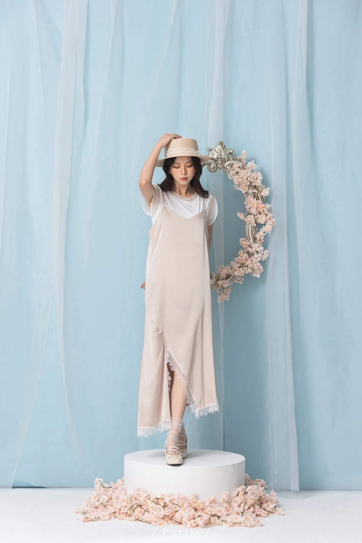 (現貨) 蜜糖夢境 | 滑布拼接蕾絲吊帶洋裝(米杏)