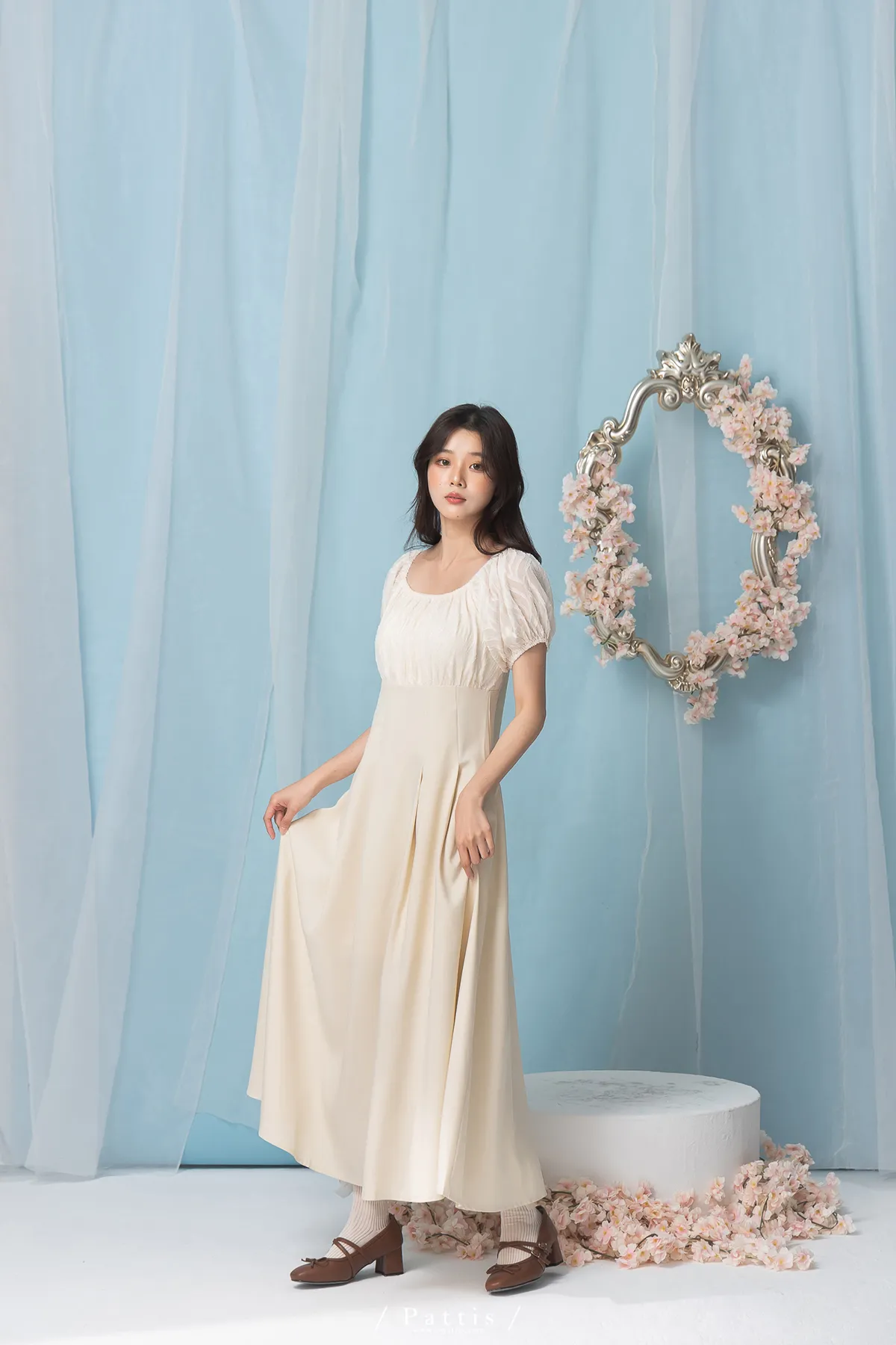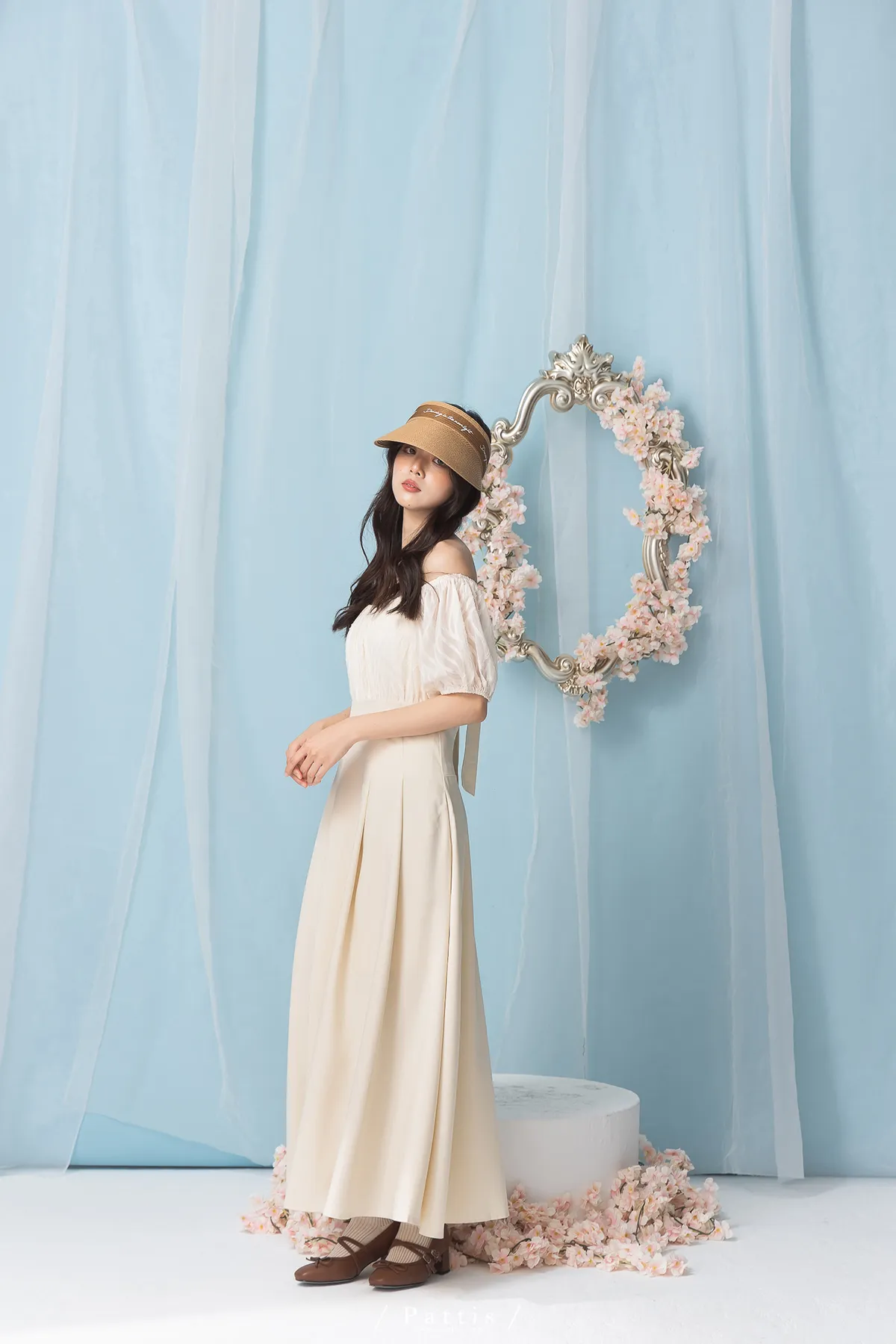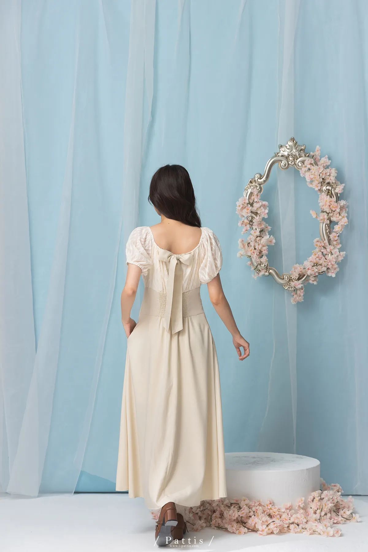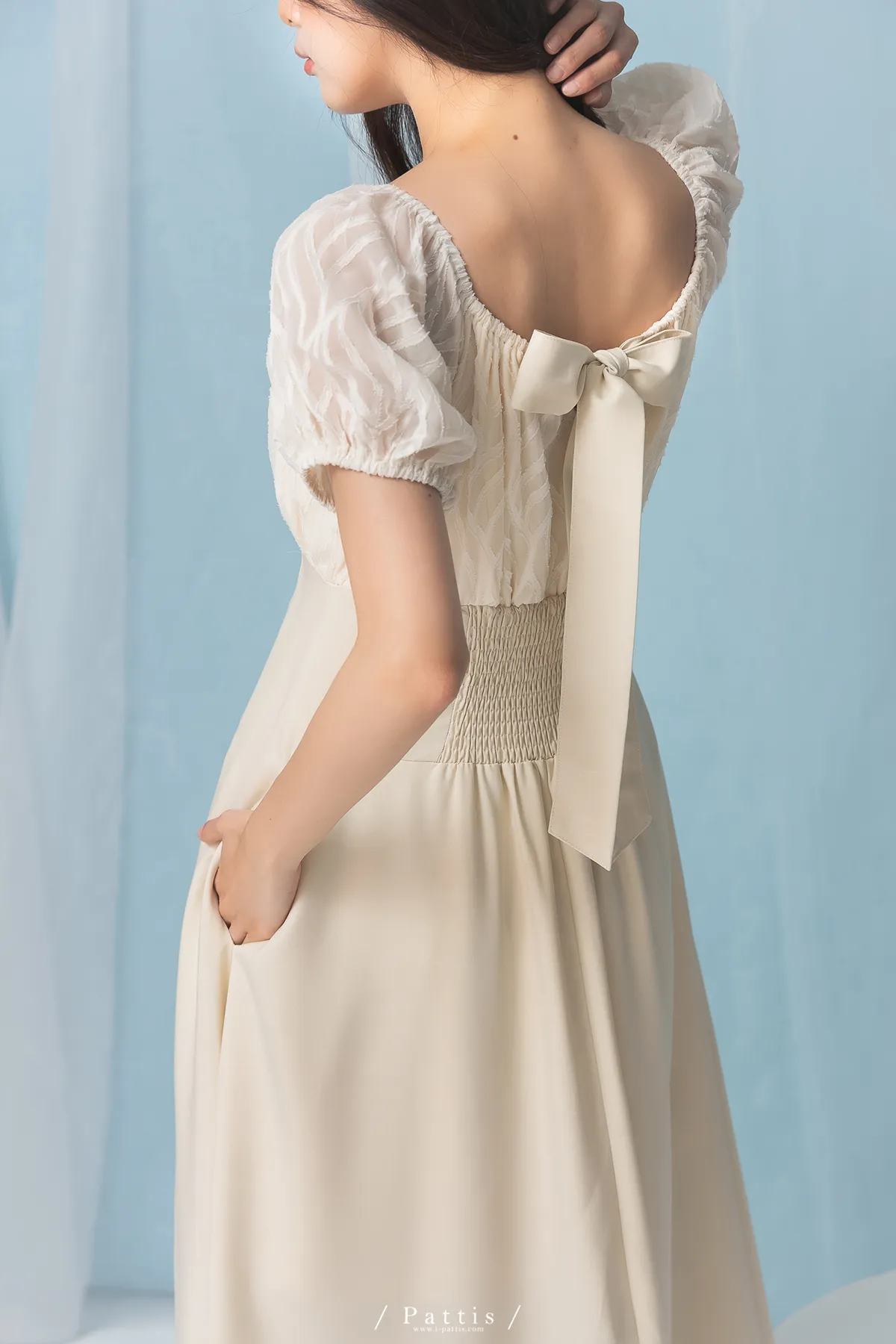 (現貨) 詩人未完結的情書 | 蝴蝶結拼接高腰蓬袖2way洋裝(米杏)