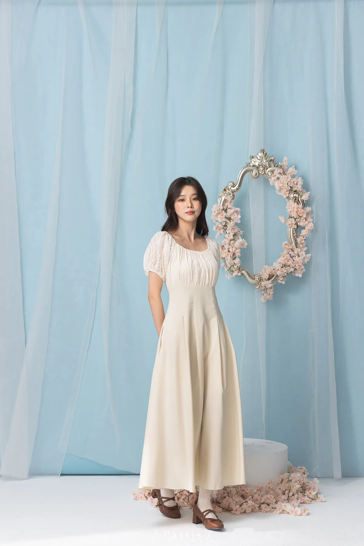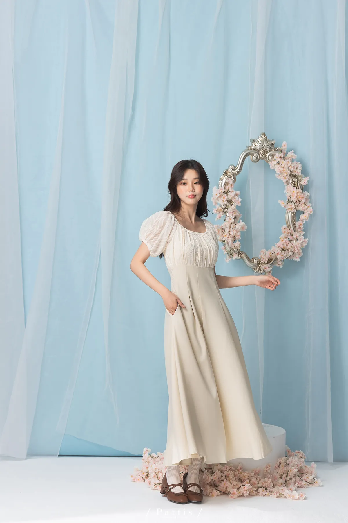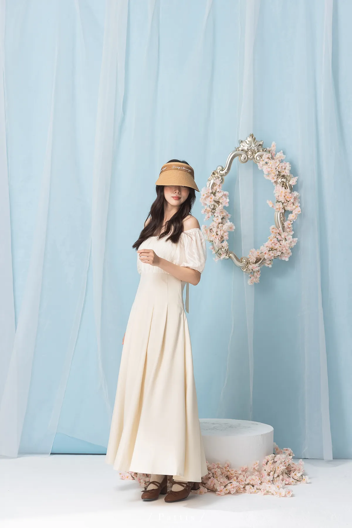 (現貨) 詩人未完結的情書 | 蝴蝶結拼接高腰蓬袖2way洋裝(米杏)