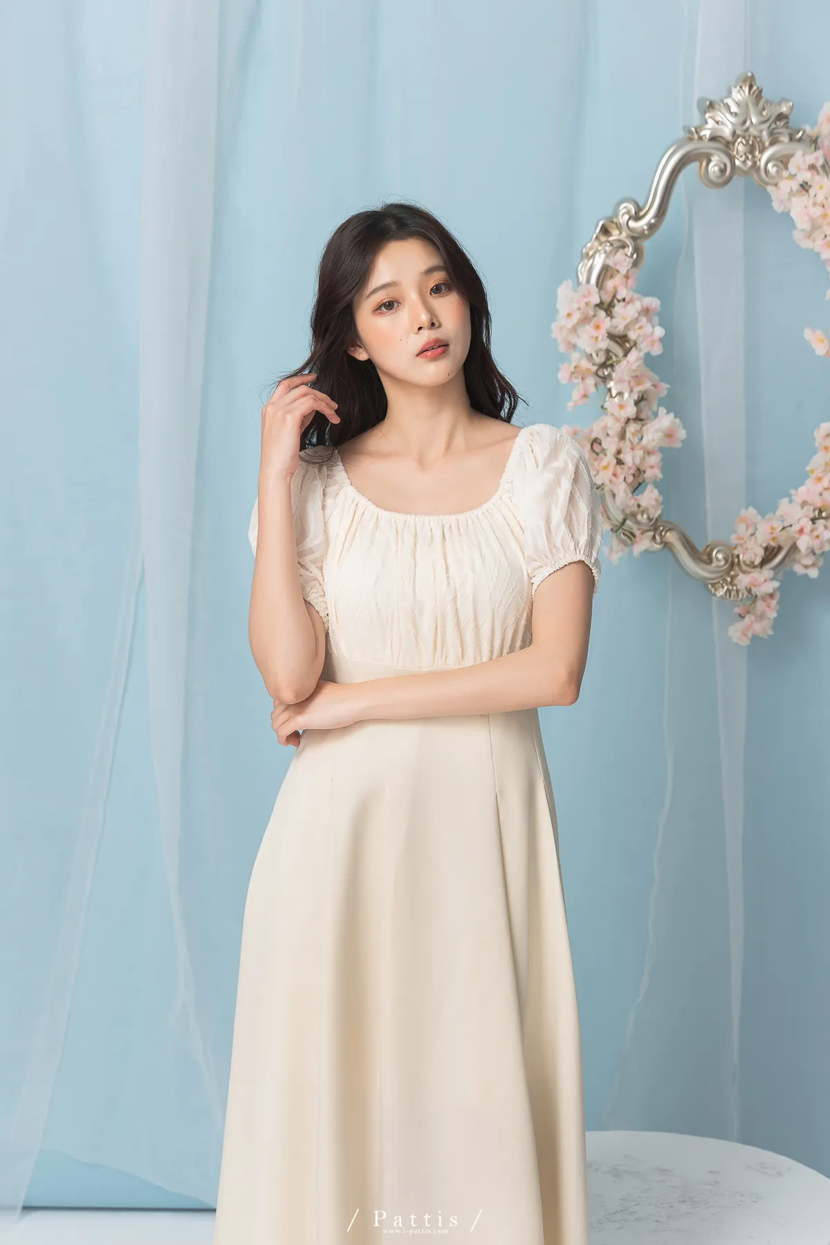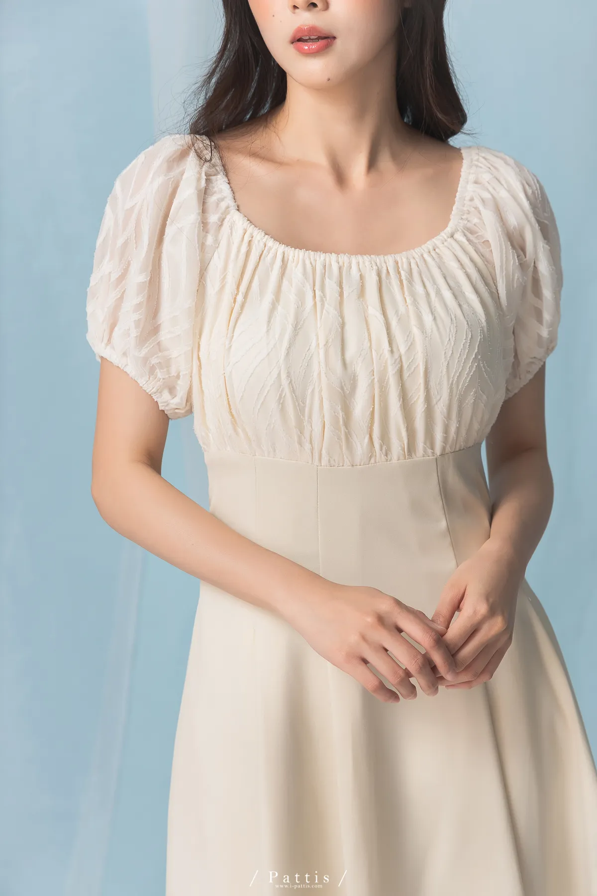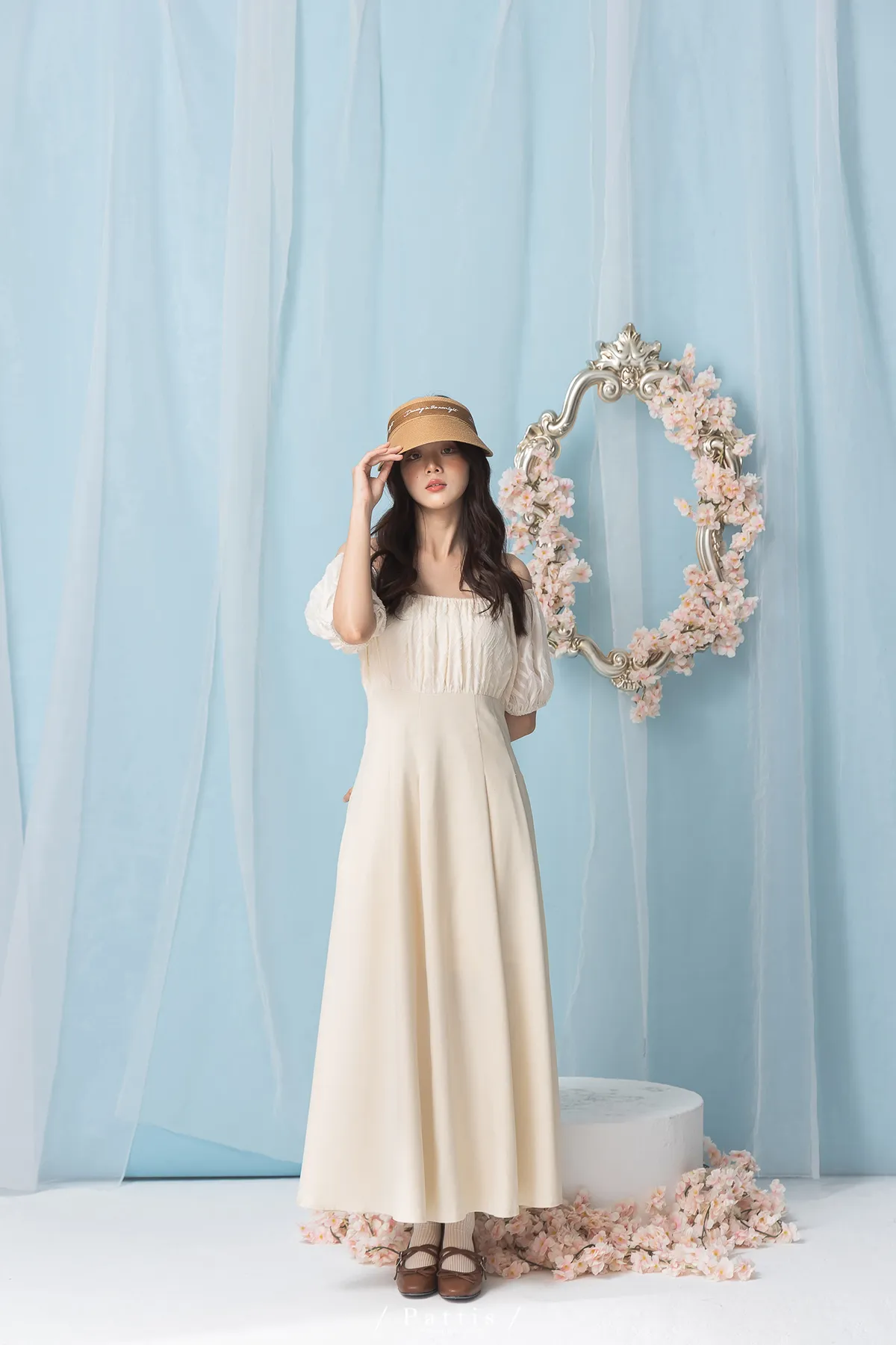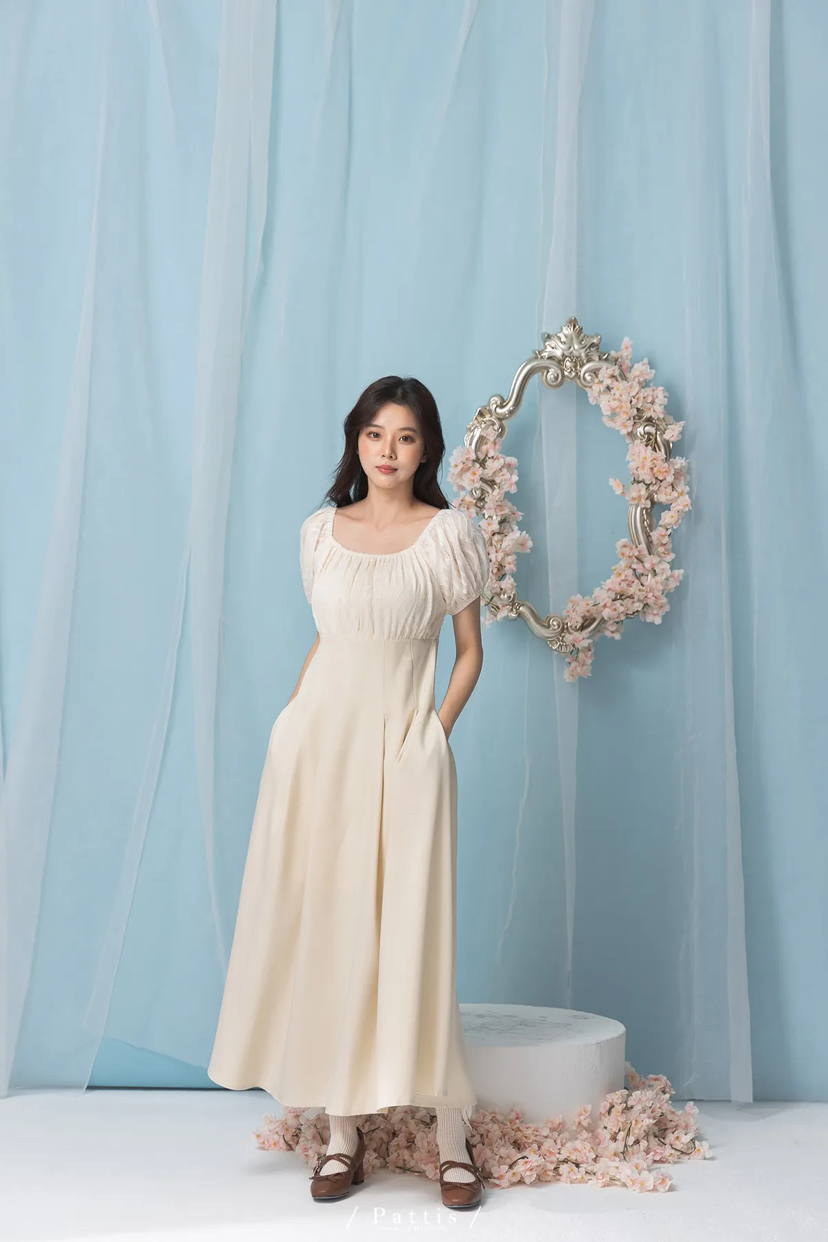 (現貨) 詩人未完結的情書 | 蝴蝶結拼接高腰蓬袖2way洋裝(米杏)