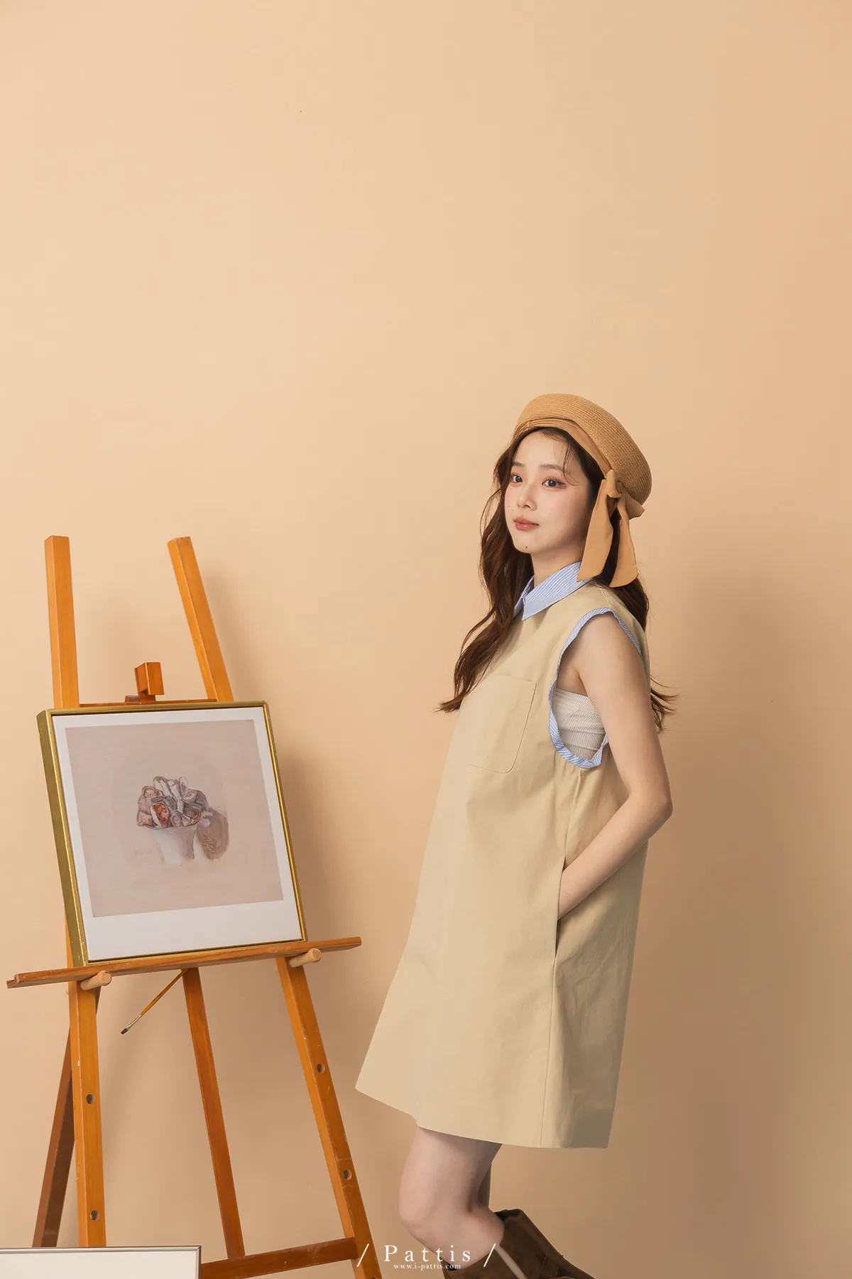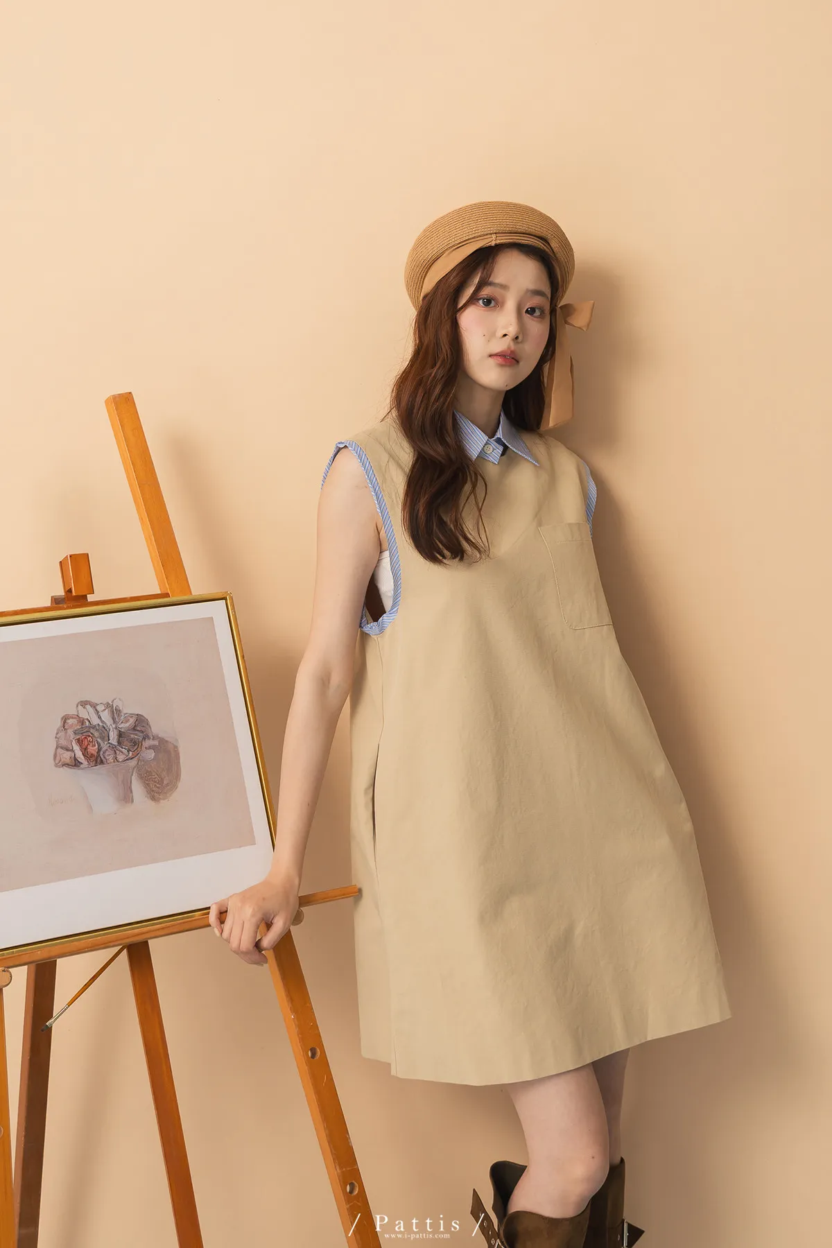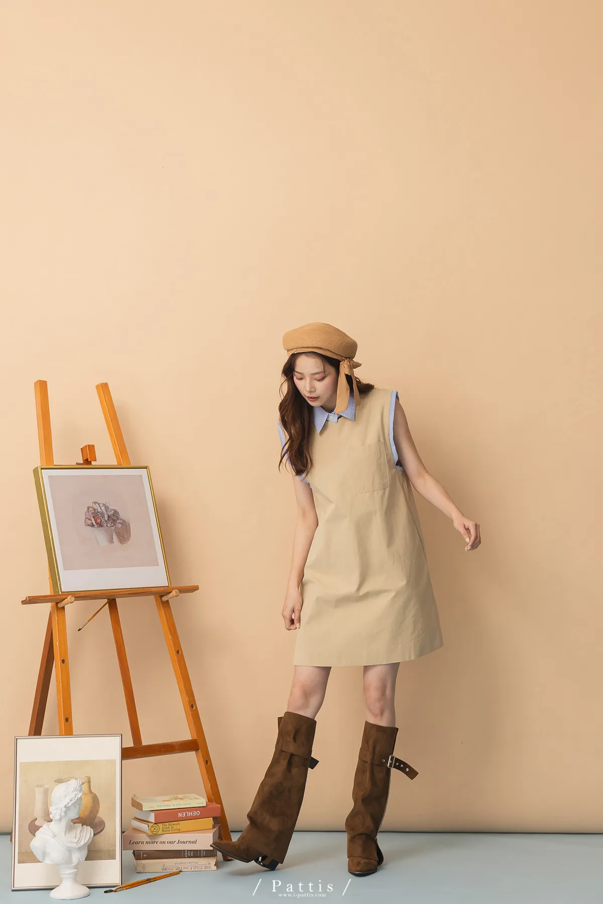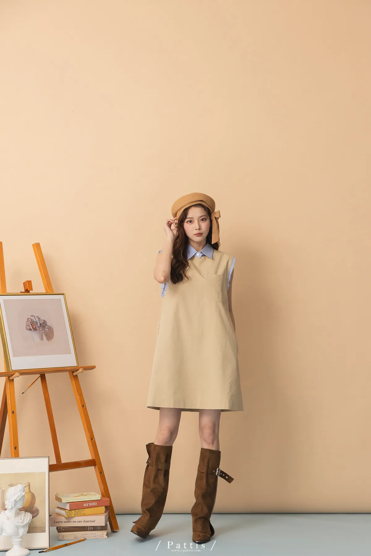世故少女的邏輯病 | Miu感襯衫領拼接雙色短洋裝(卡其杏)
