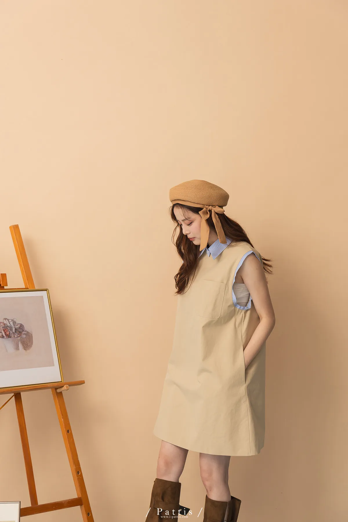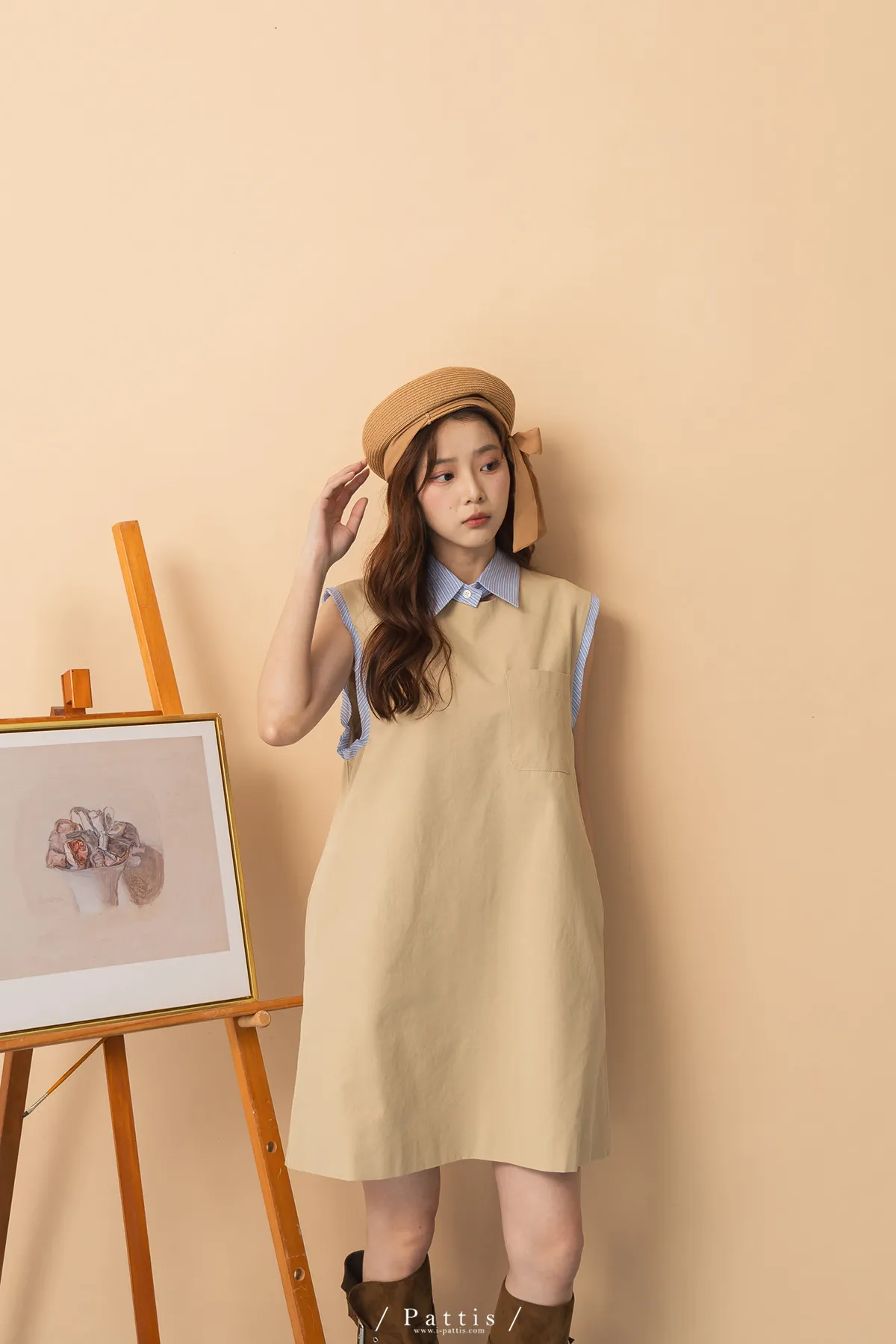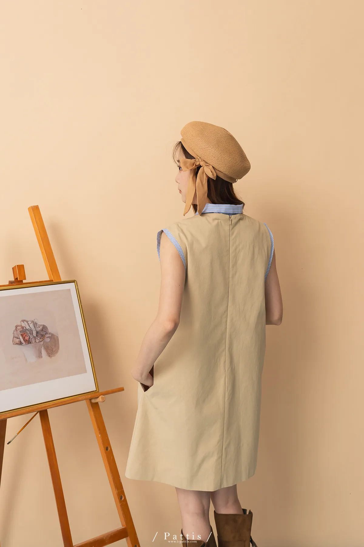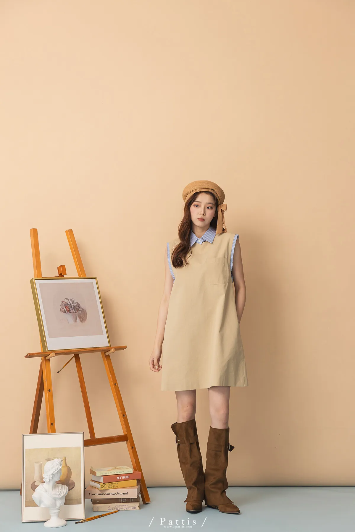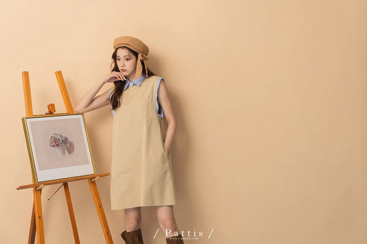 世故少女的邏輯病 | Miu感襯衫領拼接雙色短洋裝(卡其杏)