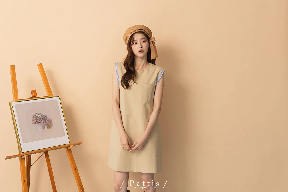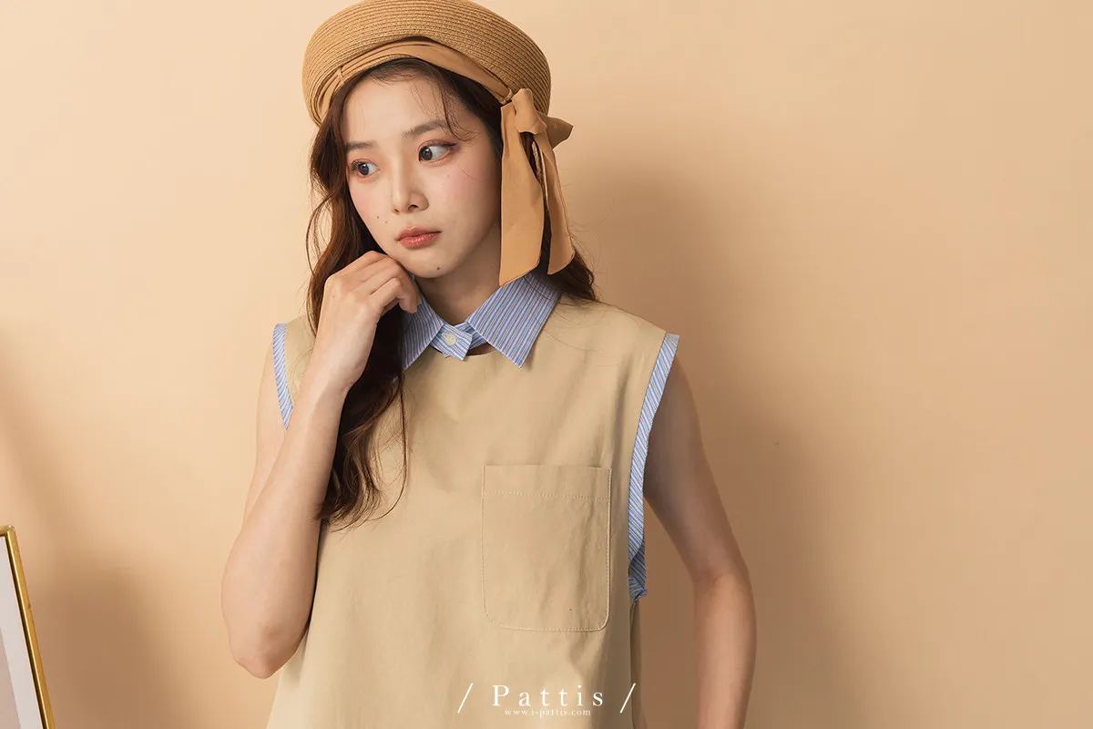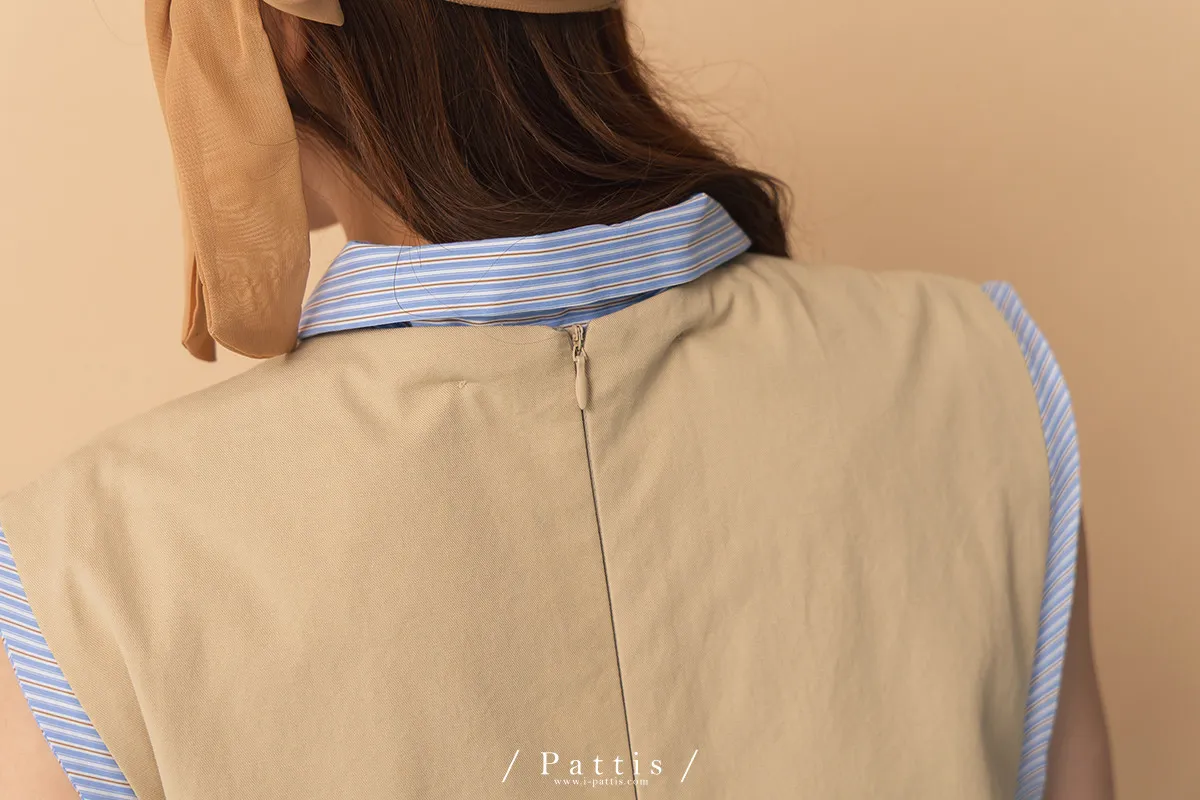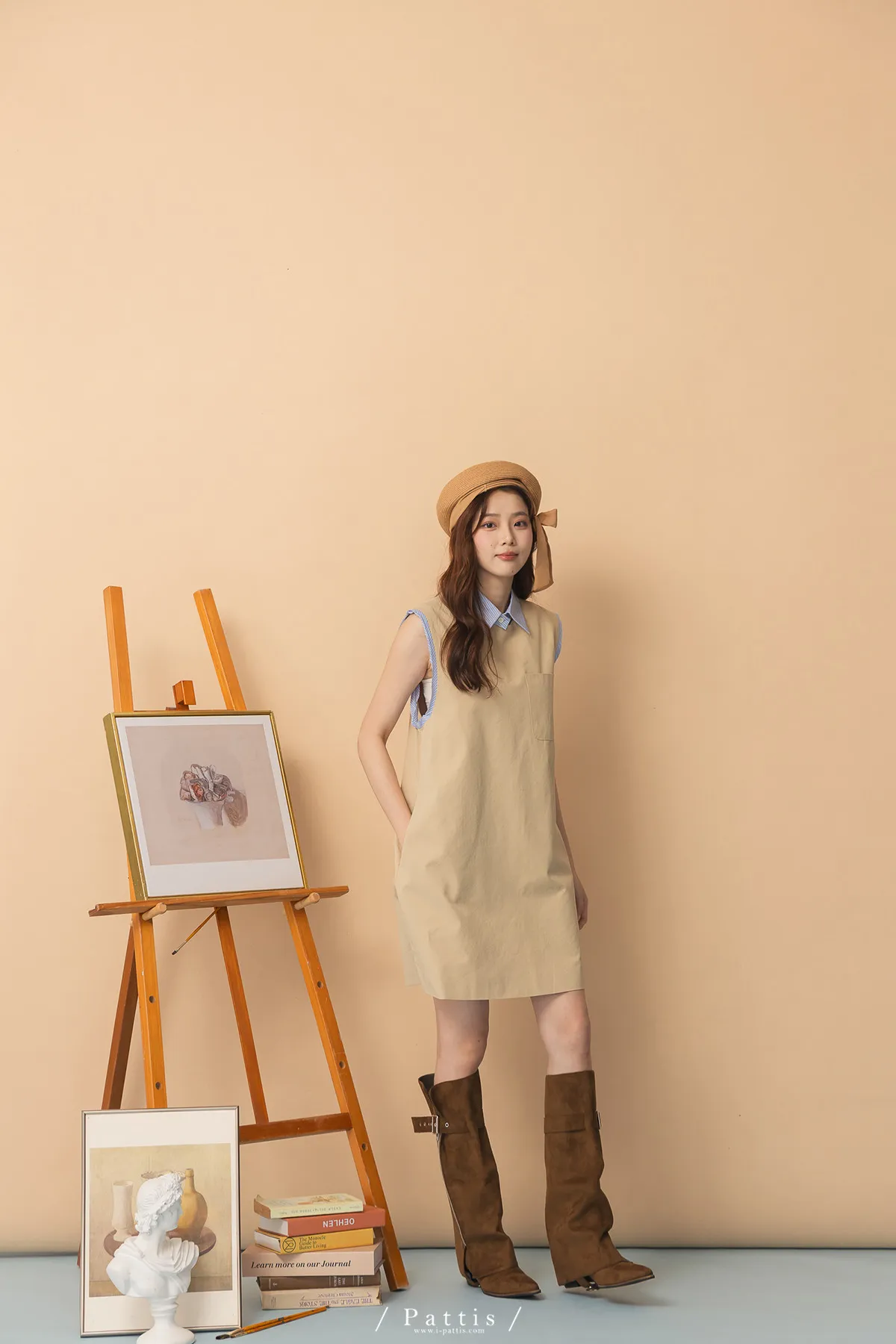 世故少女的邏輯病 | Miu感襯衫領拼接雙色短洋裝(卡其杏)