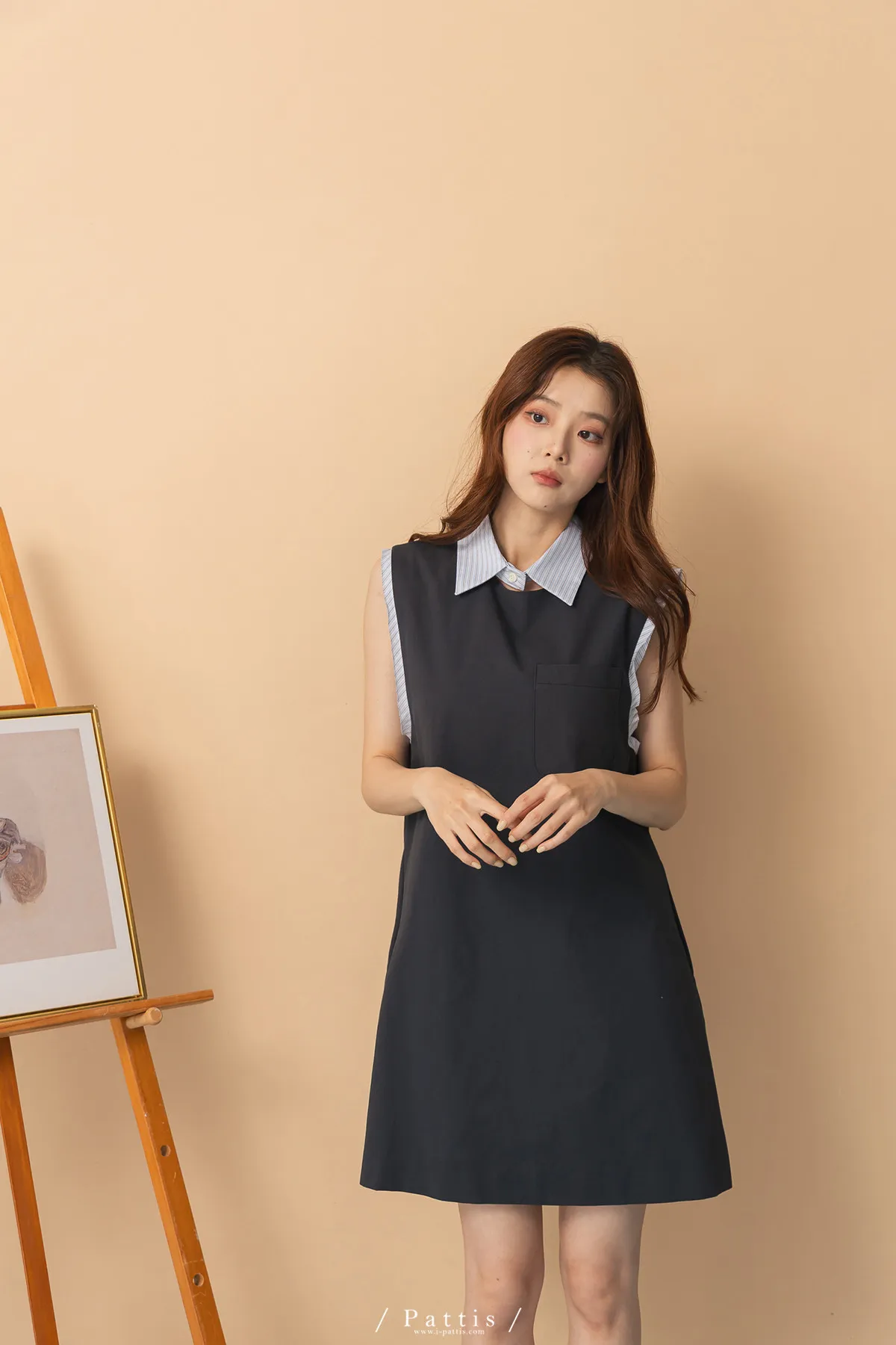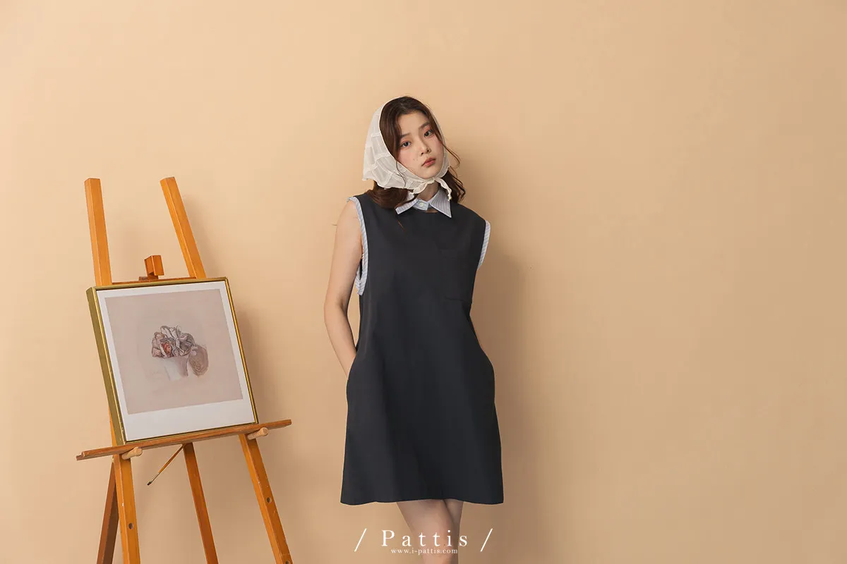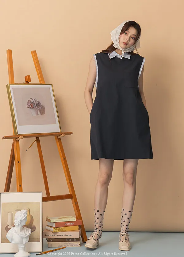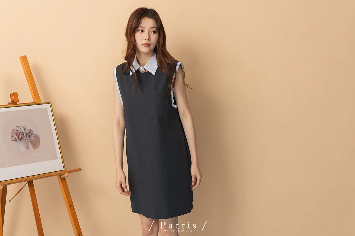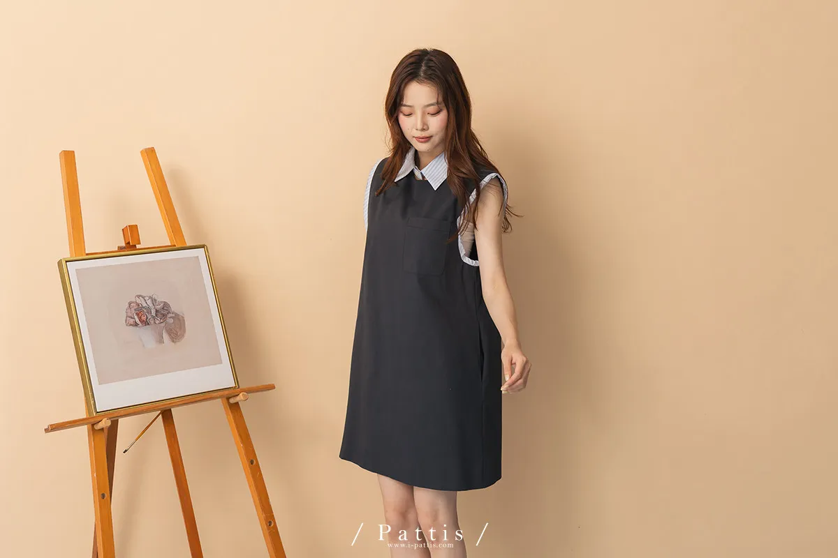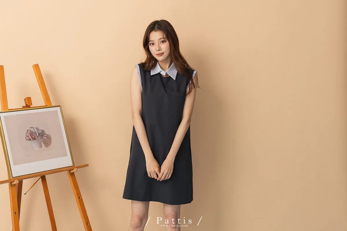 世故少女的邏輯病 | Miu感襯衫領拼接雙色短洋裝(深藍黑)