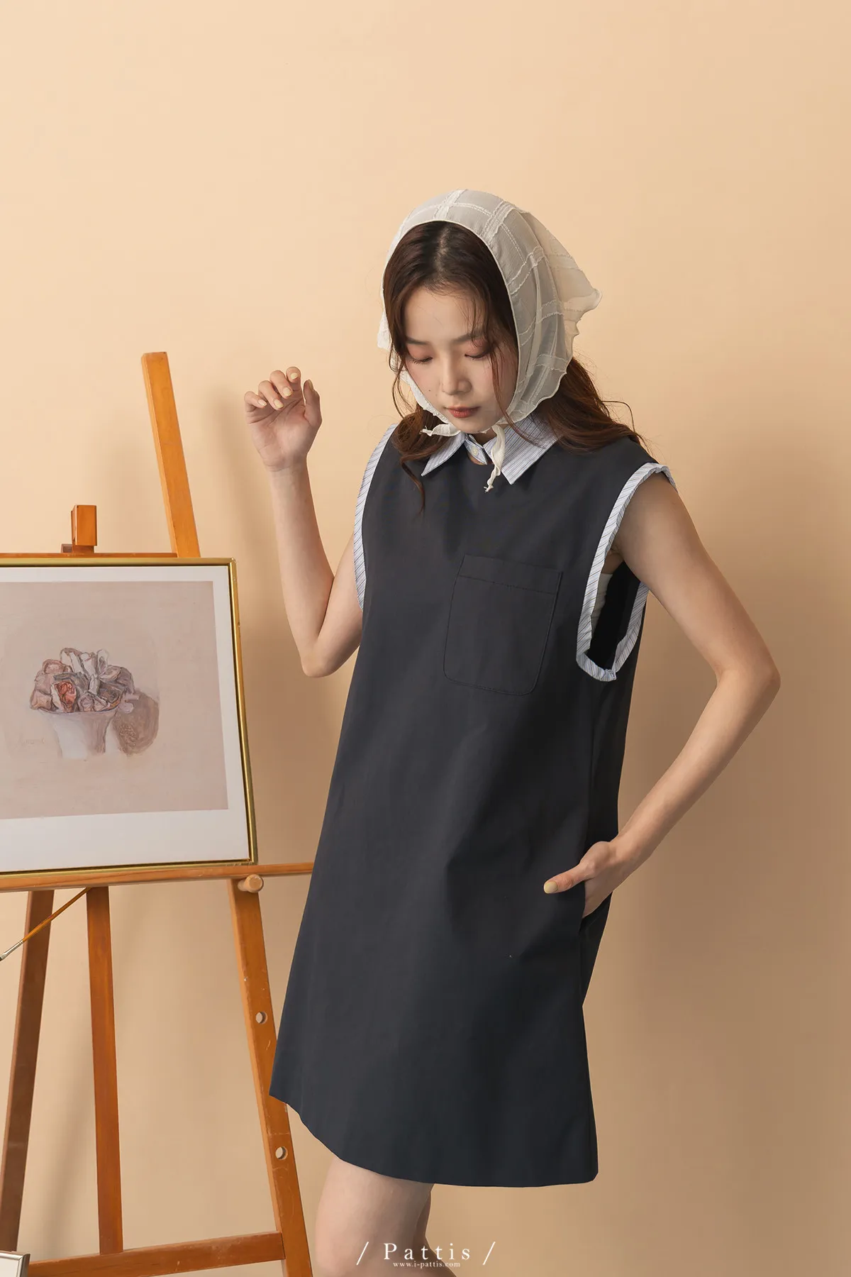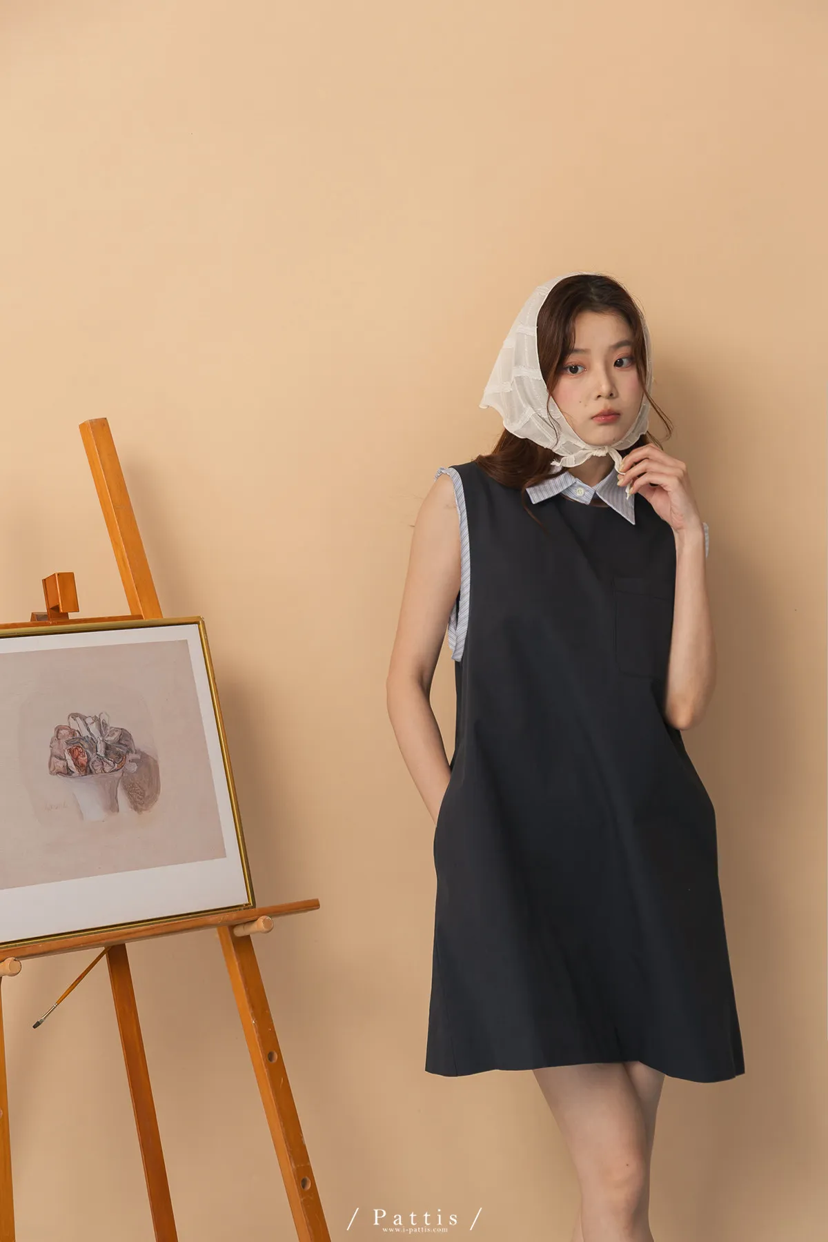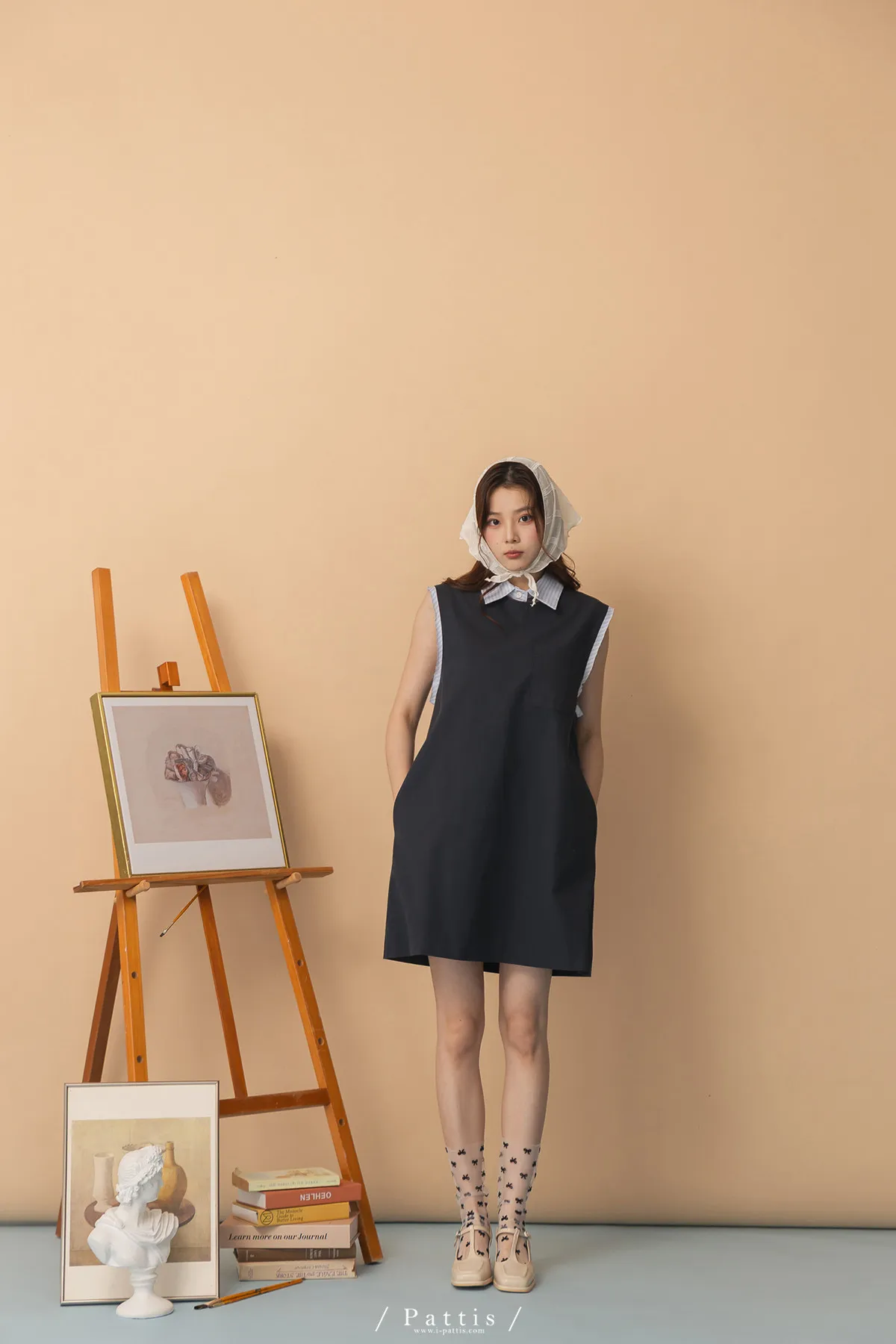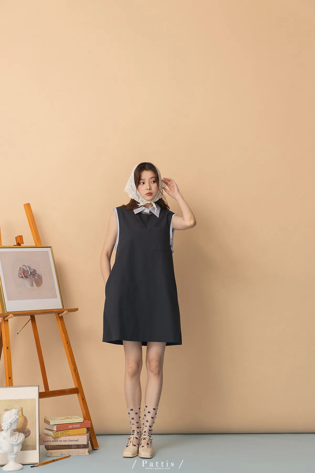 世故少女的邏輯病 | Miu感襯衫領拼接雙色短洋裝(深藍黑)