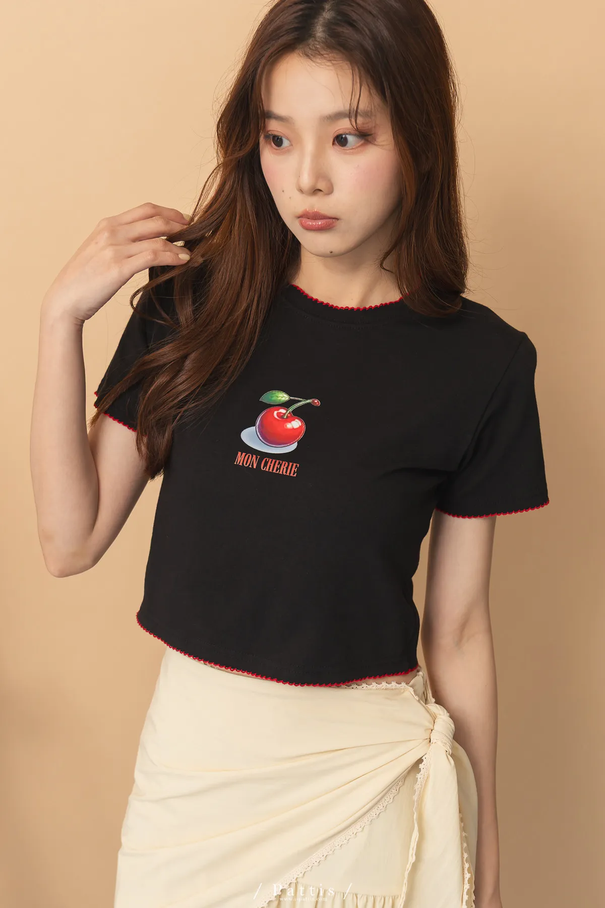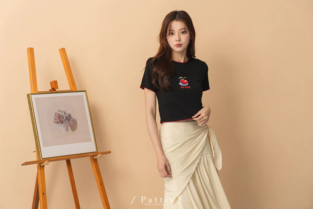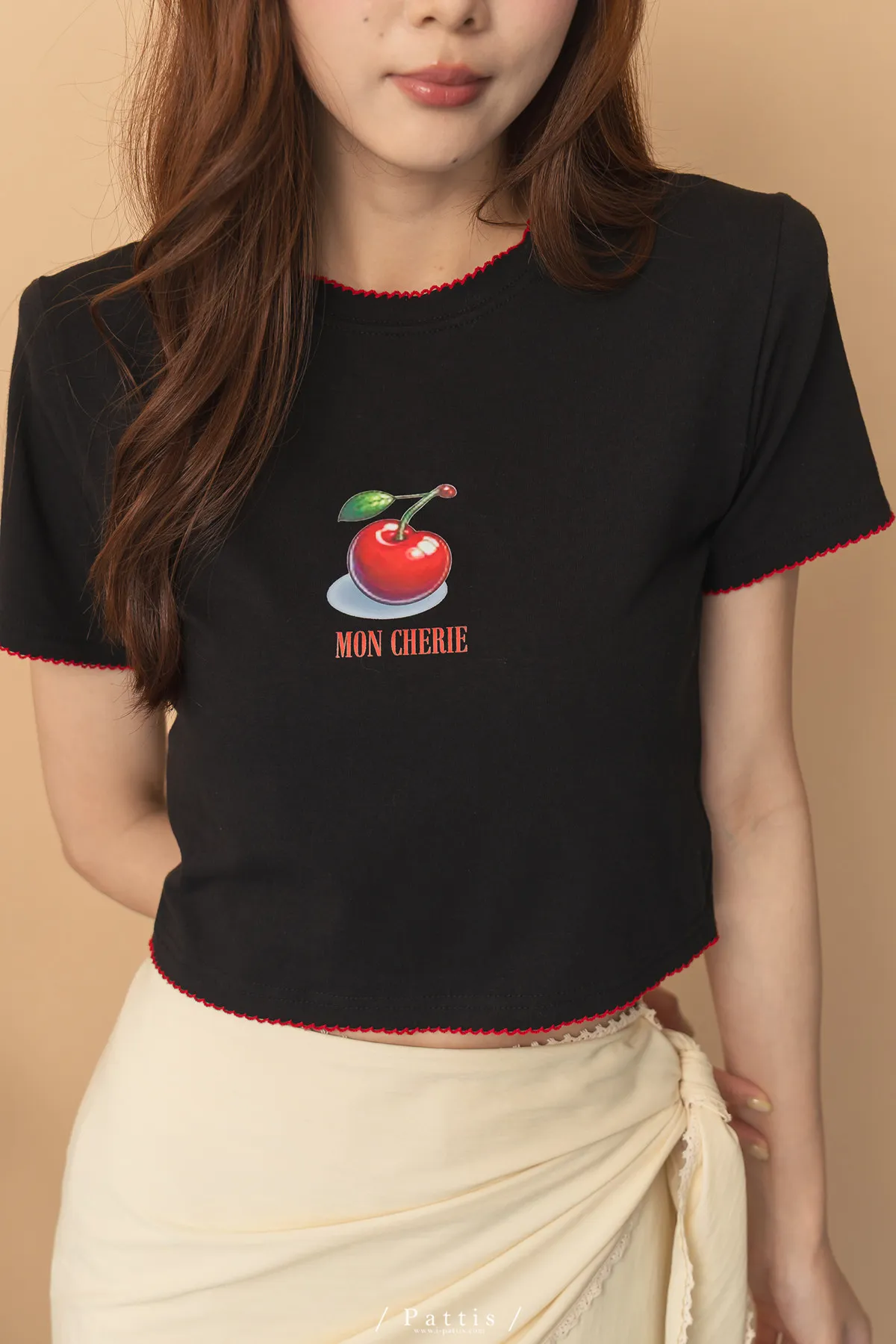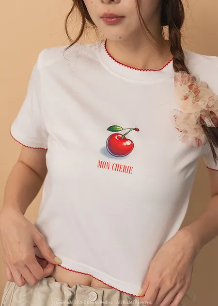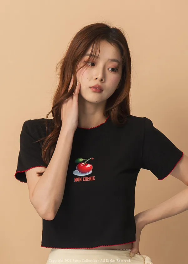 關於可愛的各種註解 | 勾針滾邊線櫻桃短T恤上衣(黑)