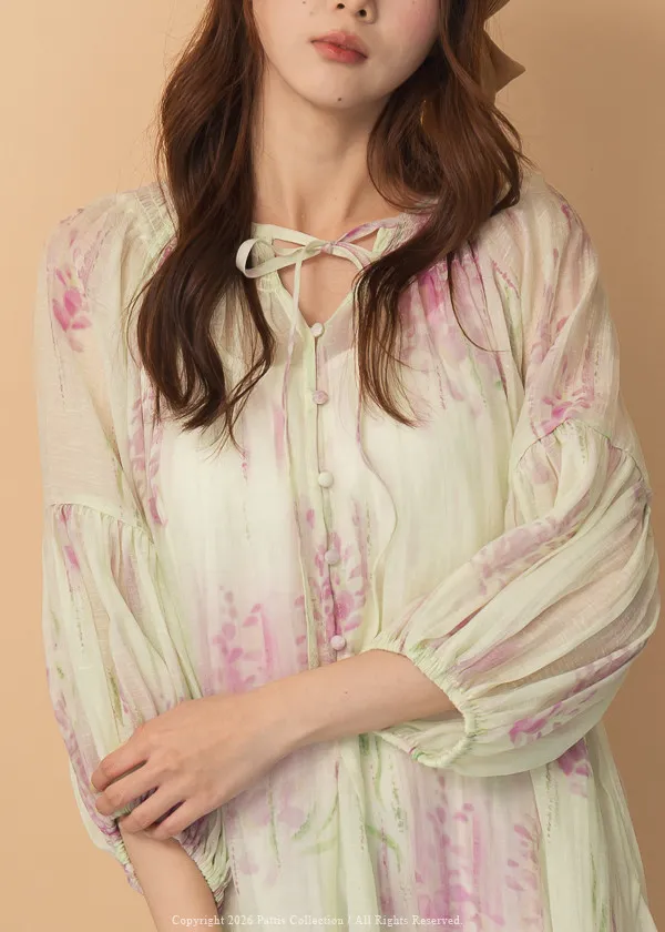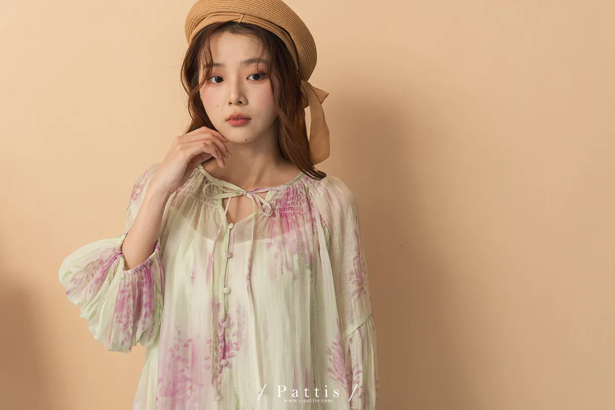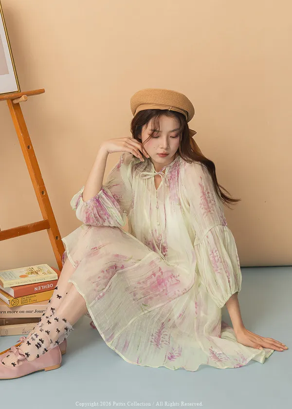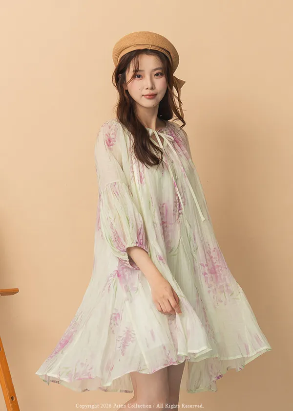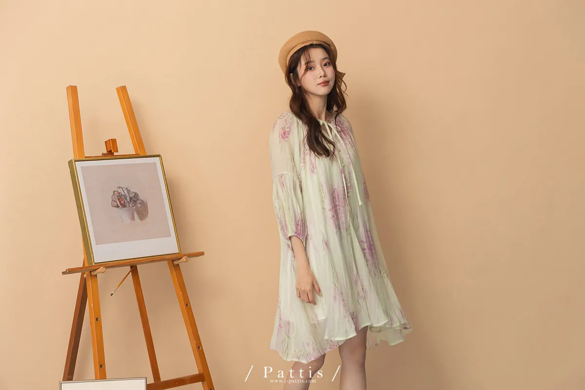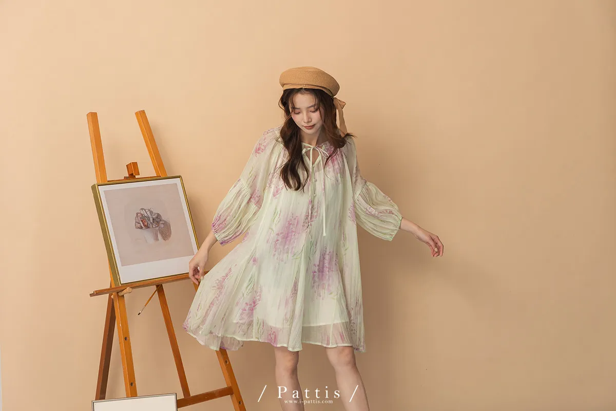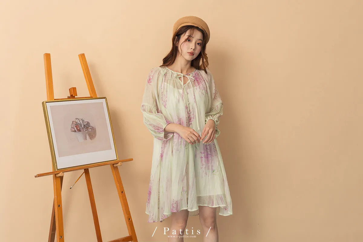 廣州選品-渲染印花綁帶澎袖壓摺洋裝+內襯set組(單一色)