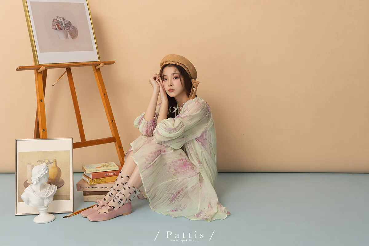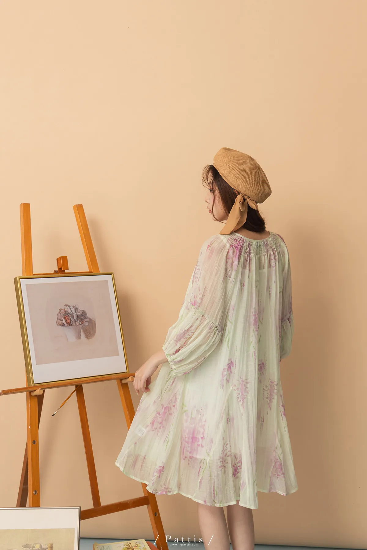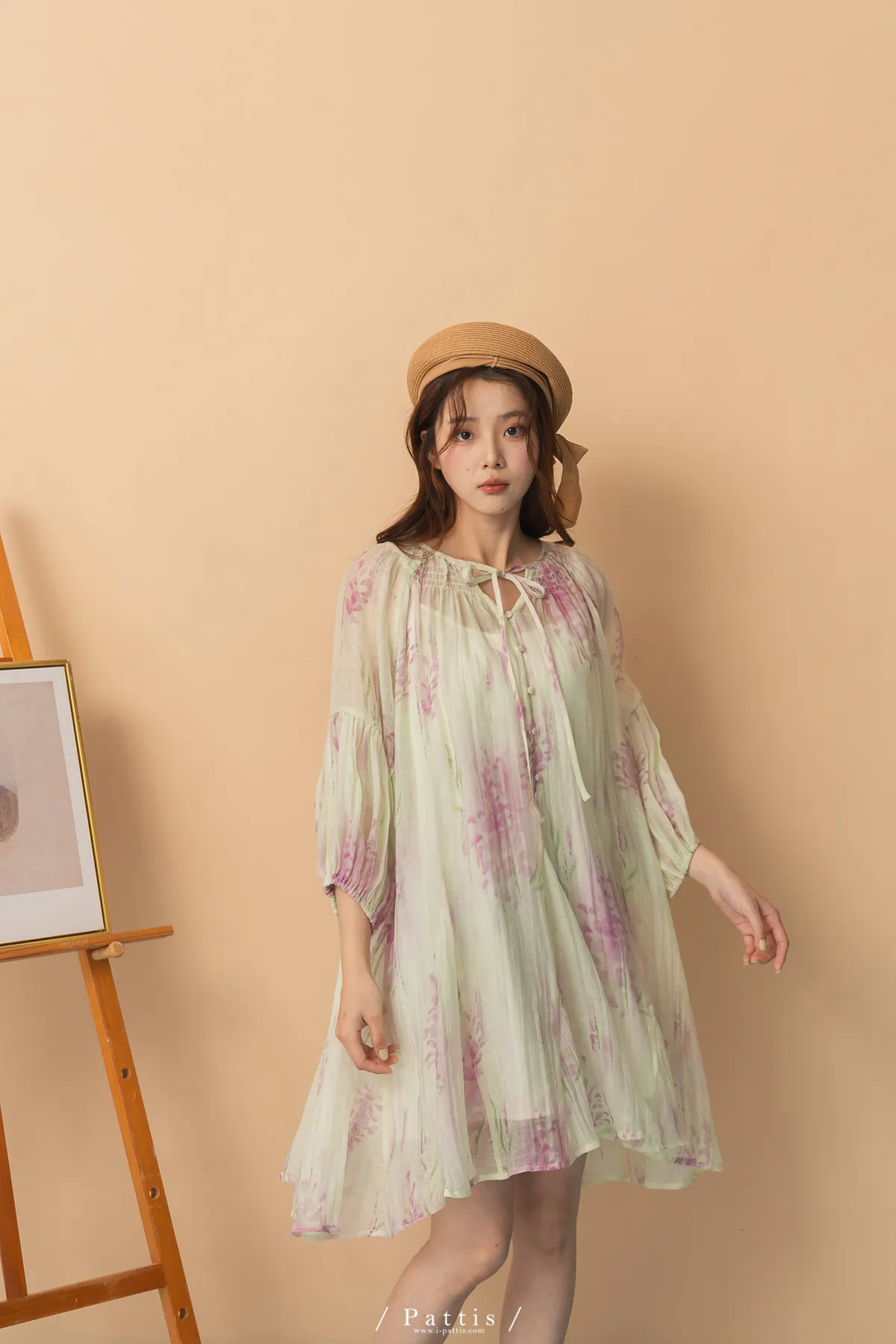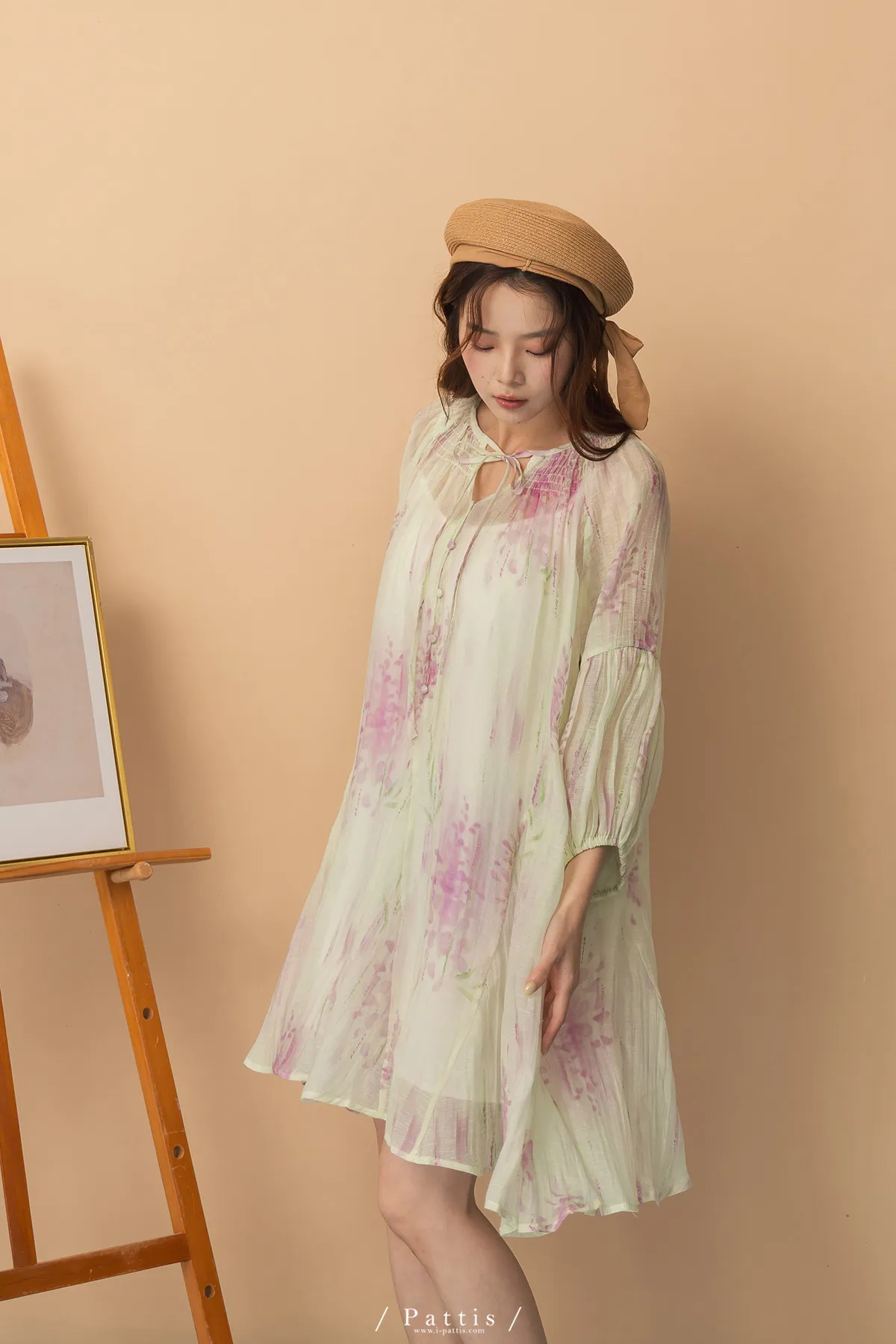 廣州選品-渲染印花綁帶澎袖壓摺洋裝+內襯set組(單一色)