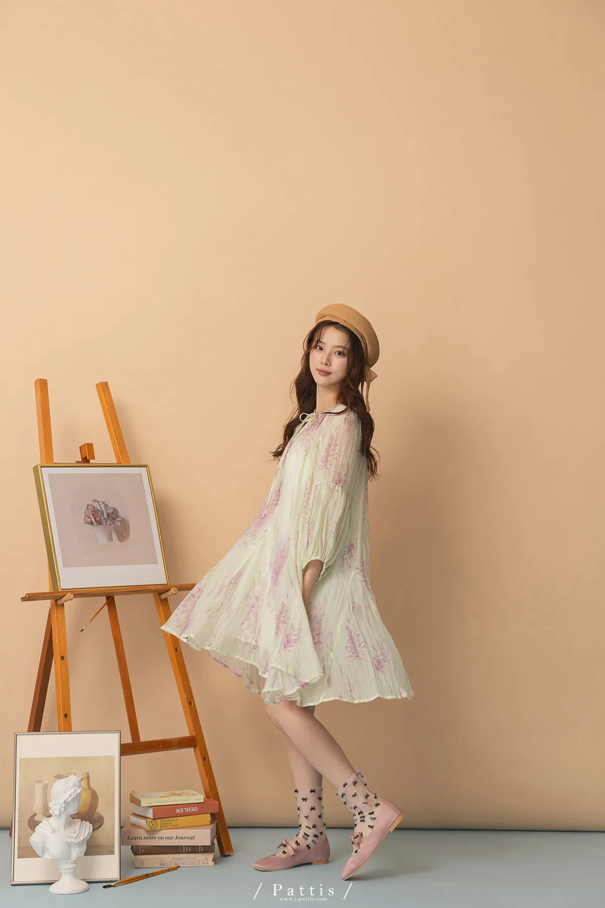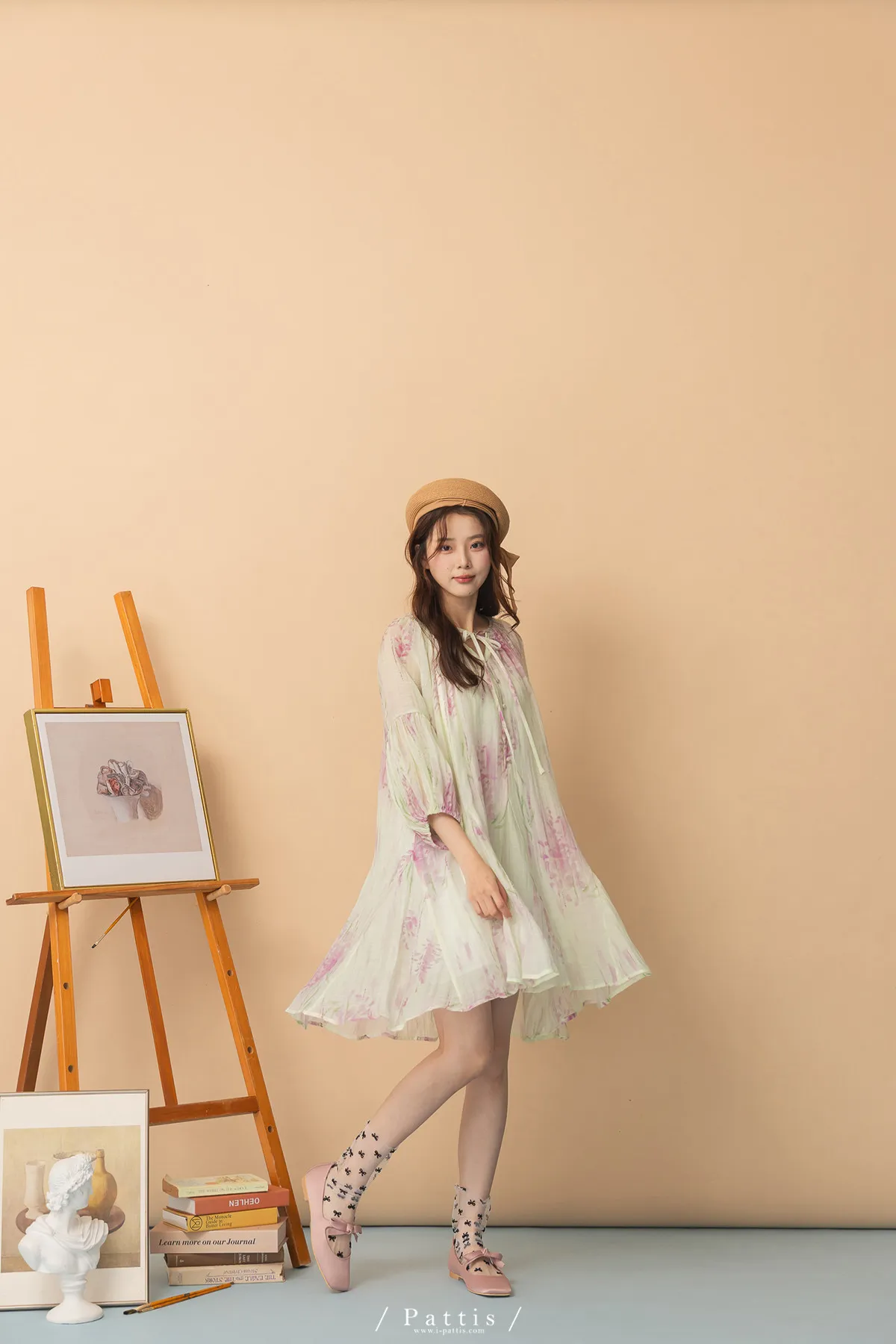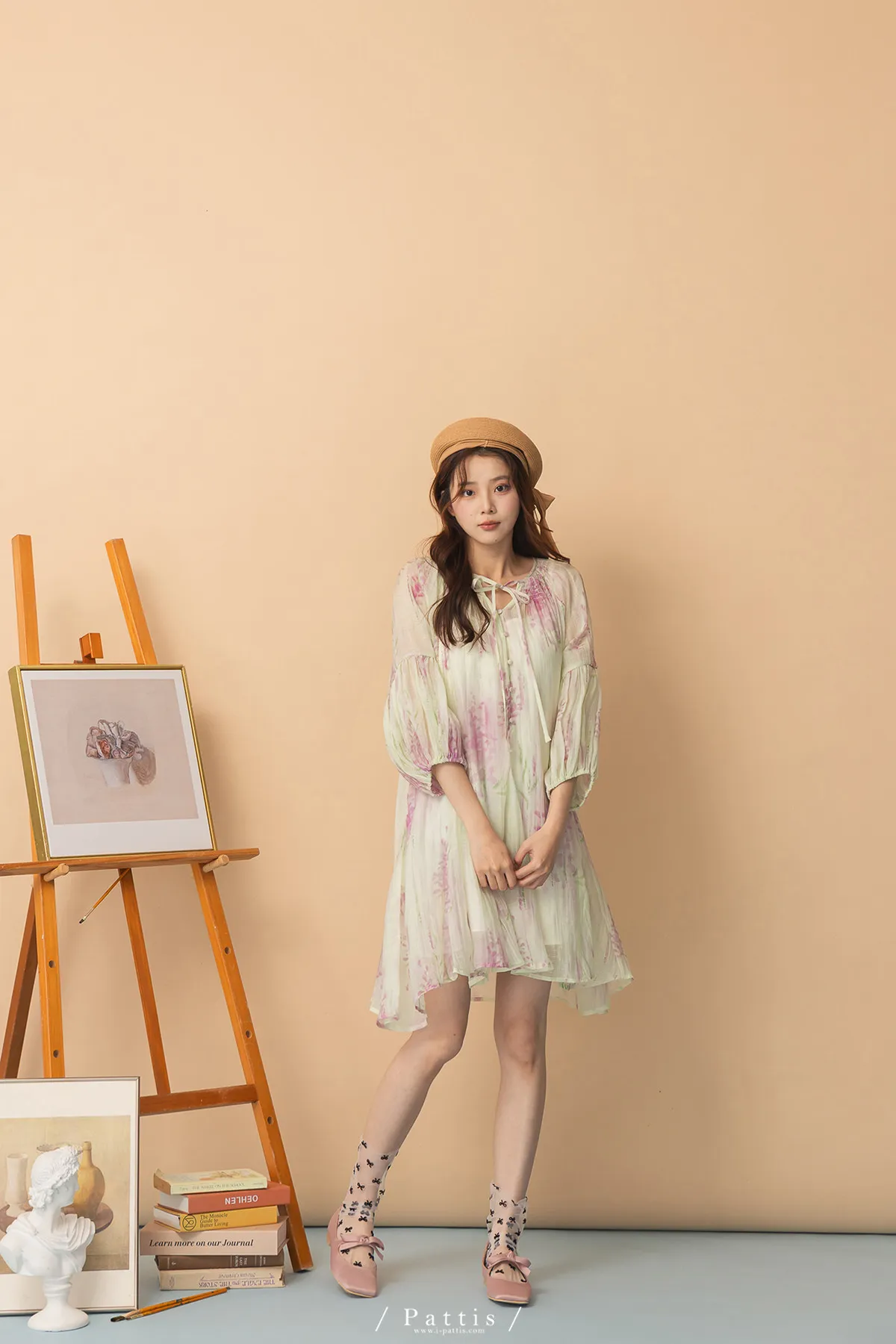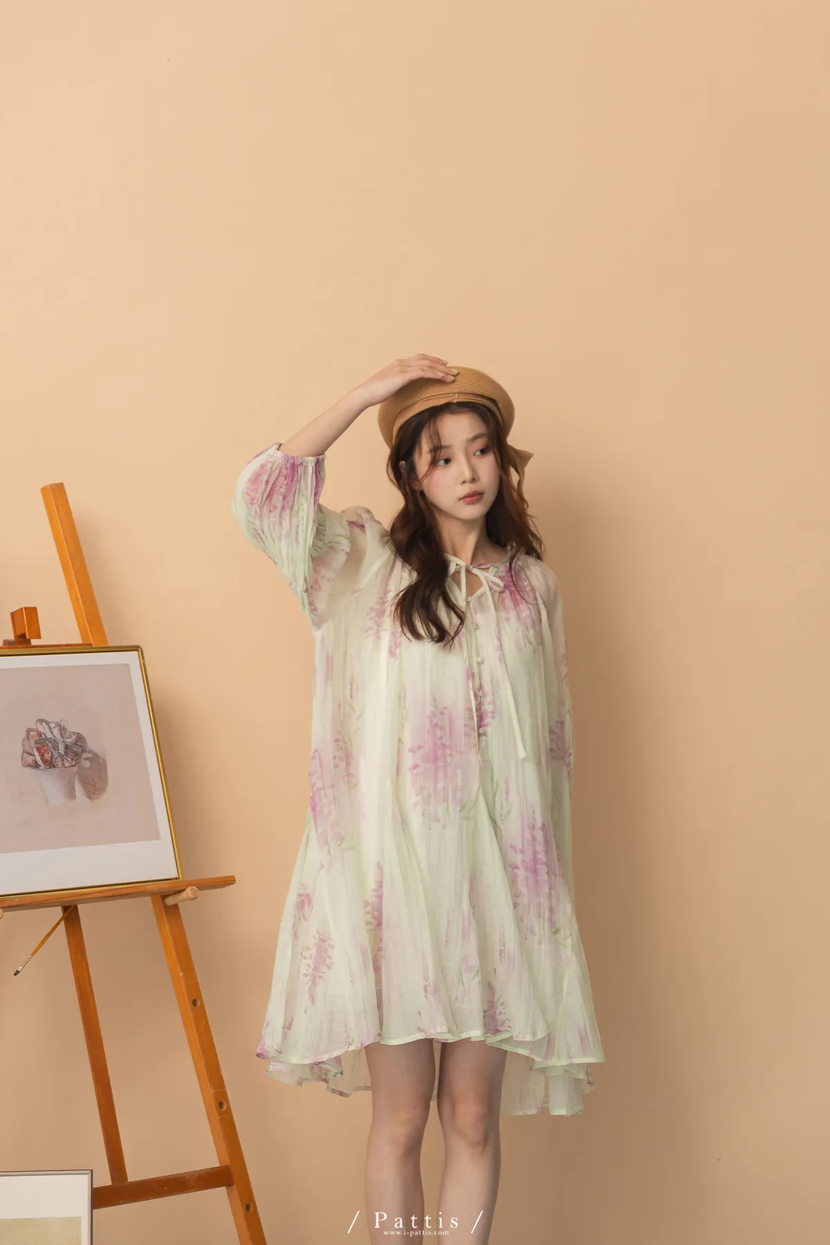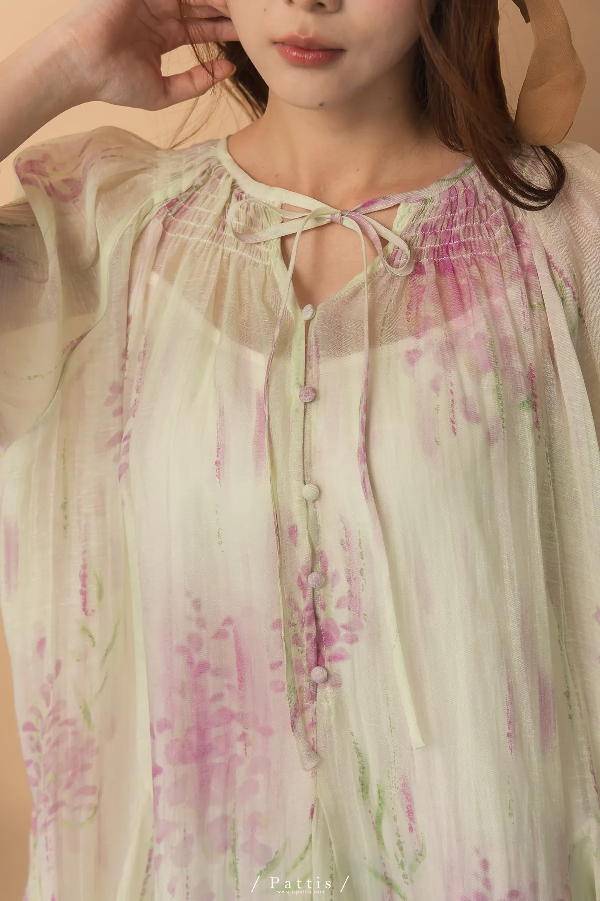 廣州選品-渲染印花綁帶澎袖壓摺洋裝+內襯set組(單一色)