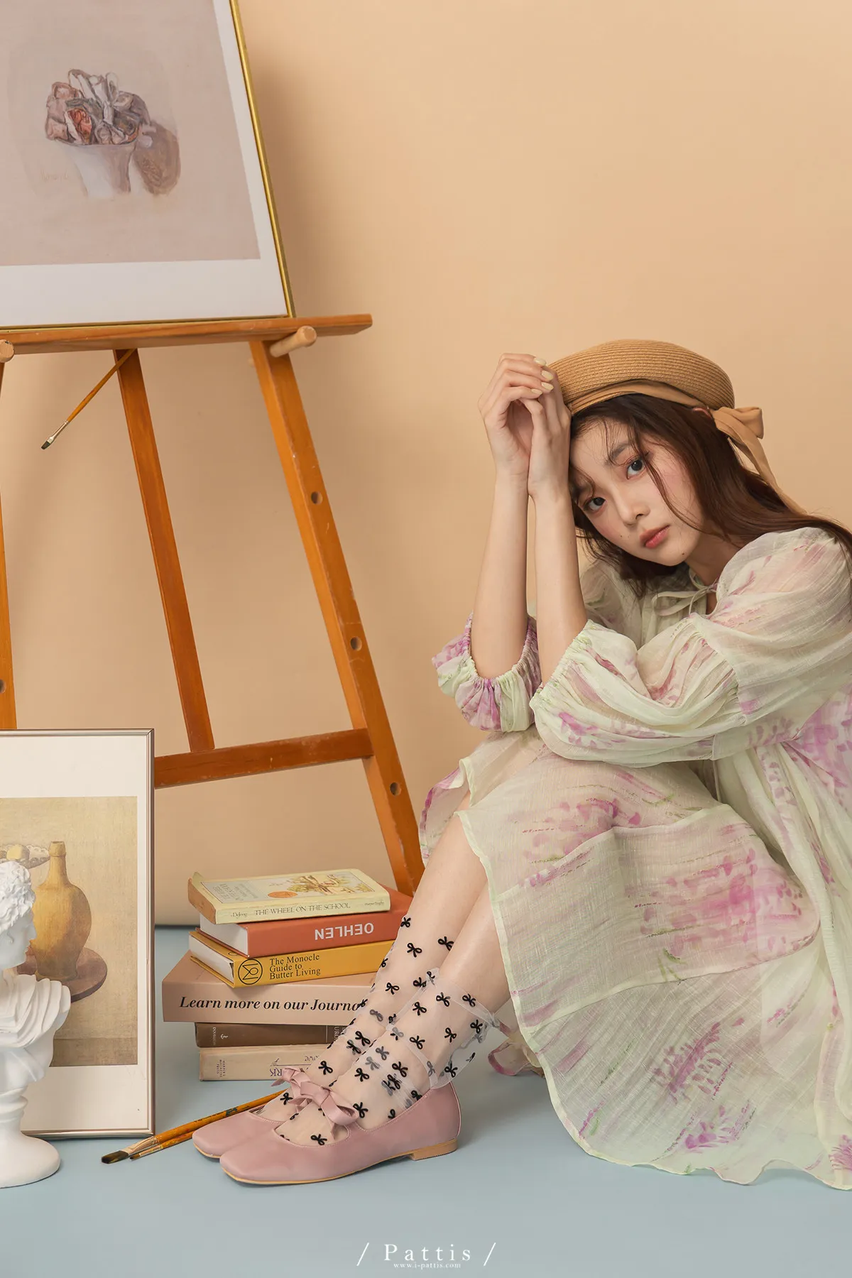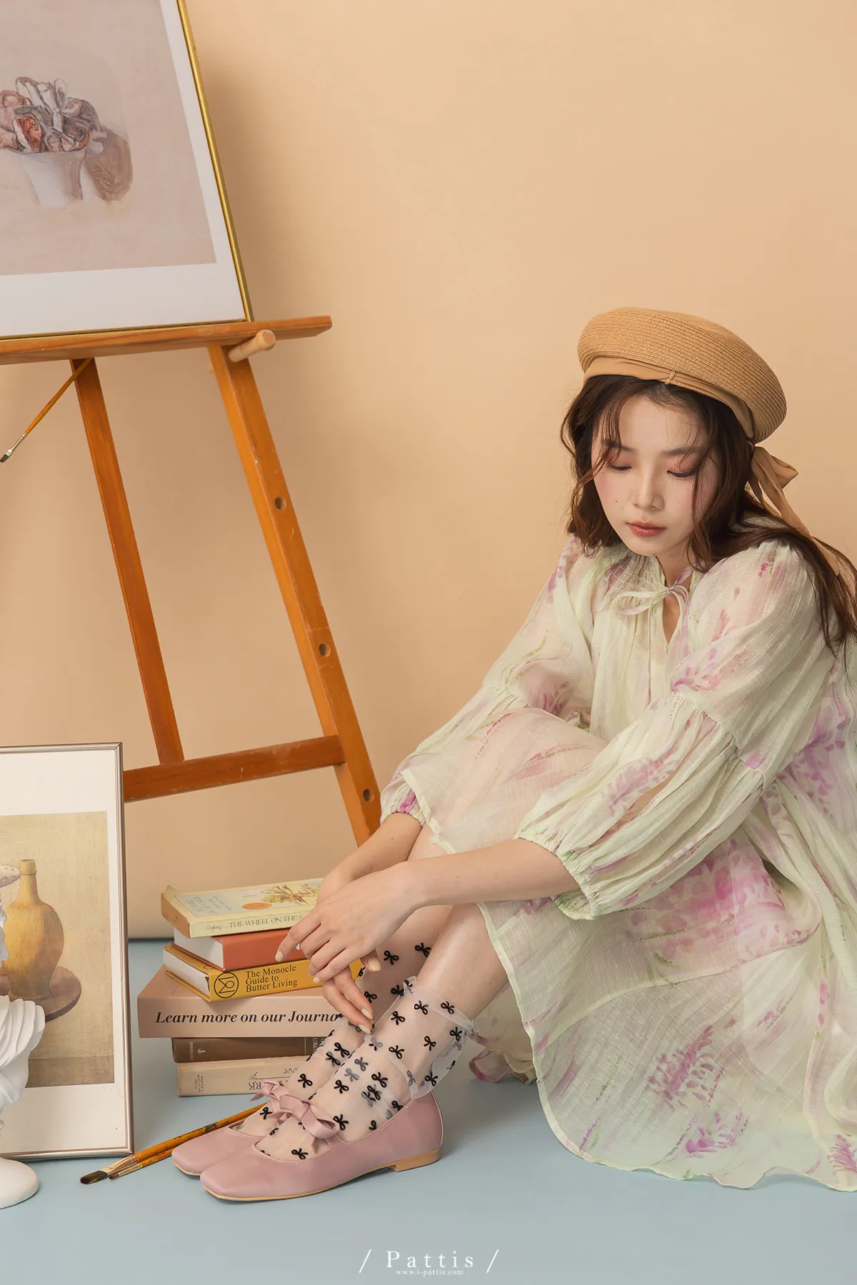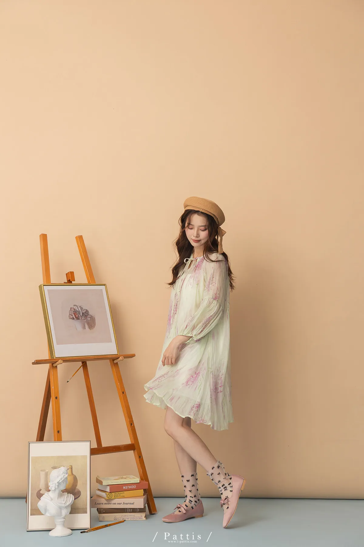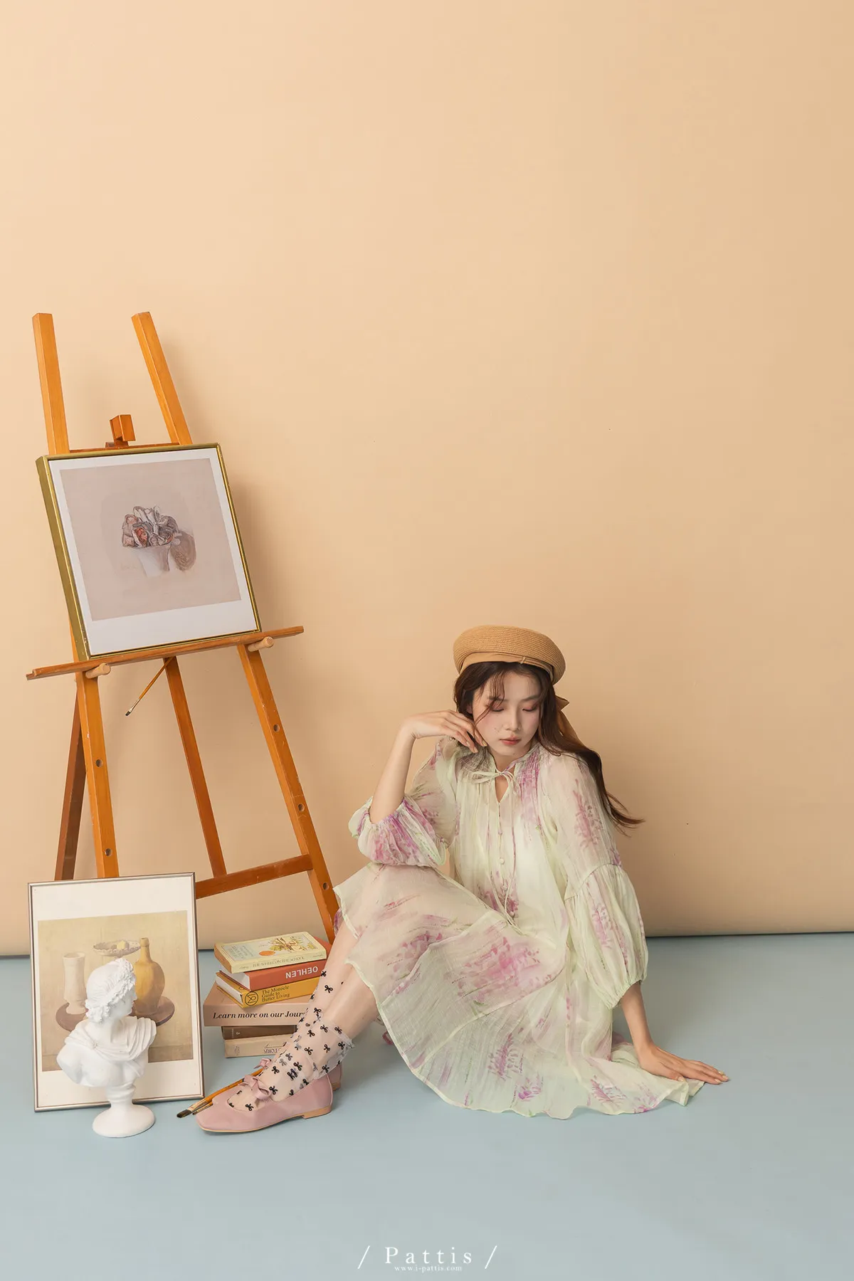 廣州選品-渲染印花綁帶澎袖壓摺洋裝+內襯set組(單一色)