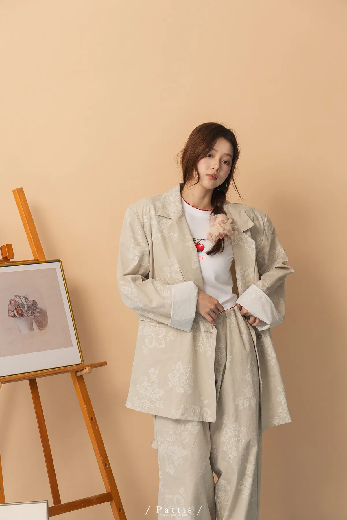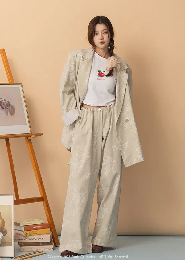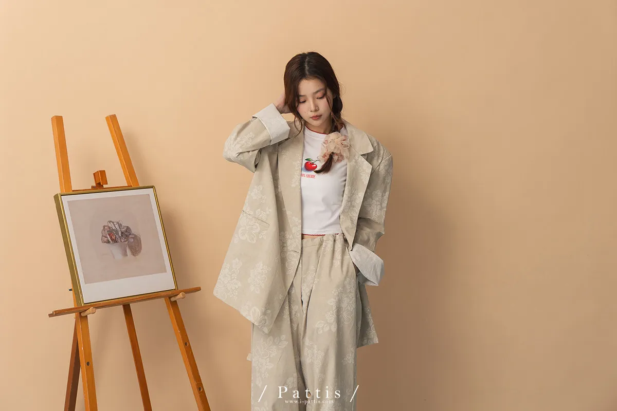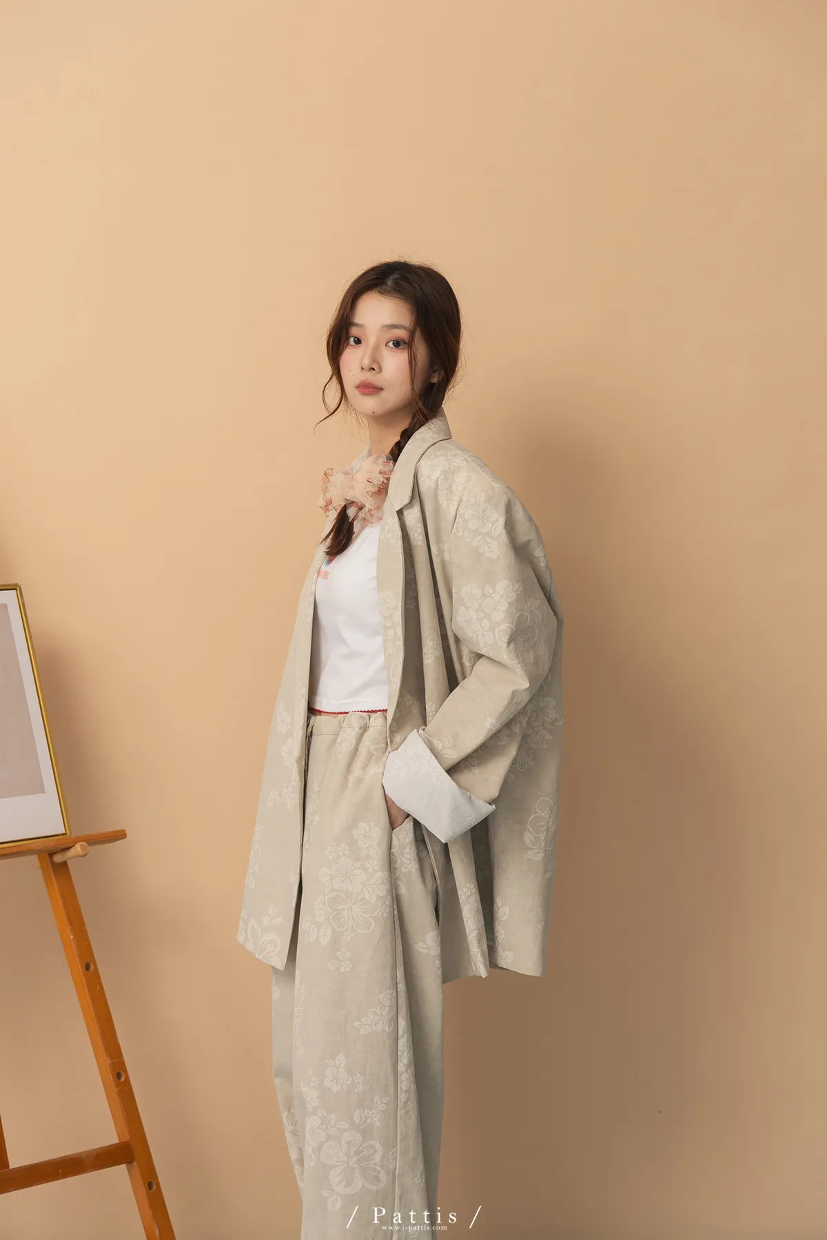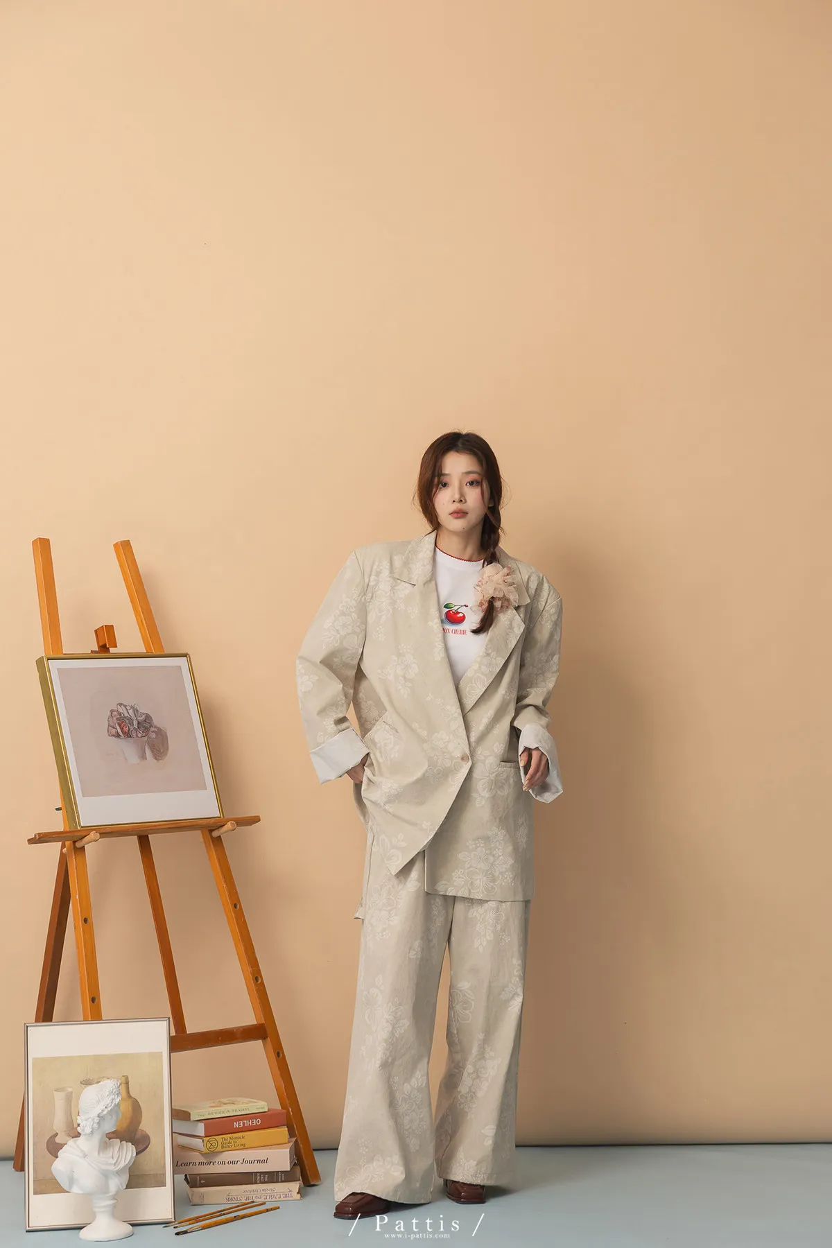 優雅盔甲 | (可分售)浮雕緹花西裝外套+抽繩寬褲set(米杏)
