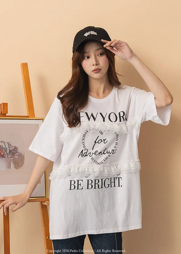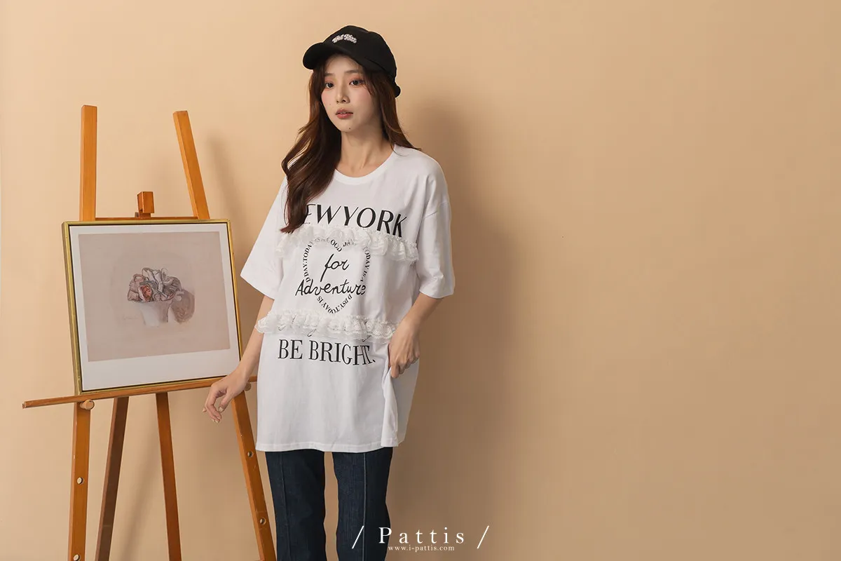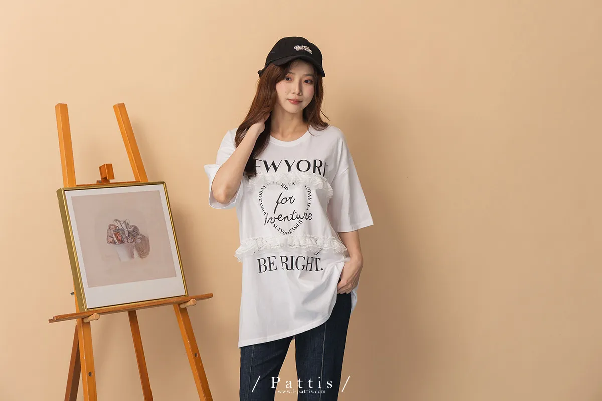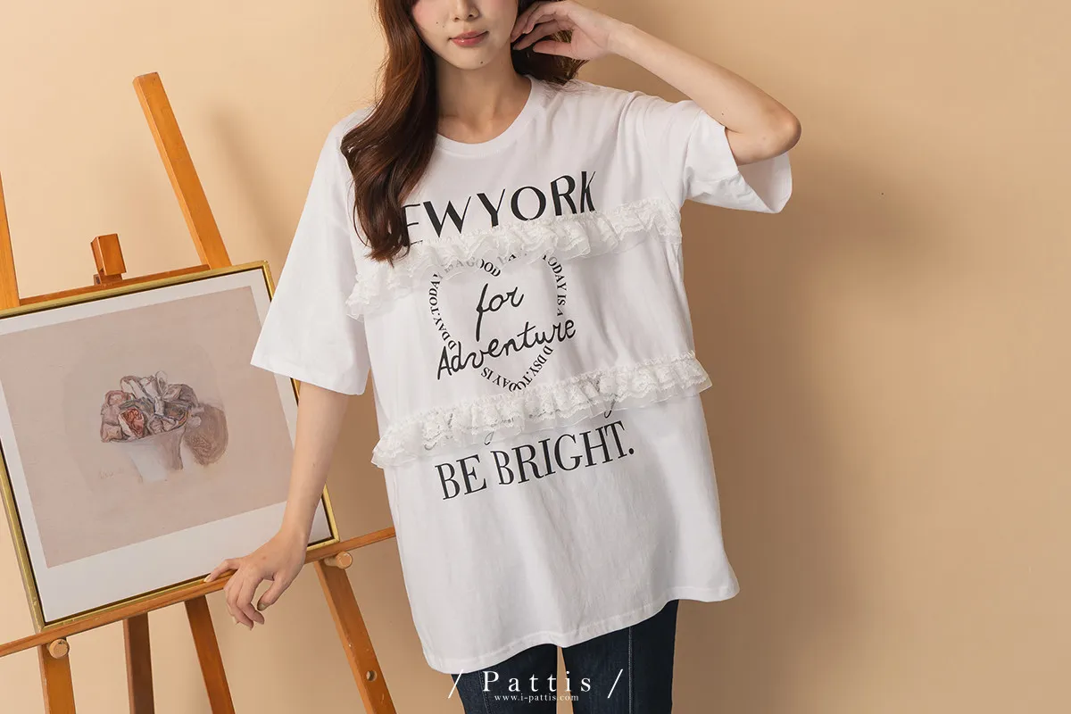 浪漫武裝份子 | 綴蕾絲拼接字母圓領長T恤(白)