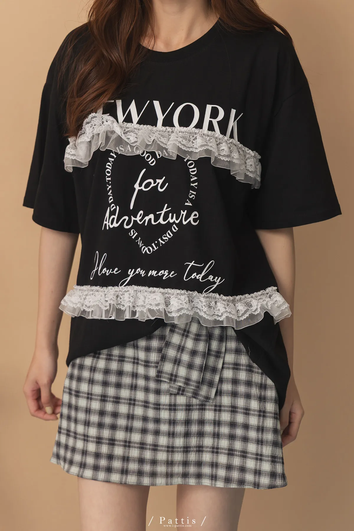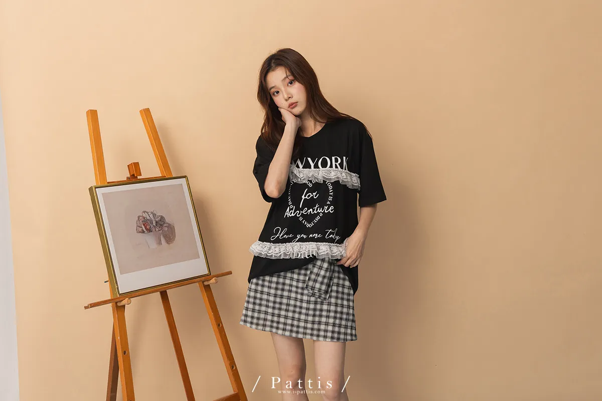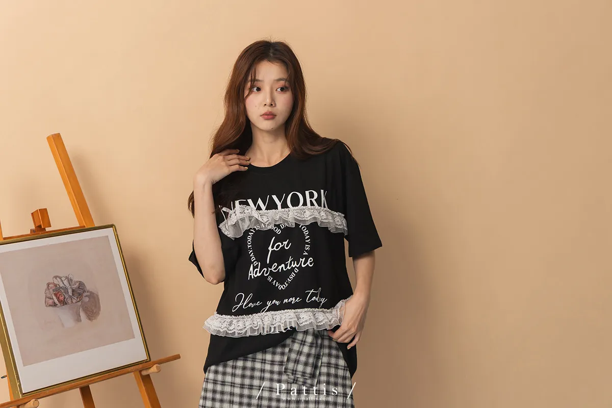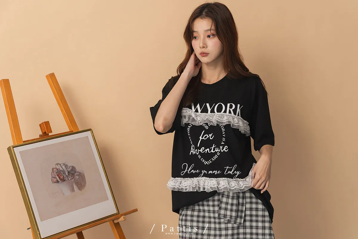浪漫武裝份子 | 綴蕾絲拼接字母圓領長T恤(黑)