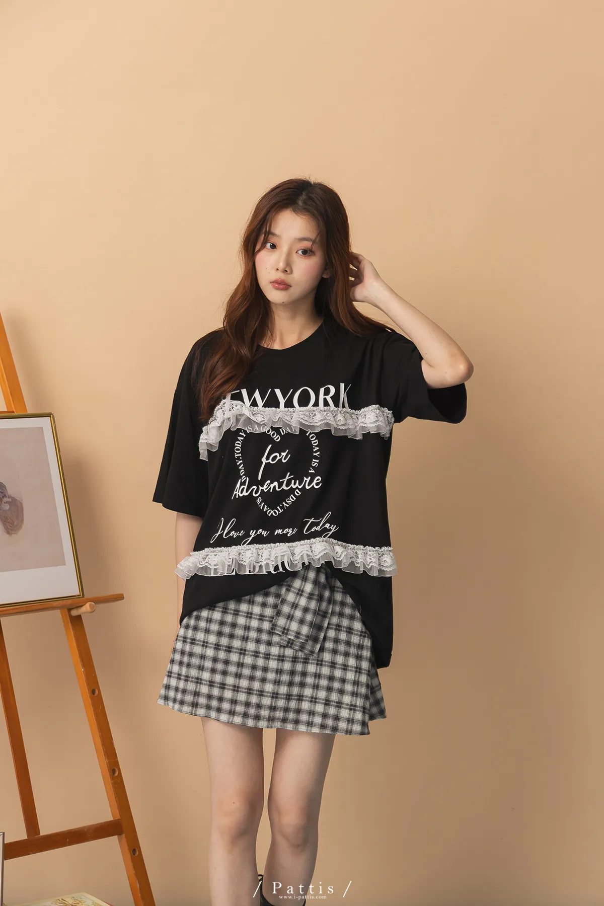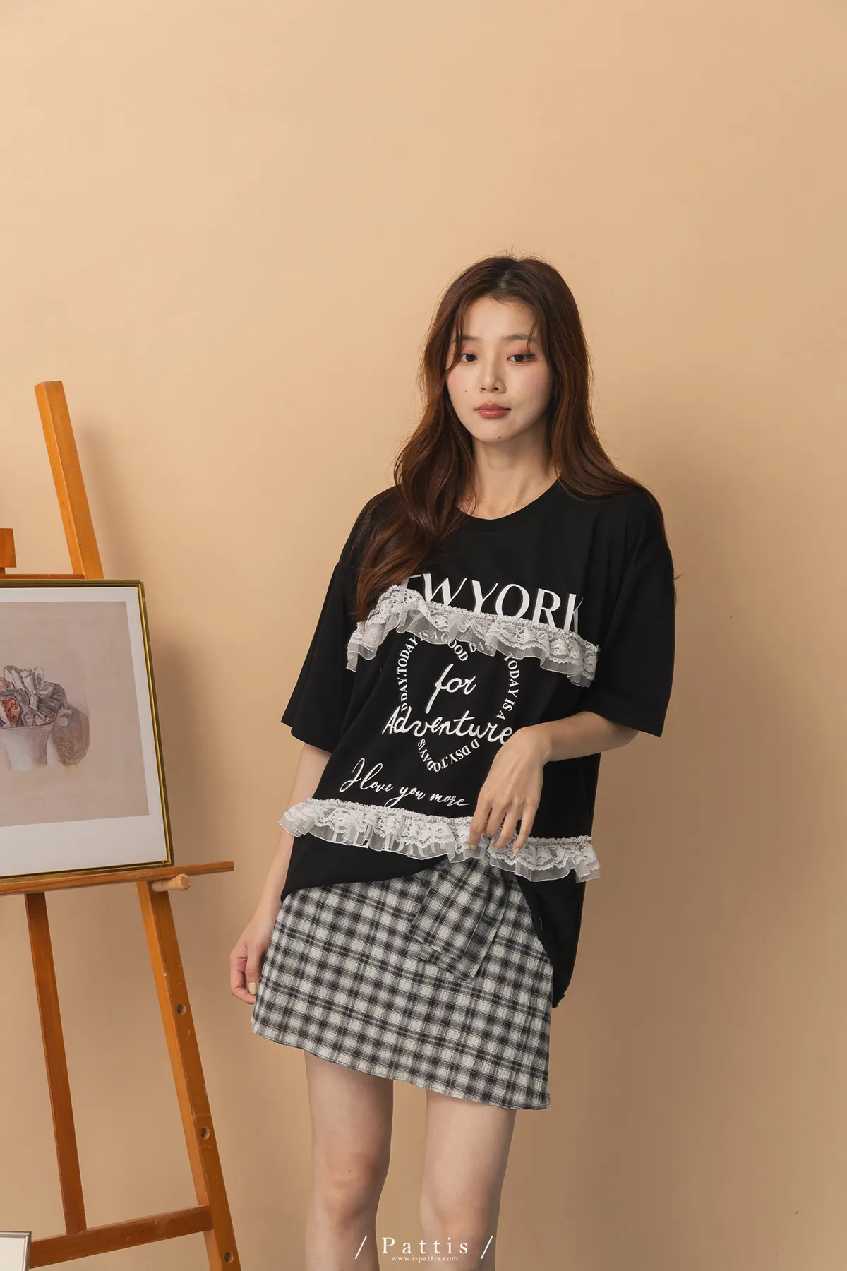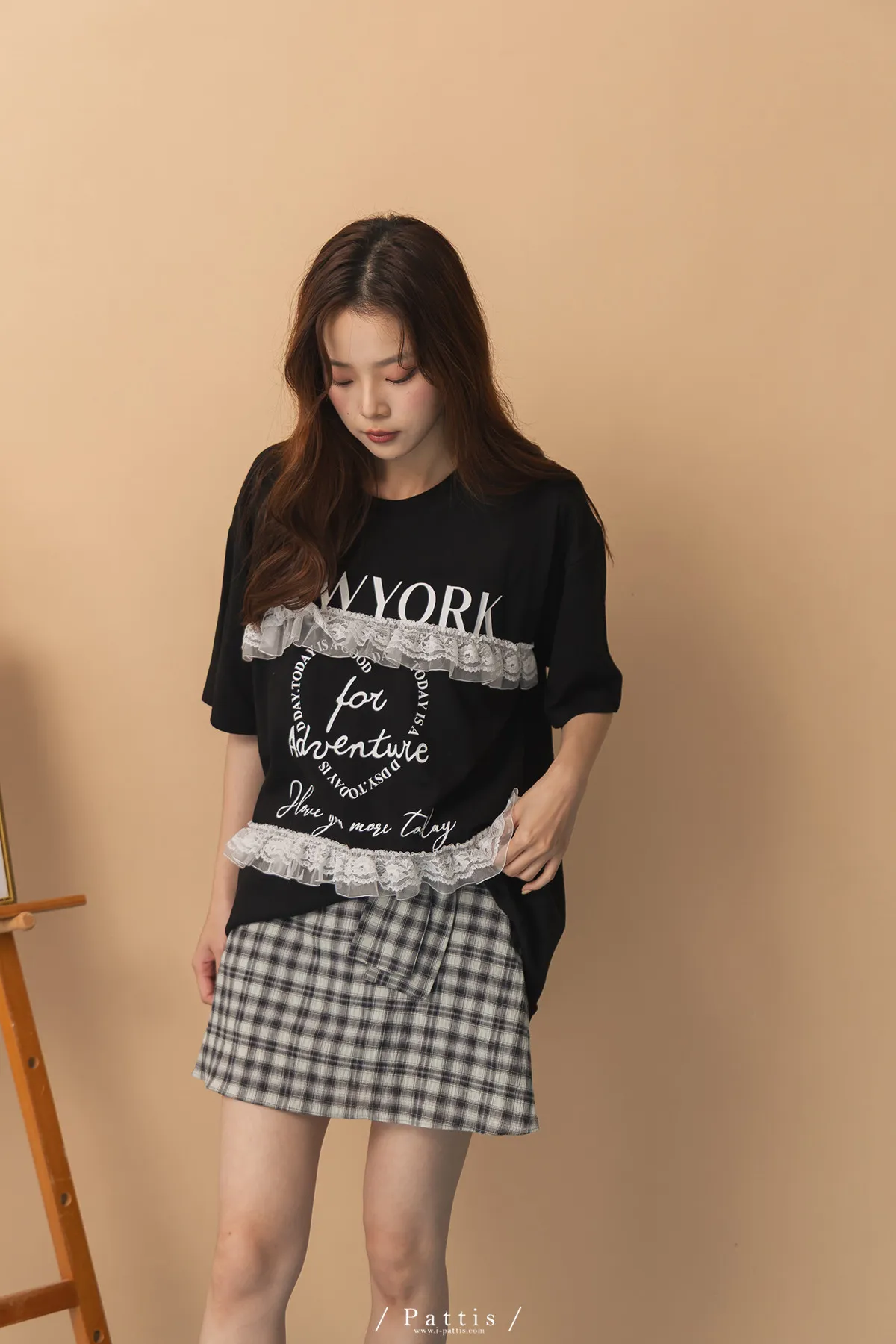 浪漫武裝份子 | 綴蕾絲拼接字母圓領長T恤(黑)