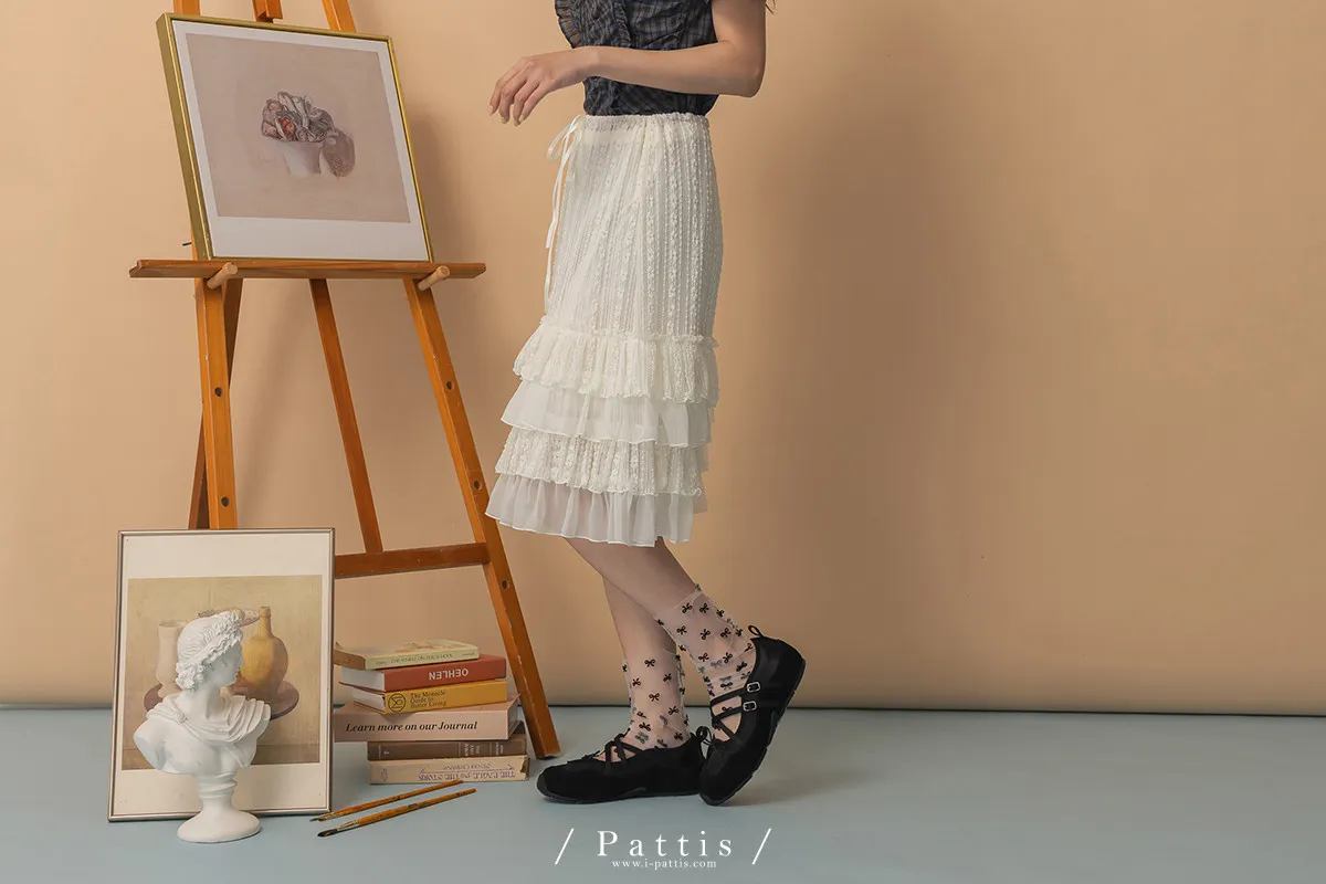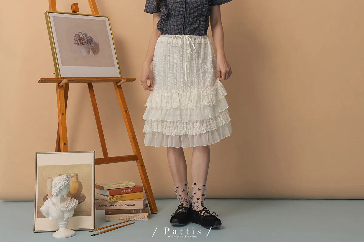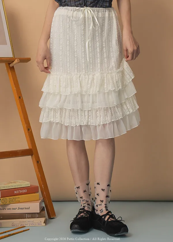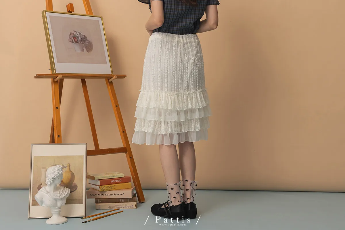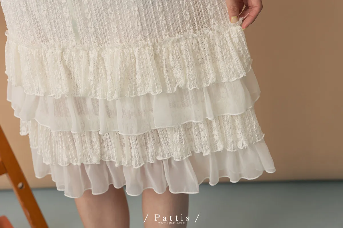 (現貨)浪漫光柵 | 點點條紋荷葉蕾絲蛋糕裙(米白)