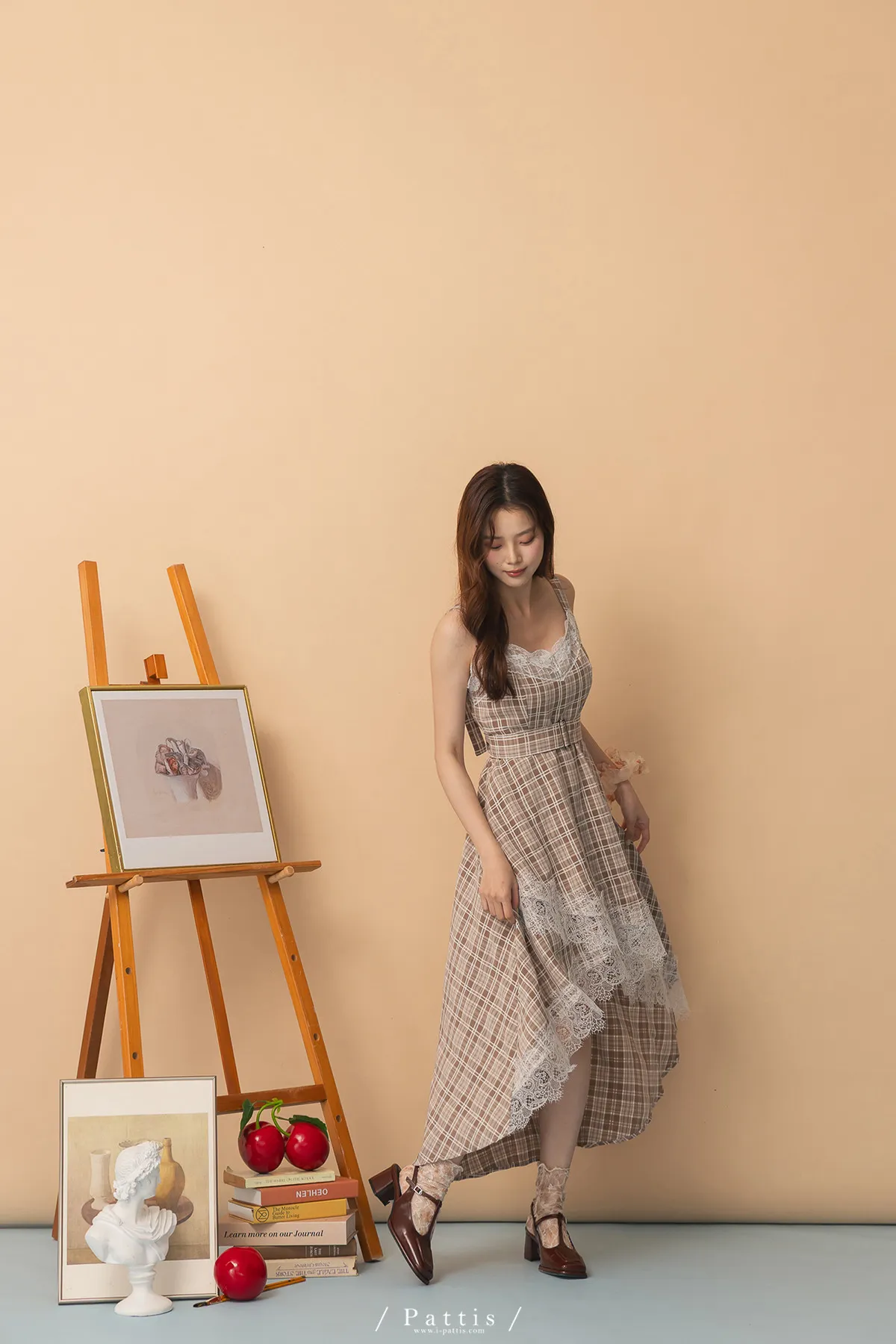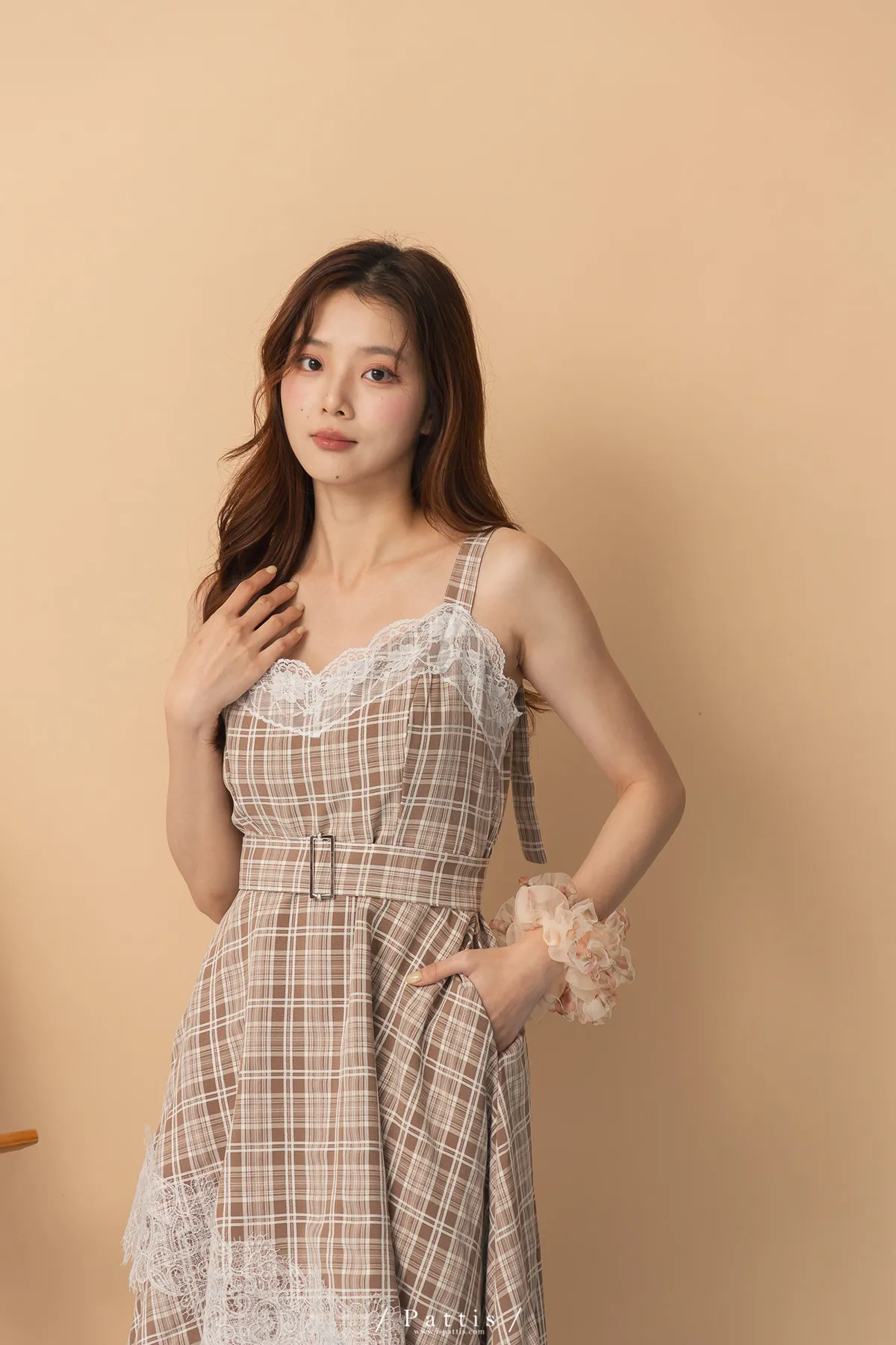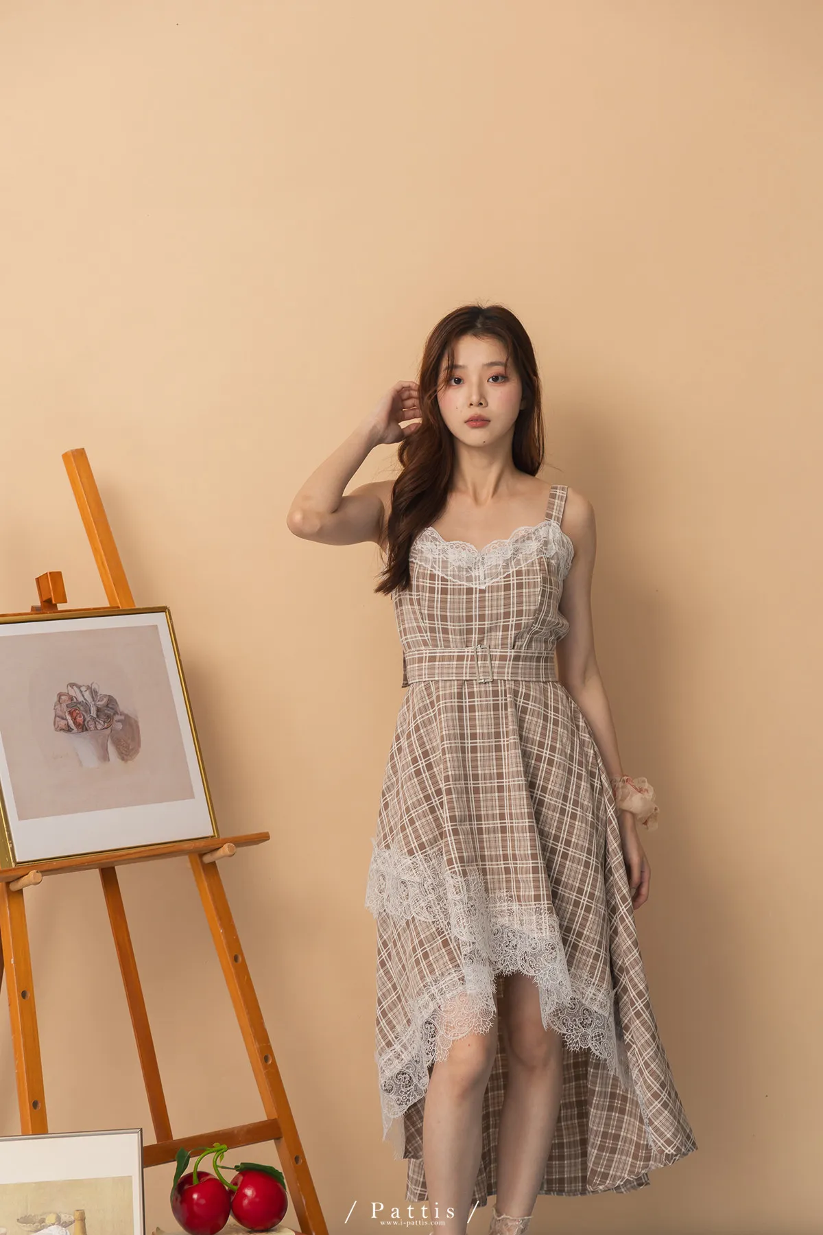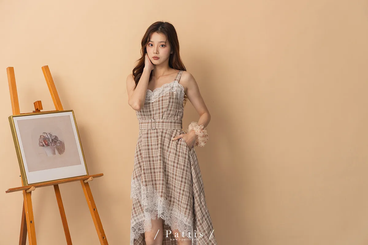 圖書館是彼此的據點 | 綴煙花蕾絲附腰帶吊帶格紋洋裝(棕咖)