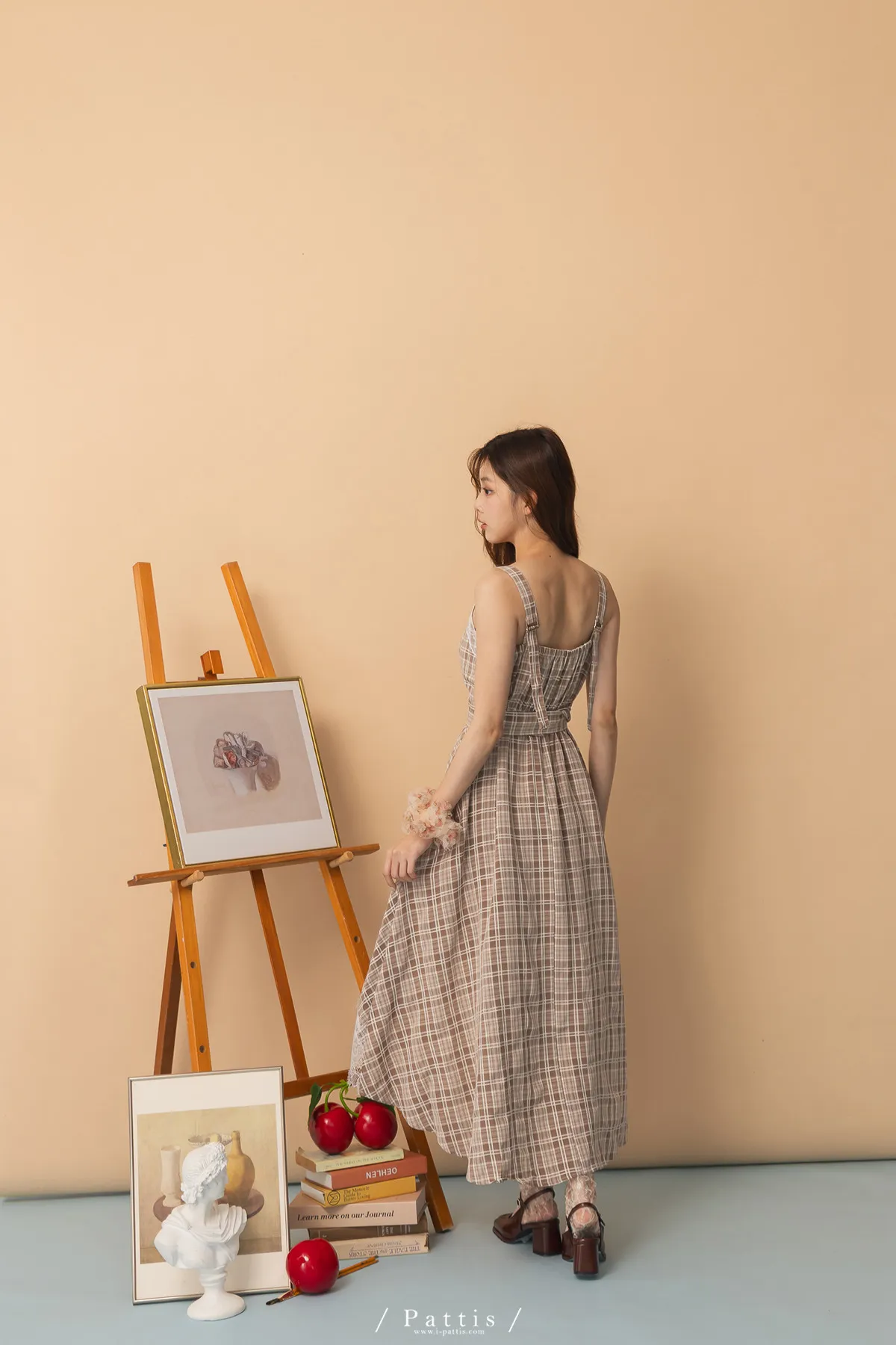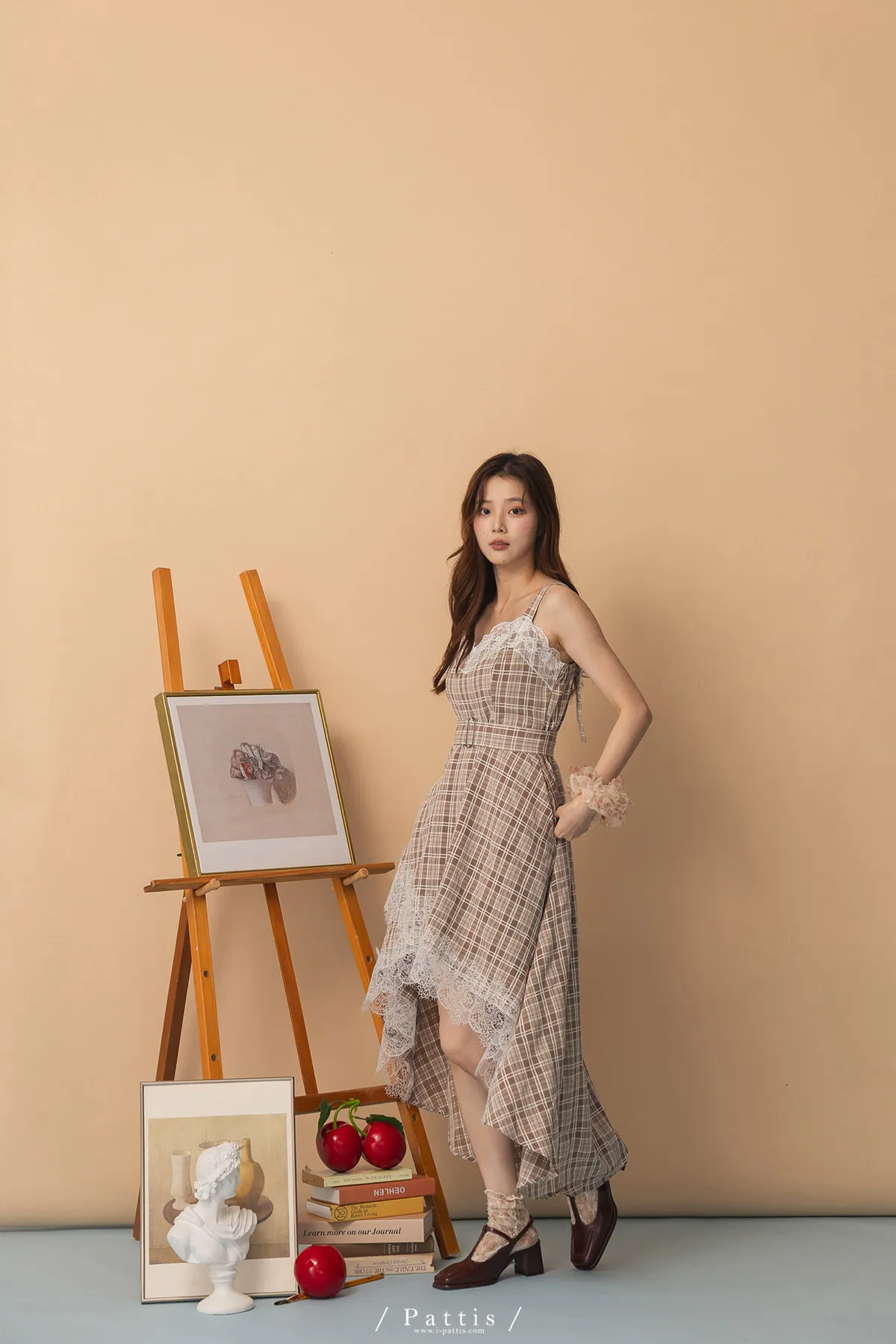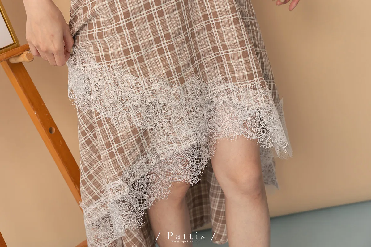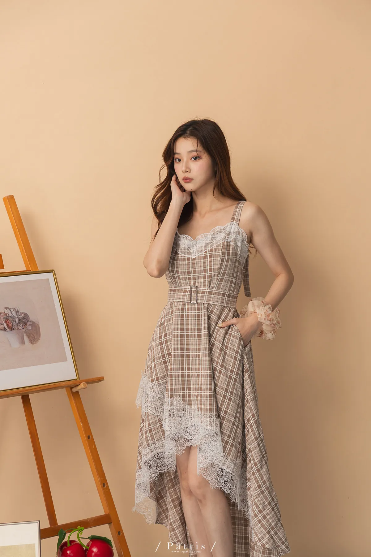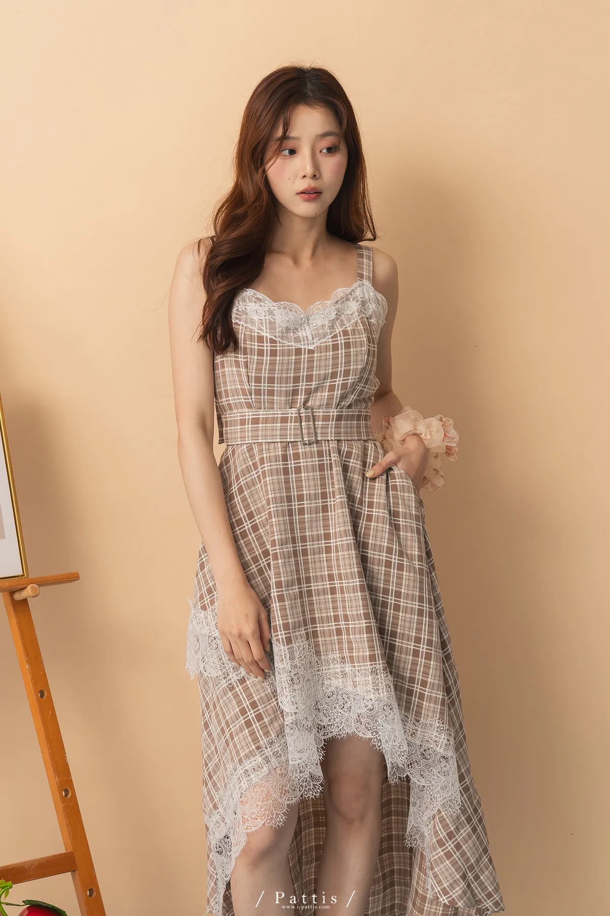 圖書館是彼此的據點 | 綴煙花蕾絲附腰帶吊帶格紋洋裝(棕咖)