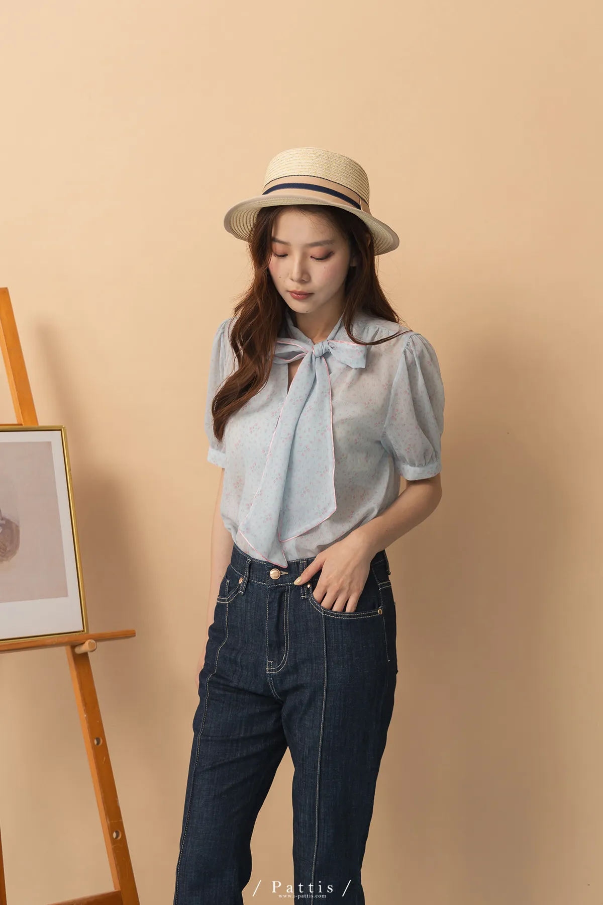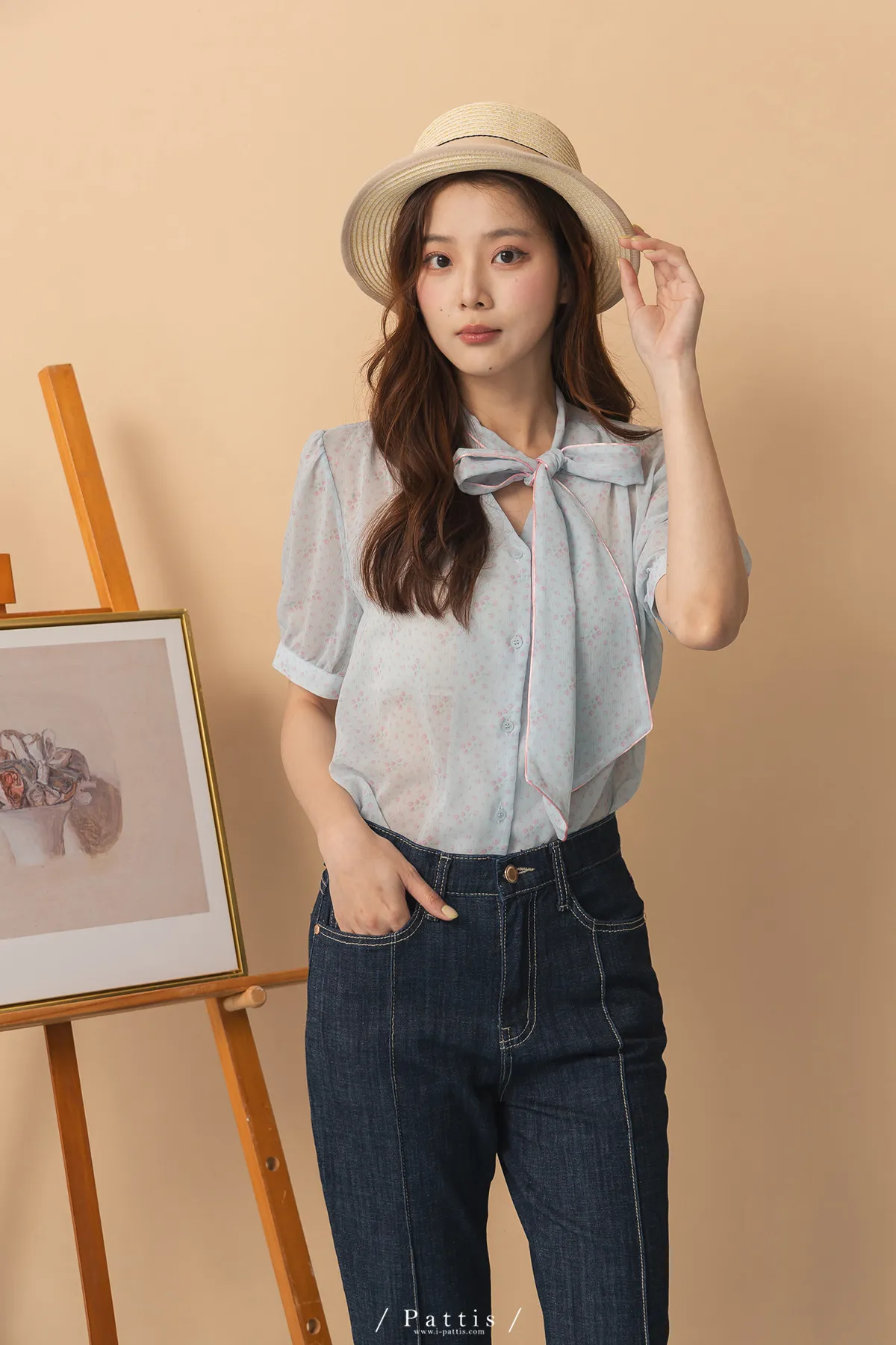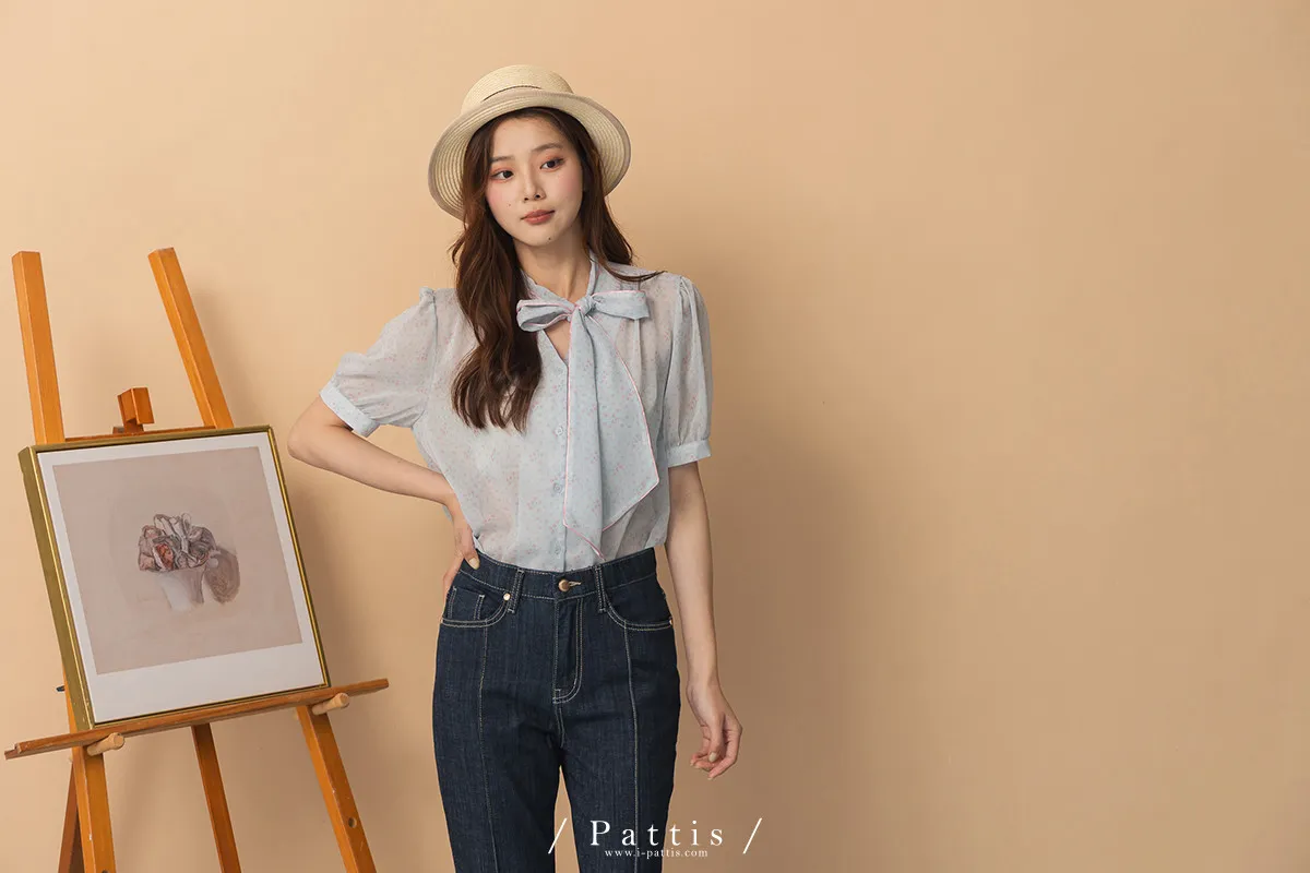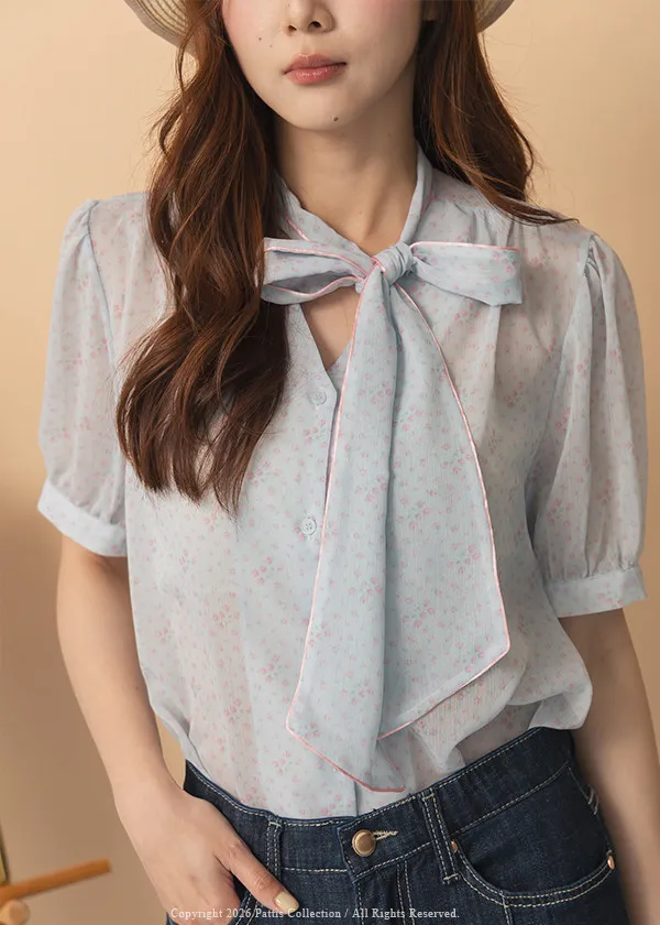 春日慵懶範本 | 滾邊小碎花領巾V領上衣(淺藍)