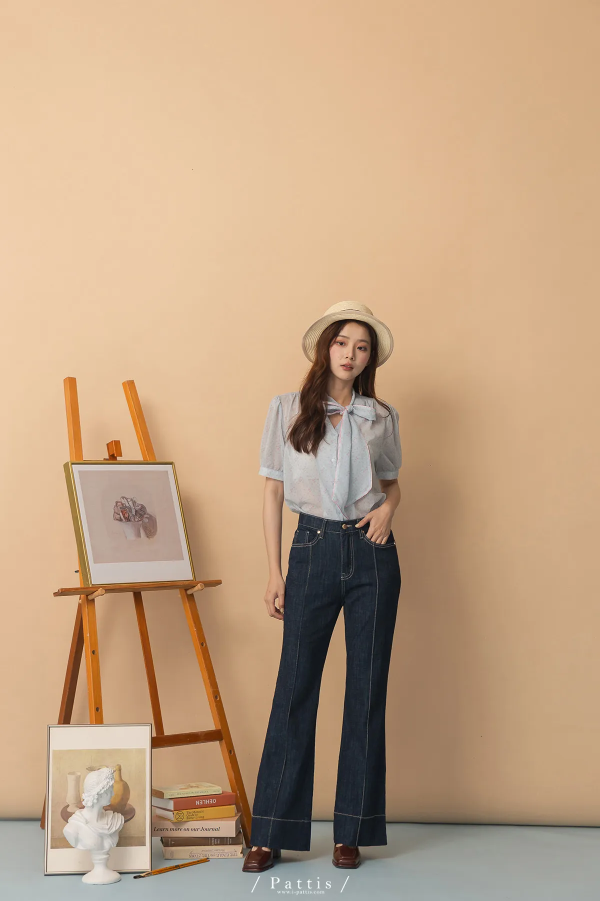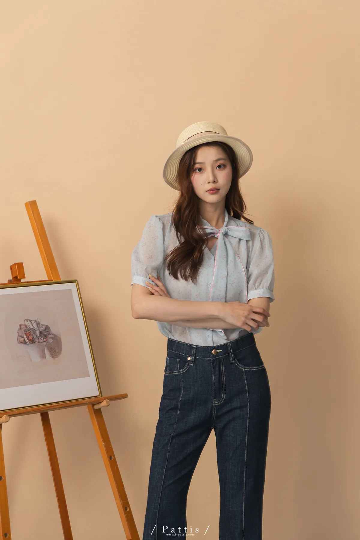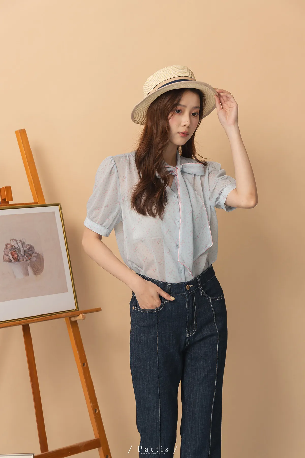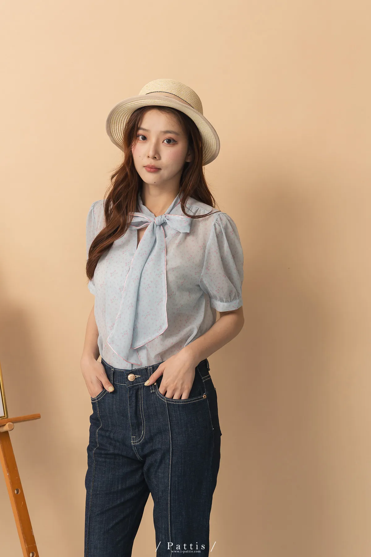 春日慵懶範本 | 滾邊小碎花領巾V領上衣(淺藍)