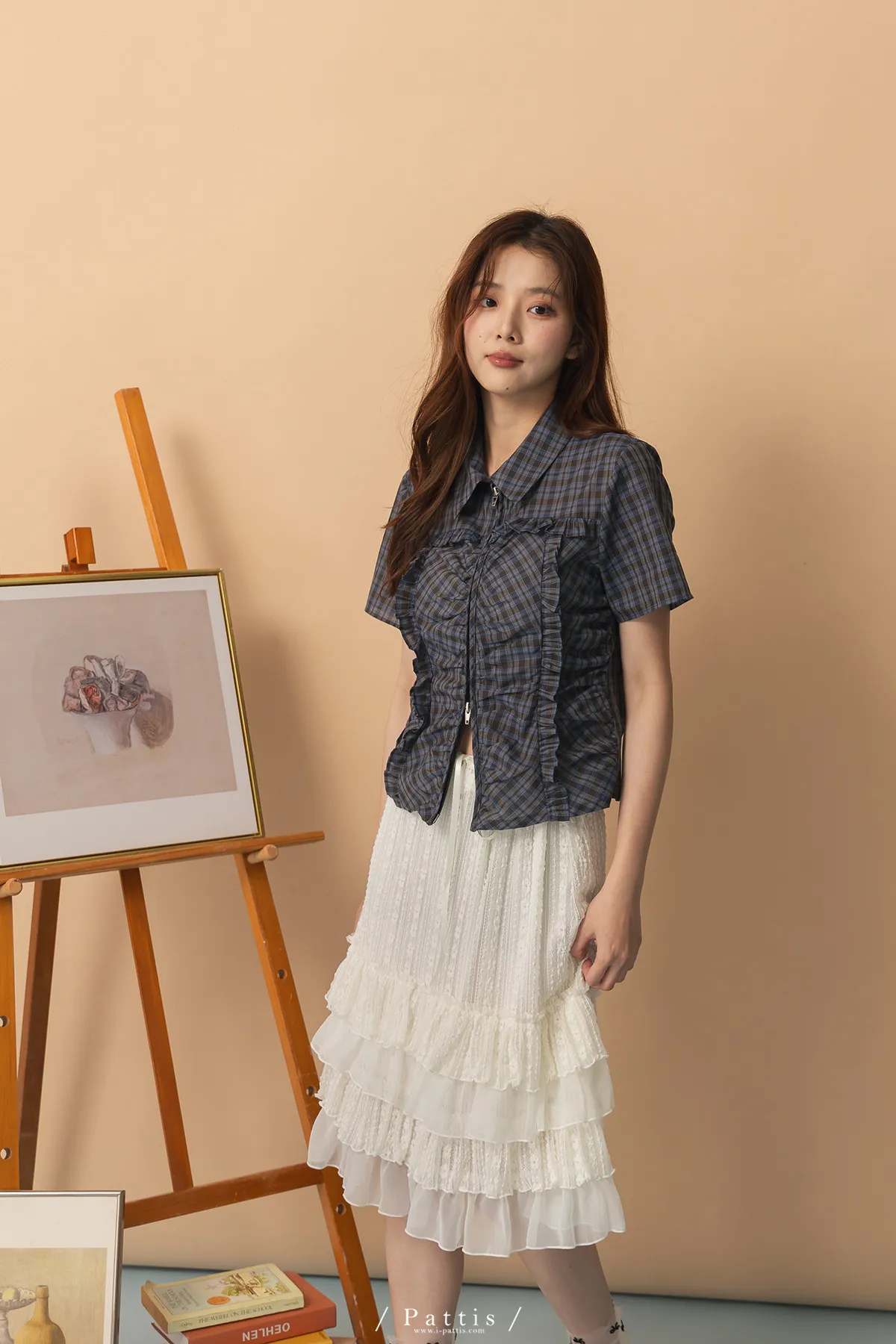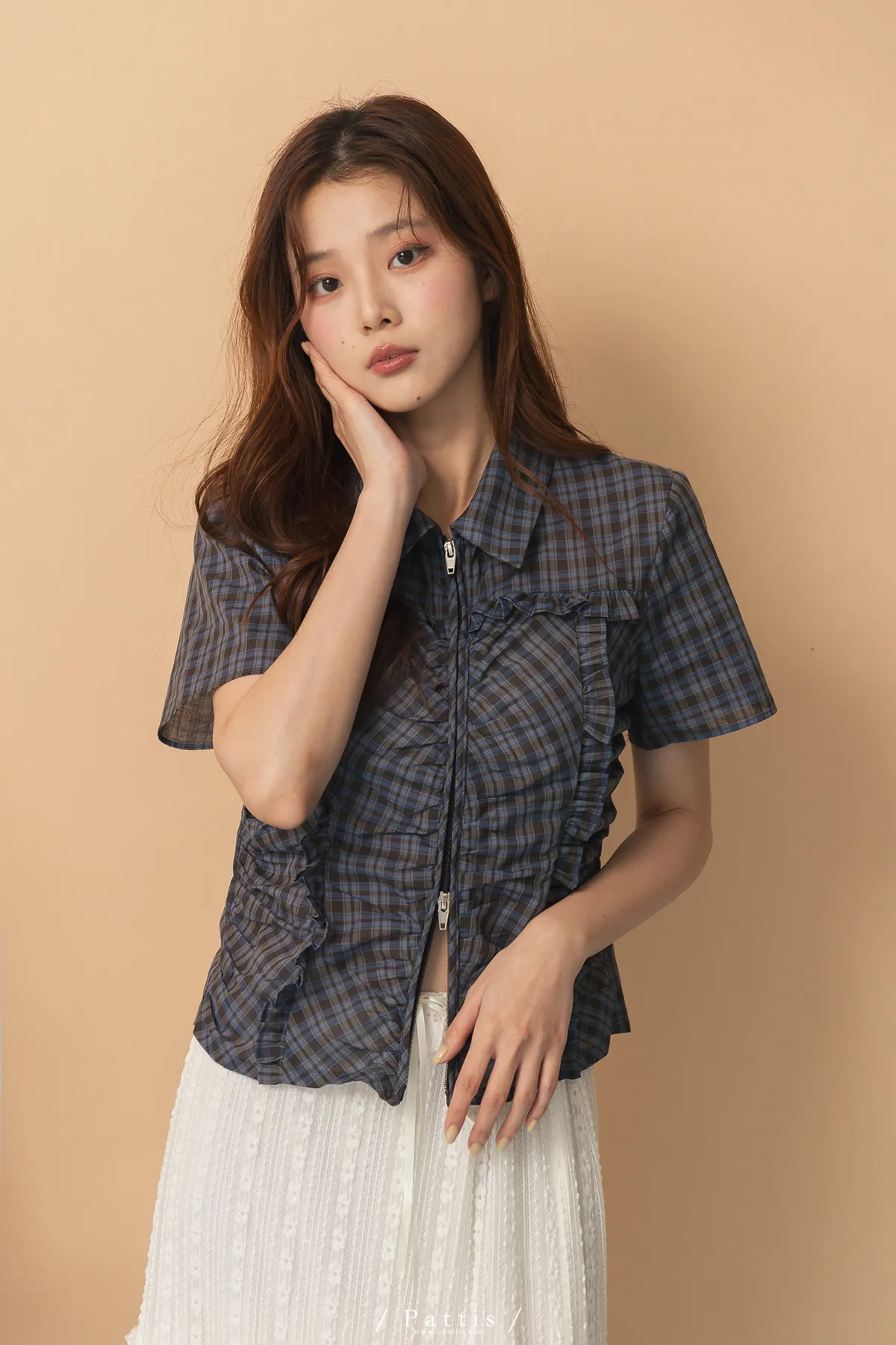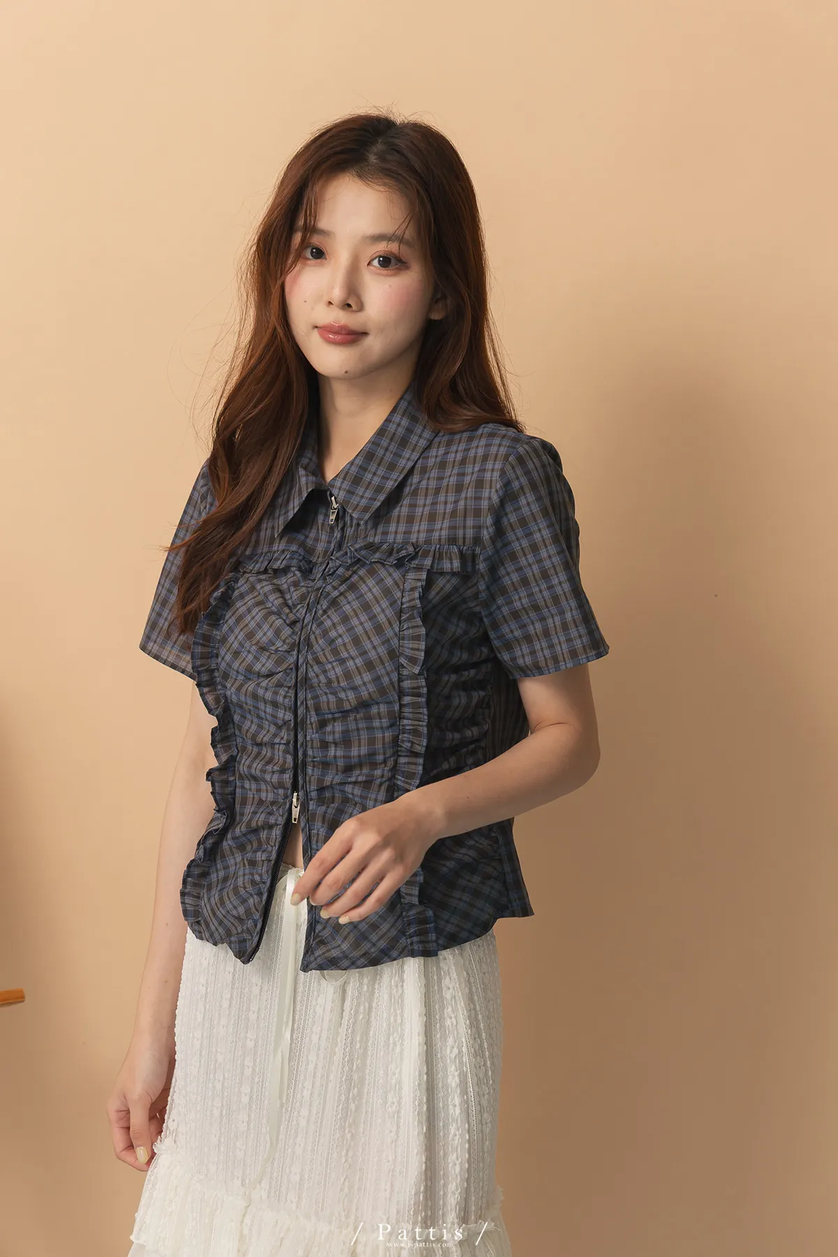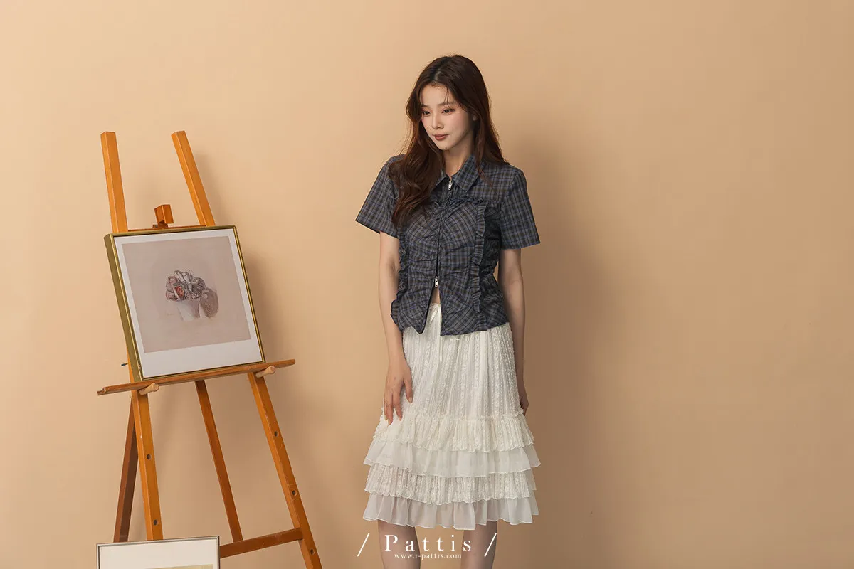 精準摺疊那些小心絲 | 拼接抓皺荷葉格紋襯衫上衣(藍)