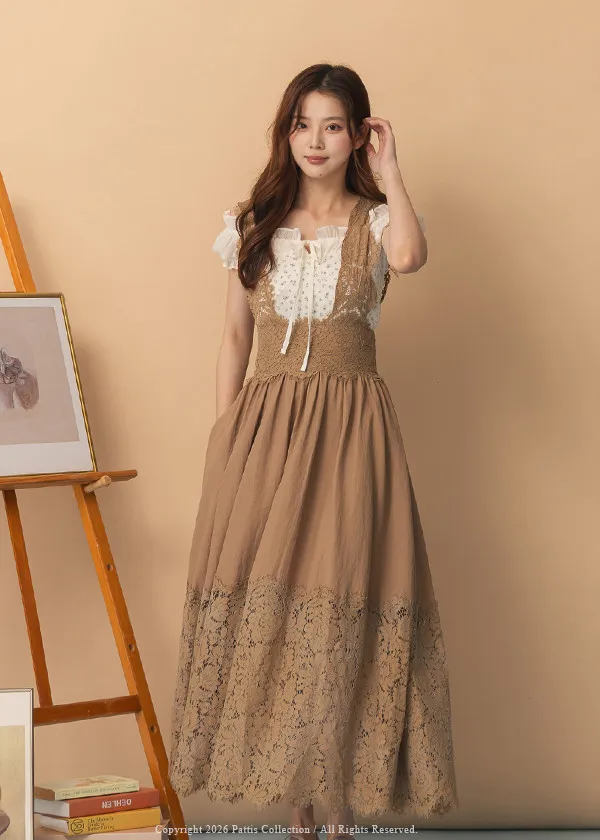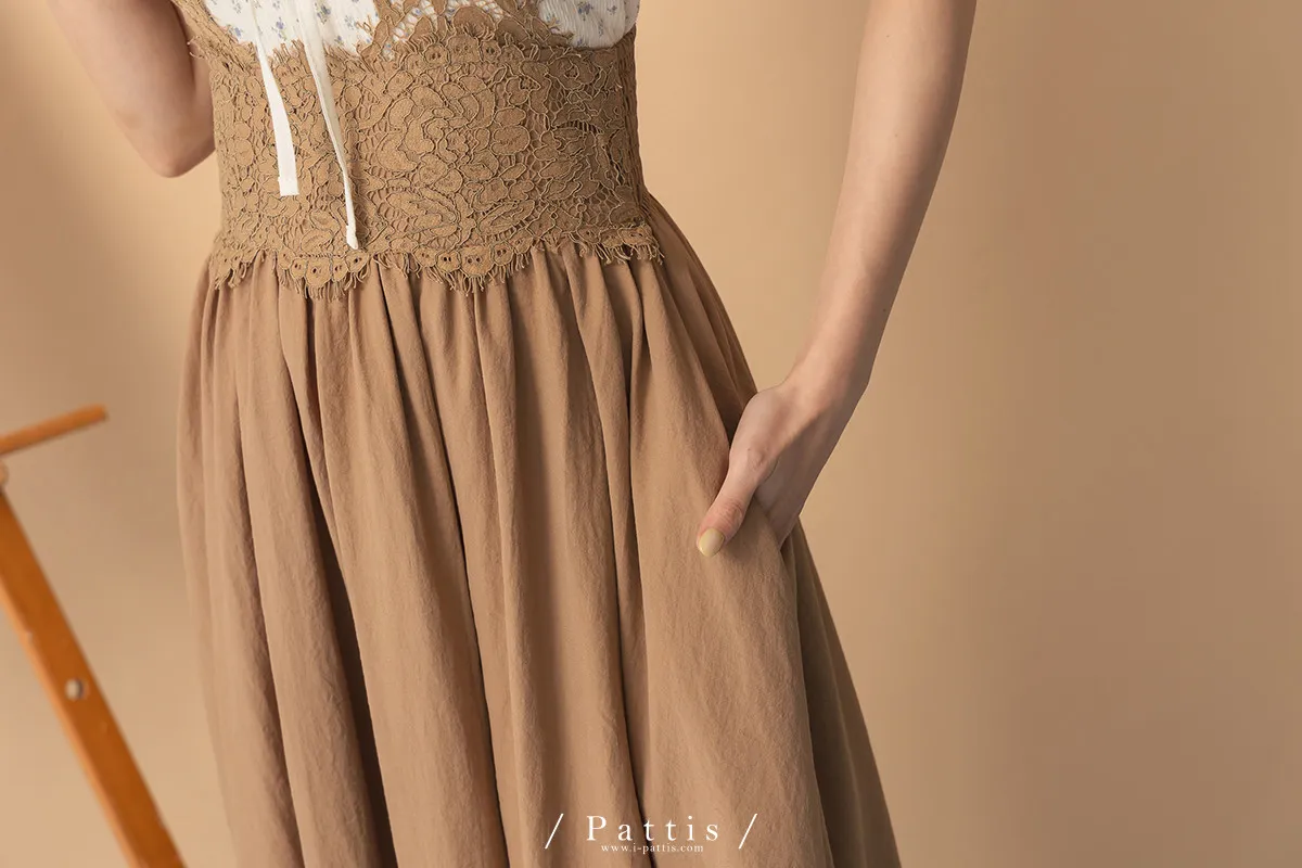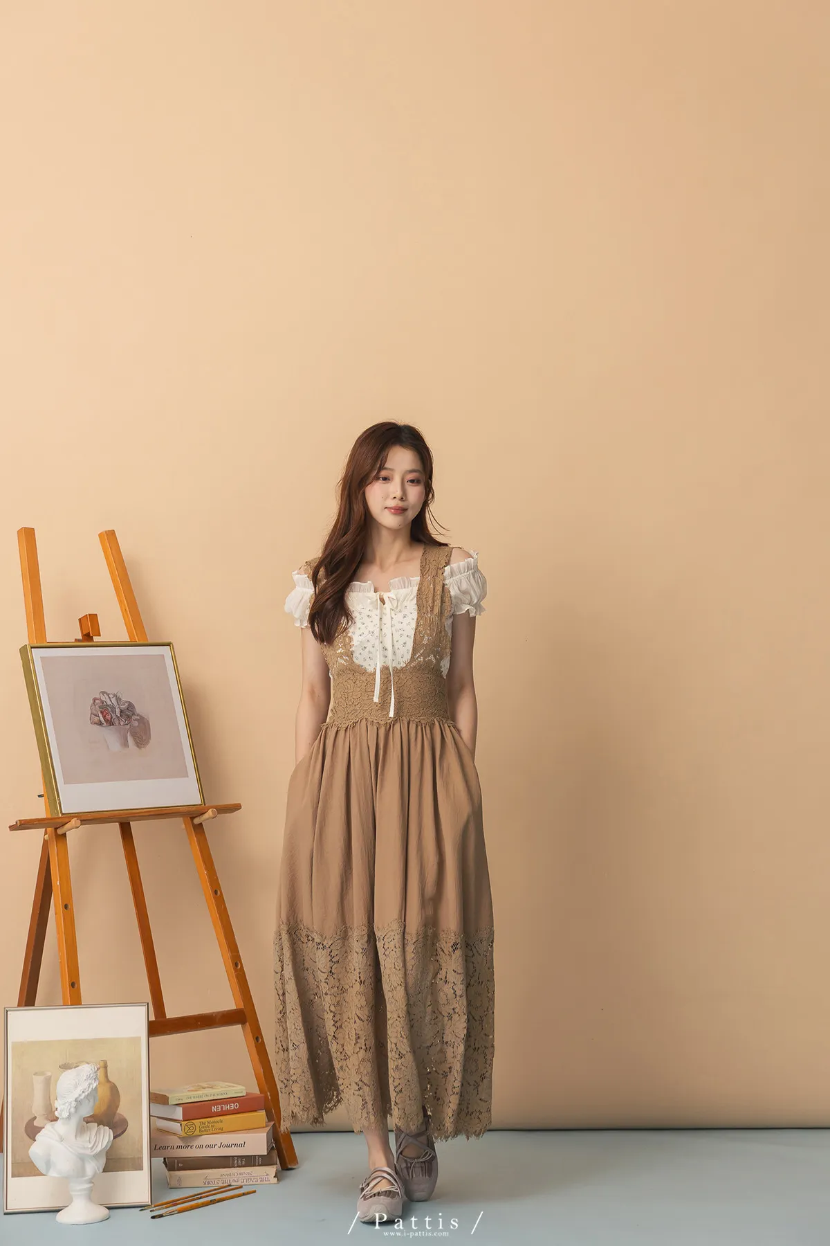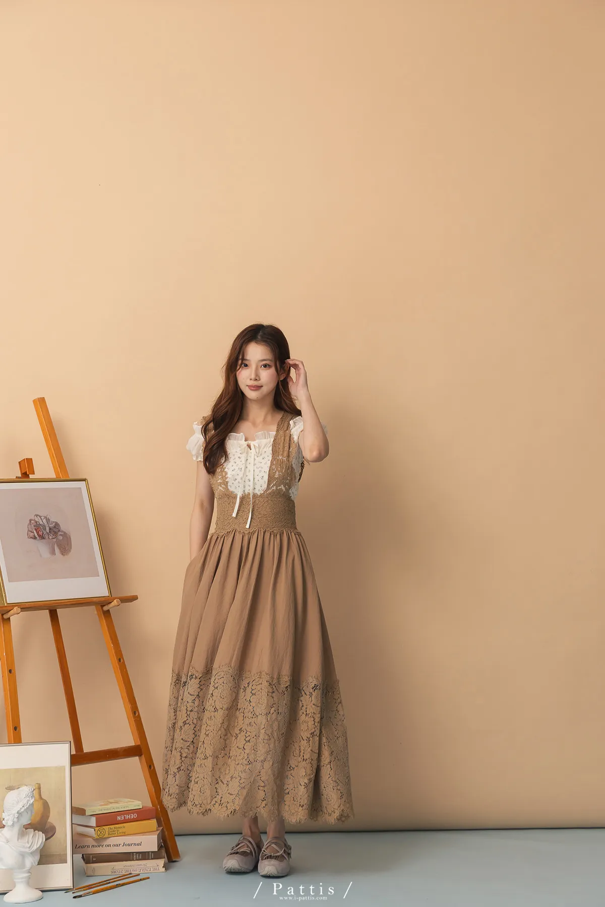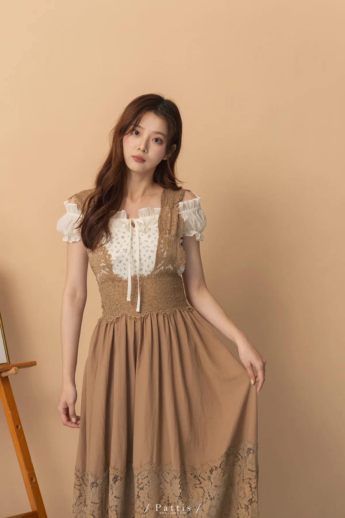 致那場無聲慢舞 | 荷葉蕾絲抓皺吊帶洋裝(杏棕)