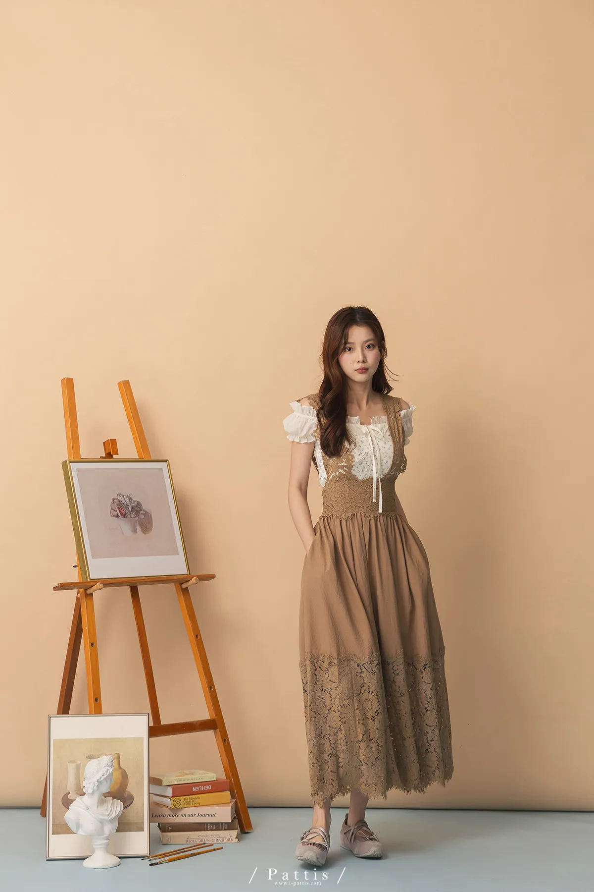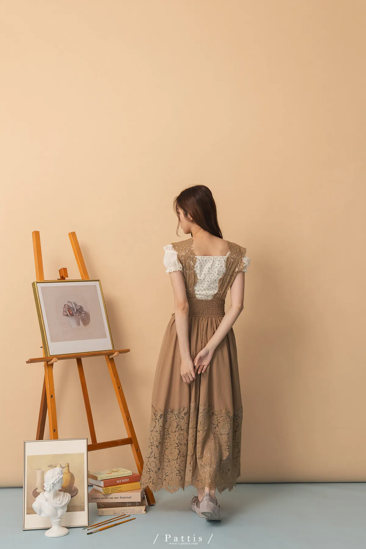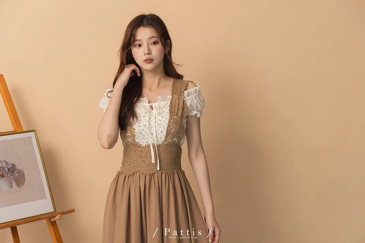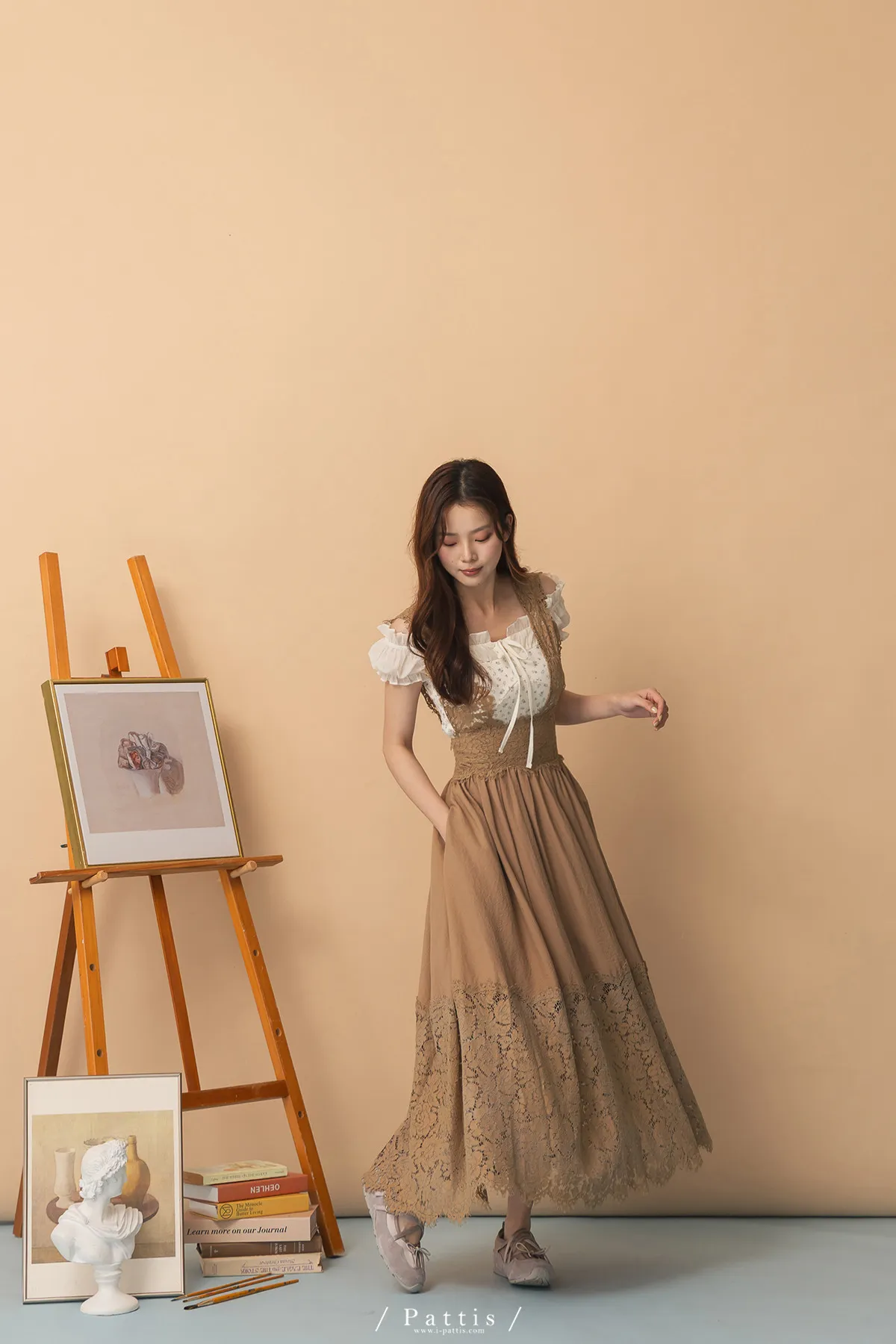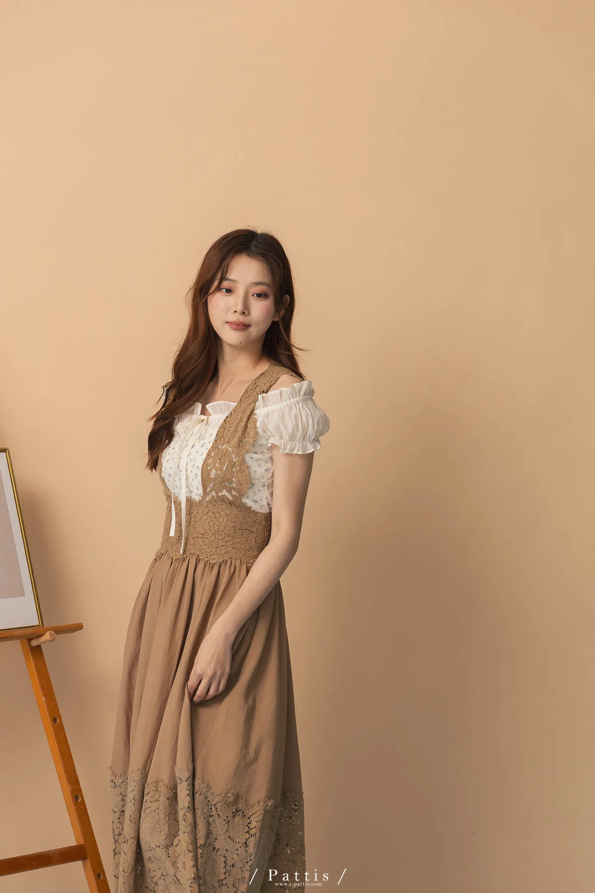 致那場無聲慢舞 | 荷葉蕾絲抓皺吊帶洋裝(杏棕)