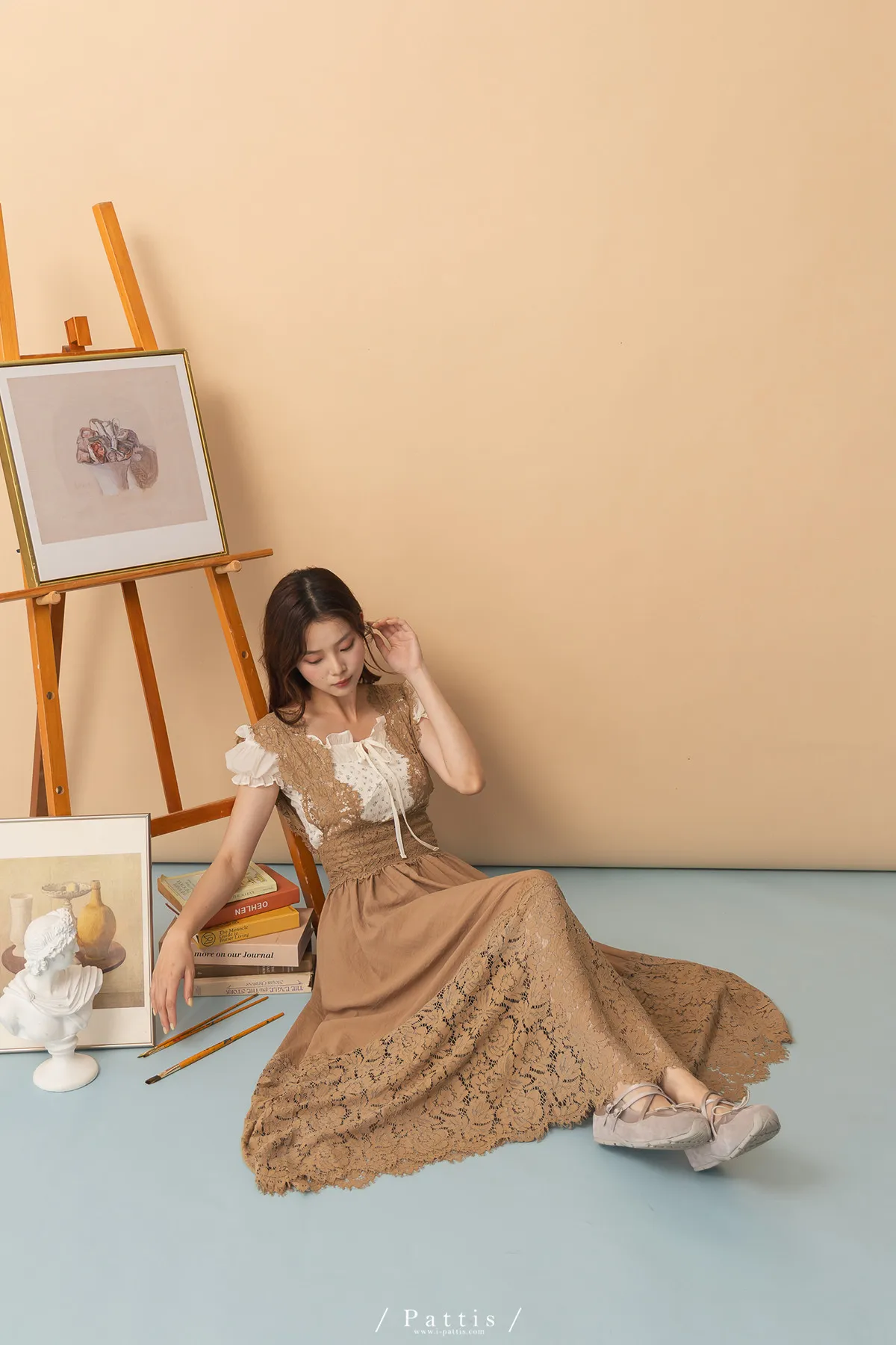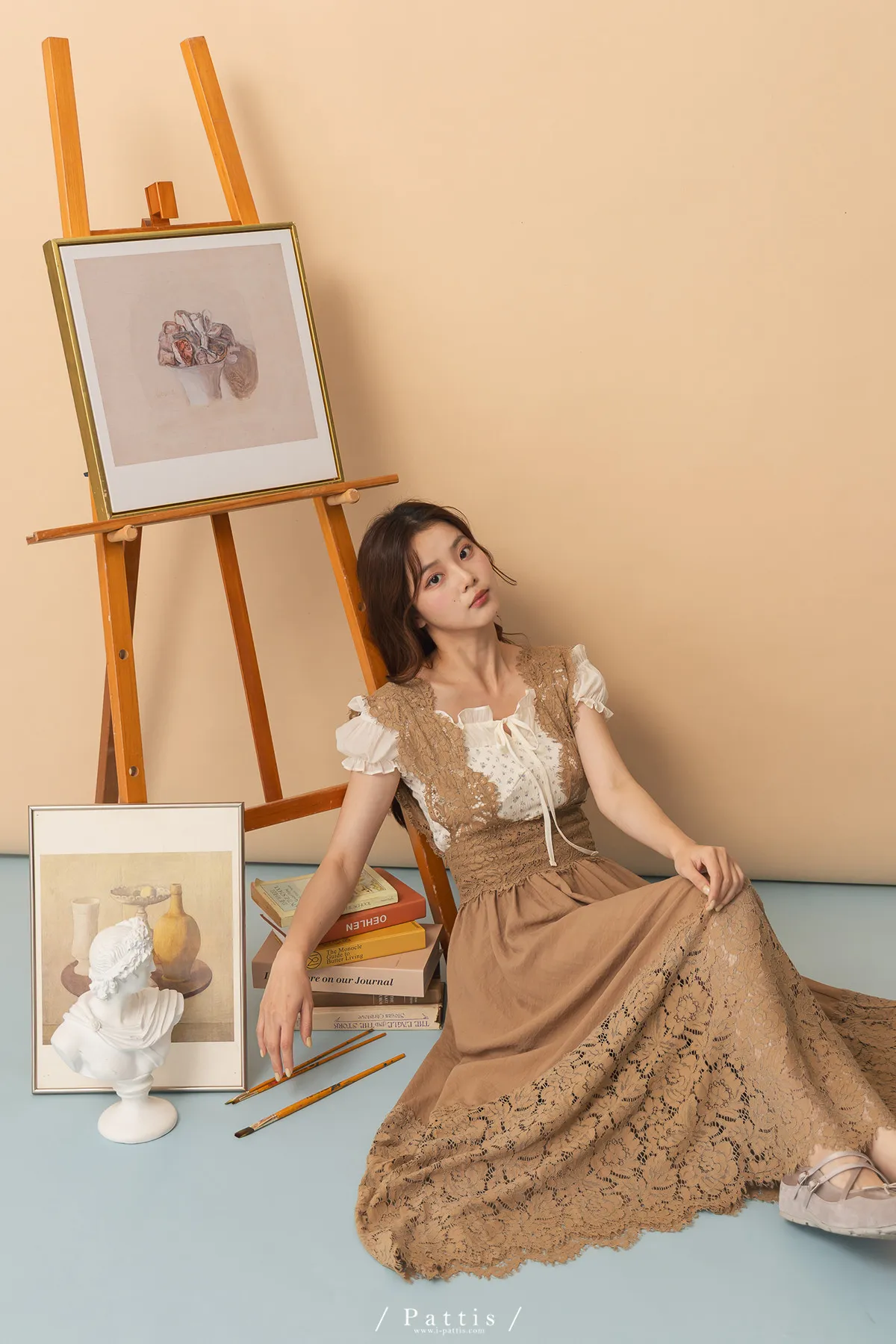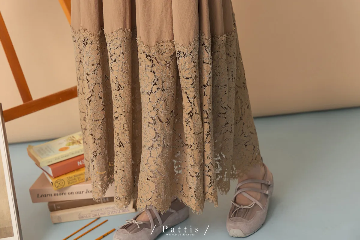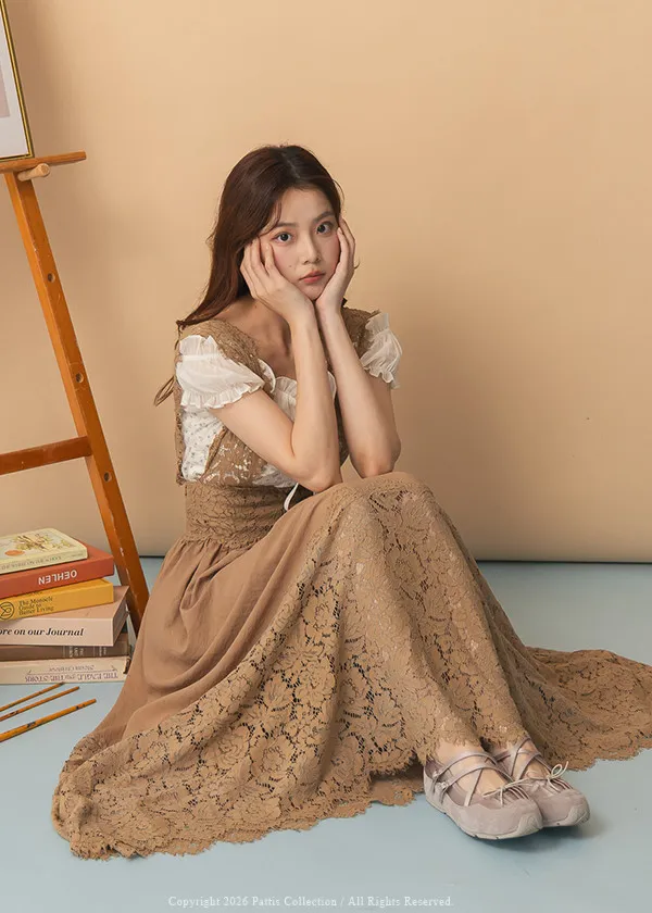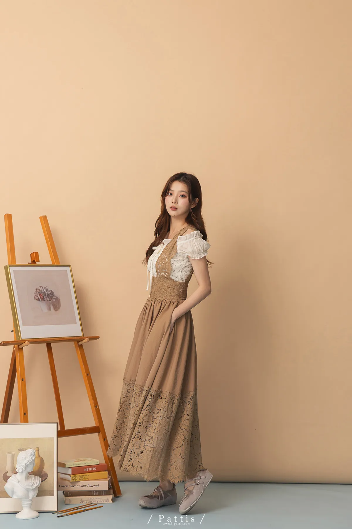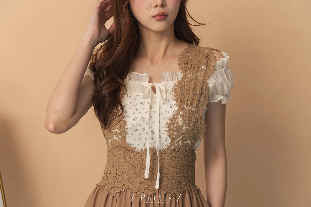 致那場無聲慢舞 | 荷葉蕾絲抓皺吊帶洋裝(杏棕)