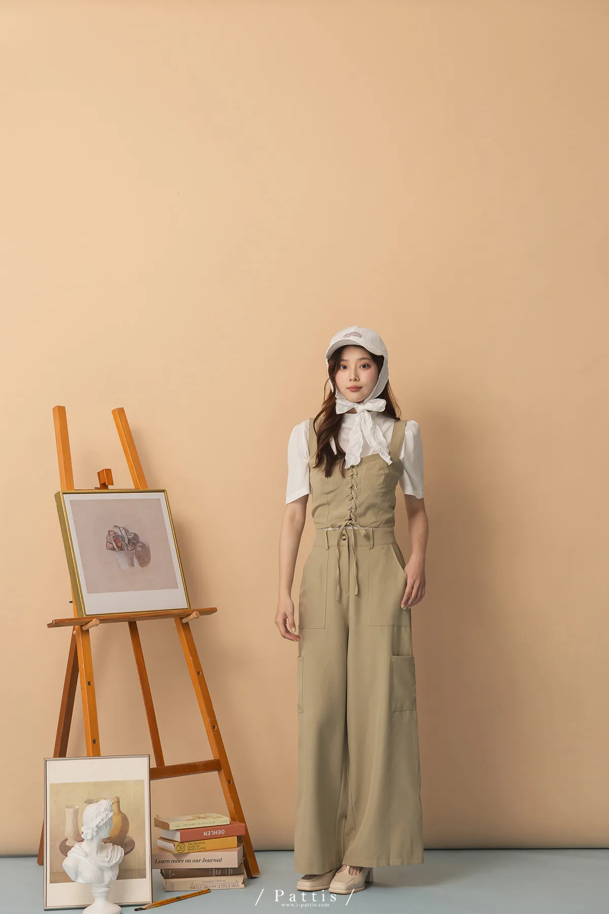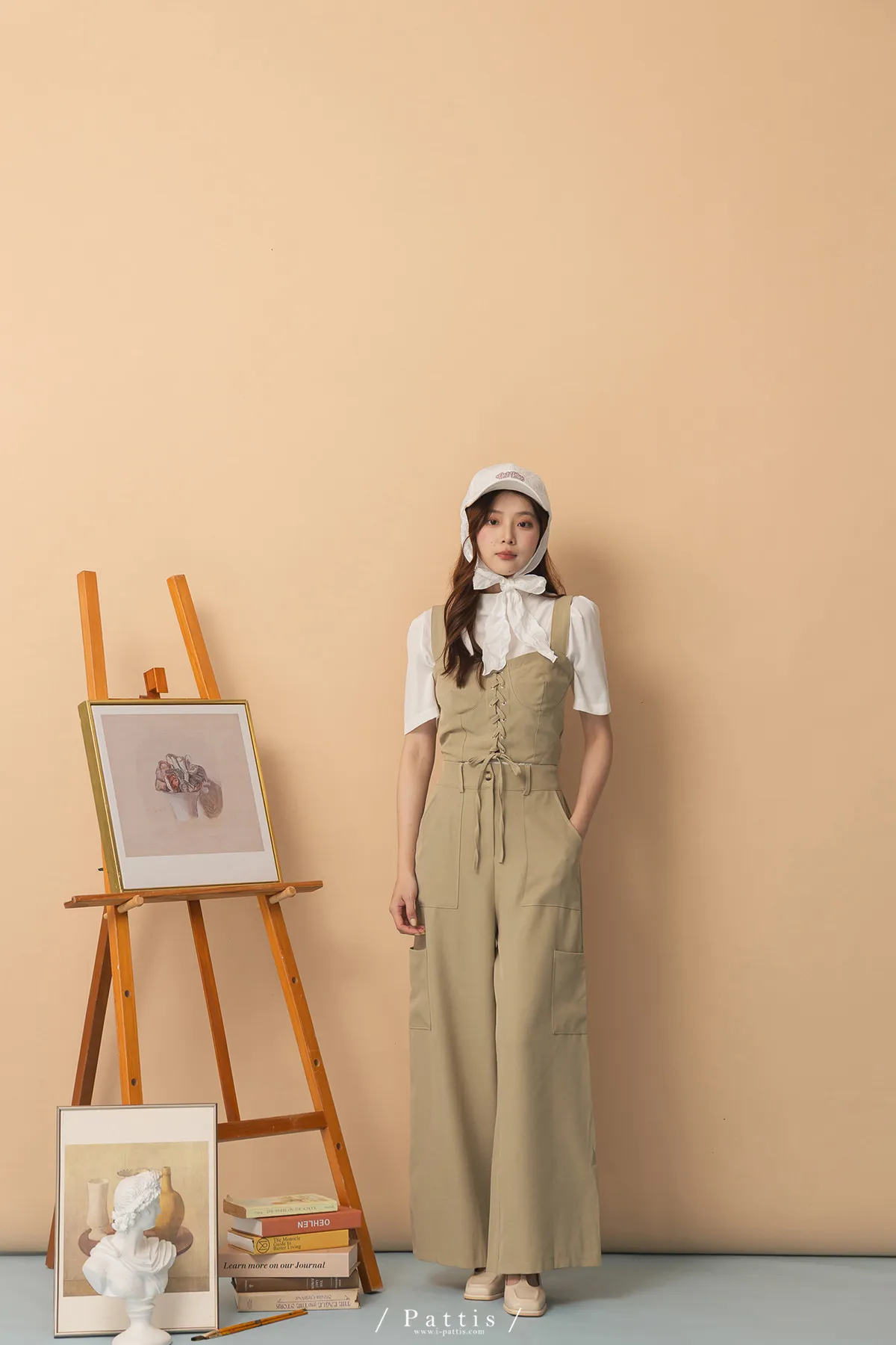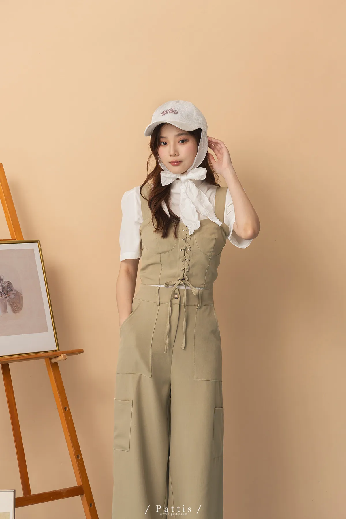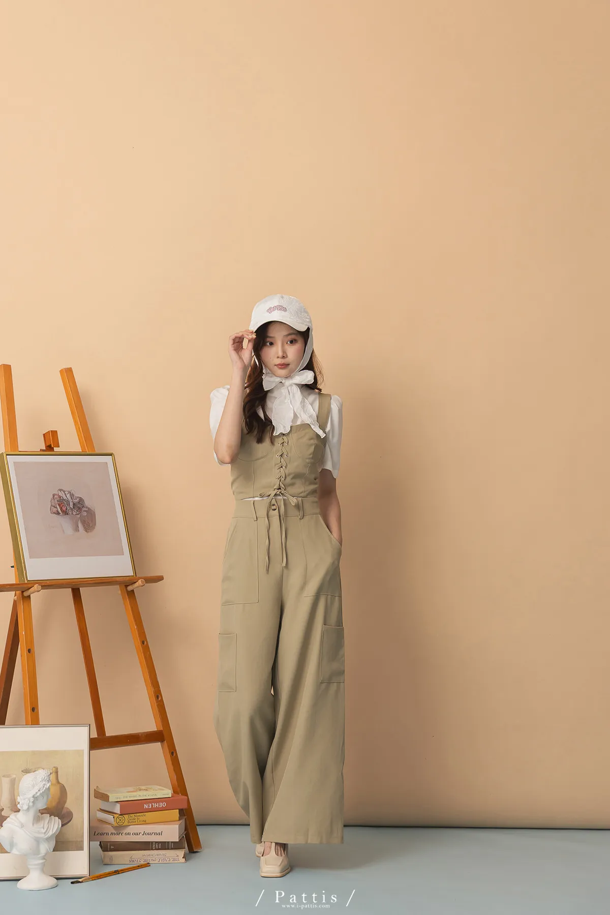 薄暮裡的荒野漫步 | 桃心領交叉綁帶背心+寬褲set組(淺灰綠)