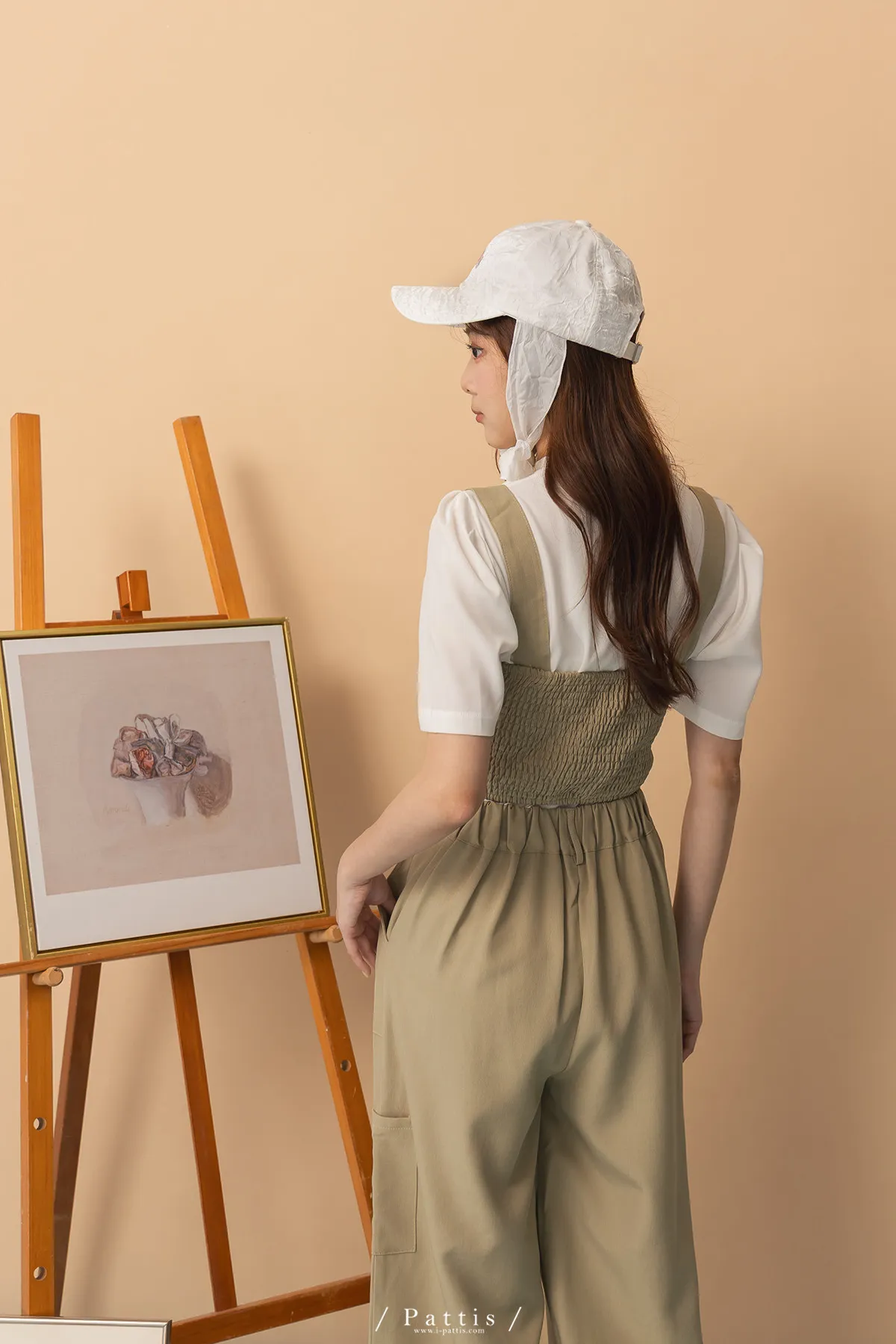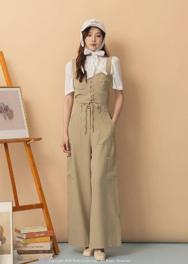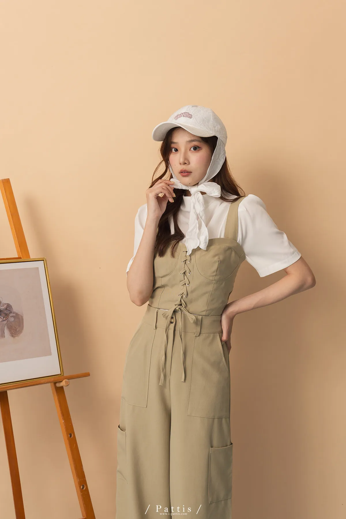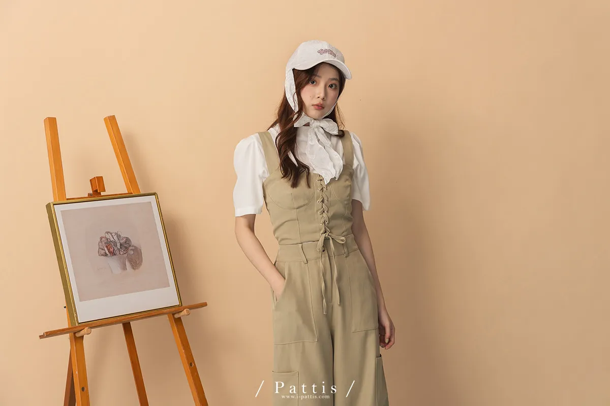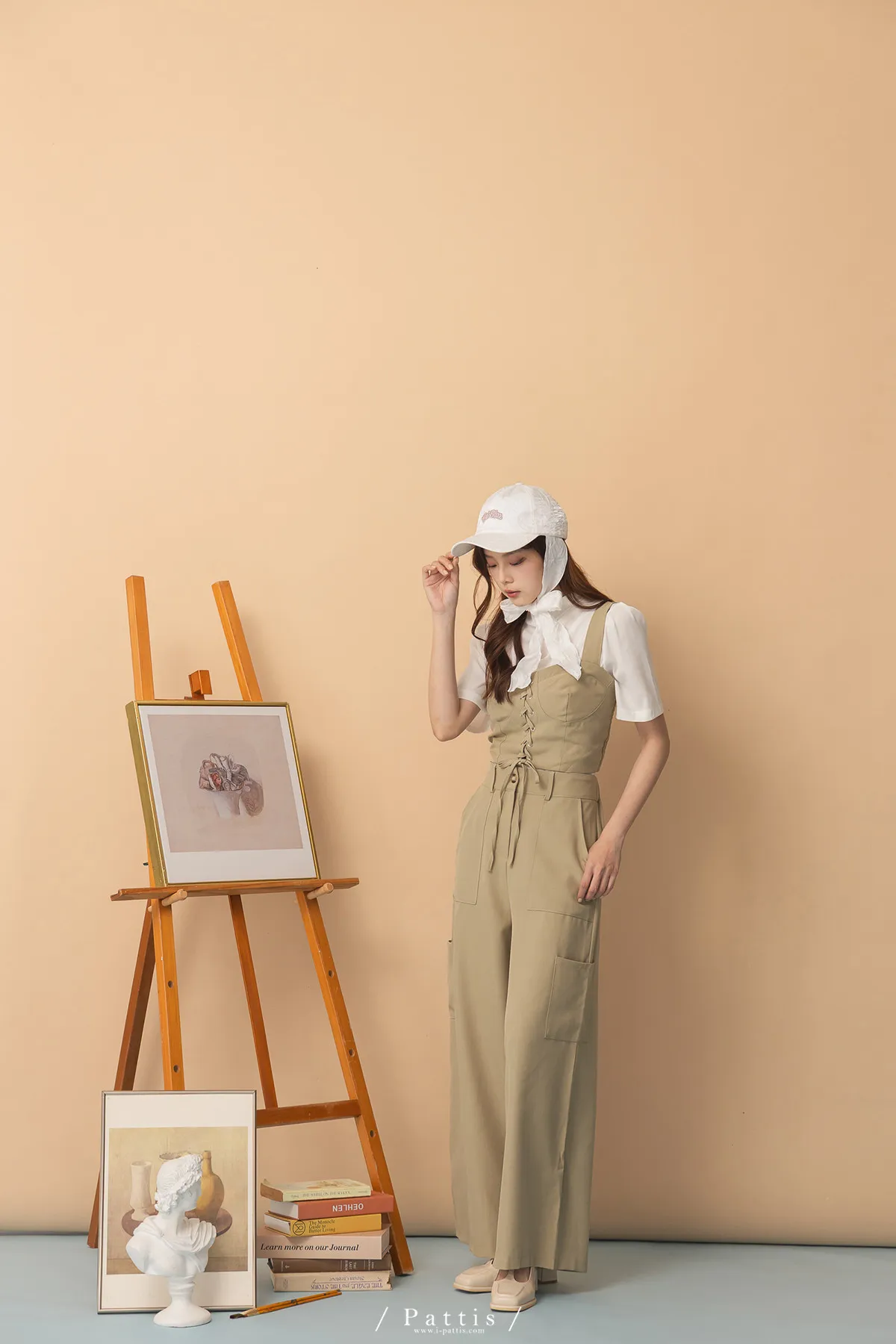 薄暮裡的荒野漫步 | 桃心領交叉綁帶背心+寬褲set組(淺灰綠)
