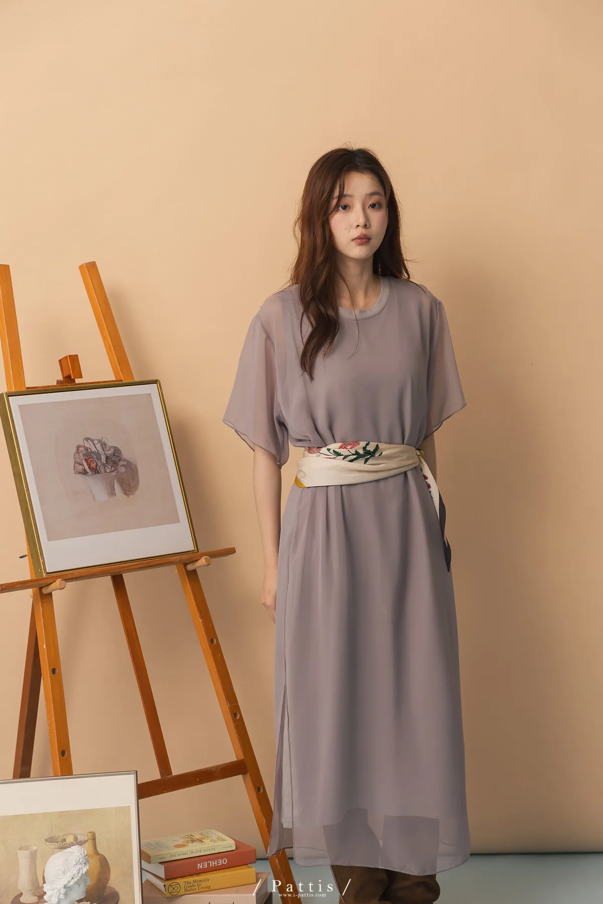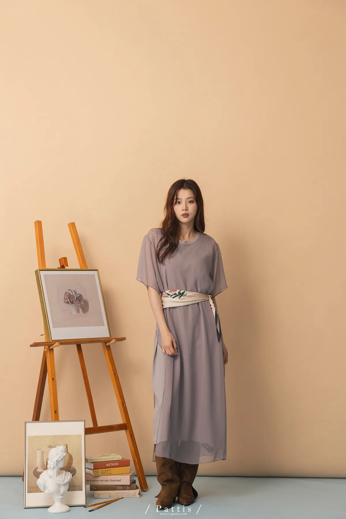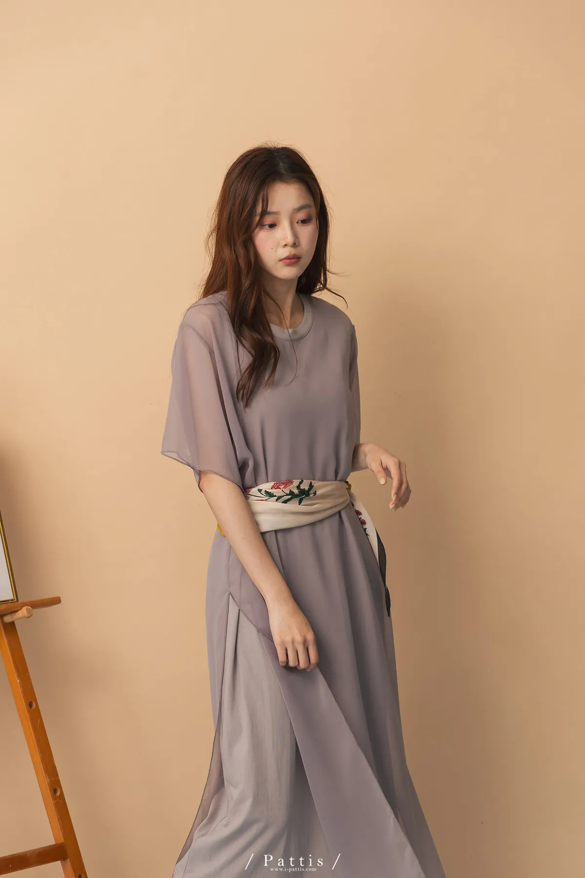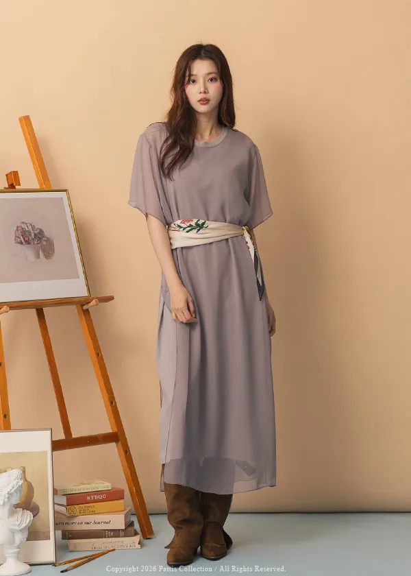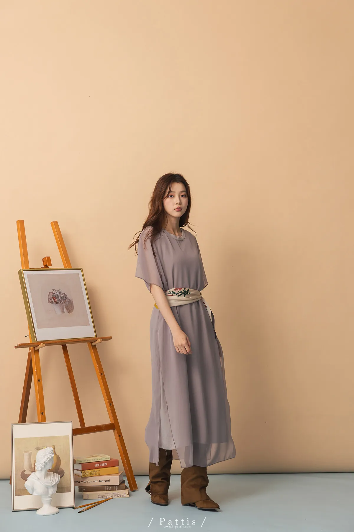 *特*雙層軟質透肌網紗圓領開叉洋裝(淺灰紫)