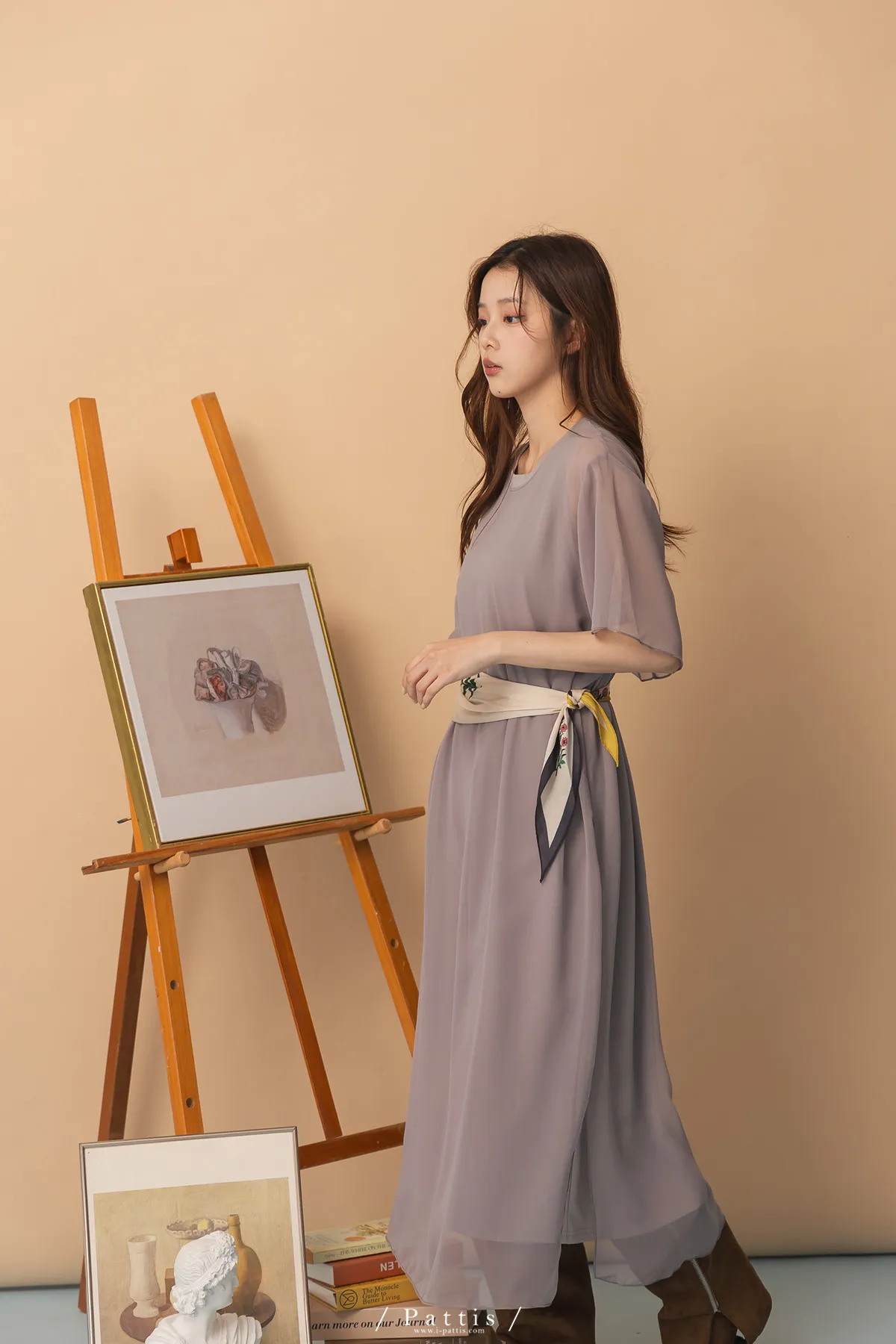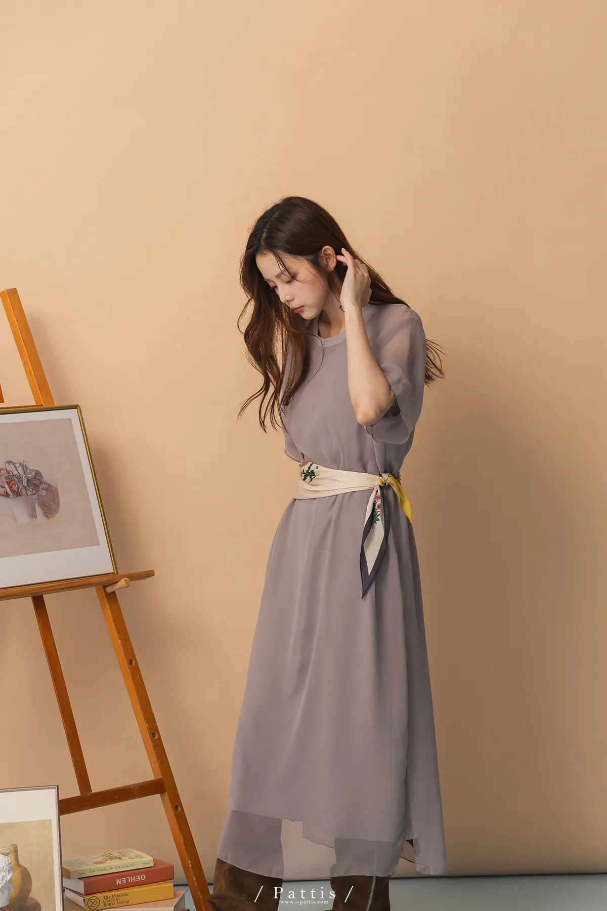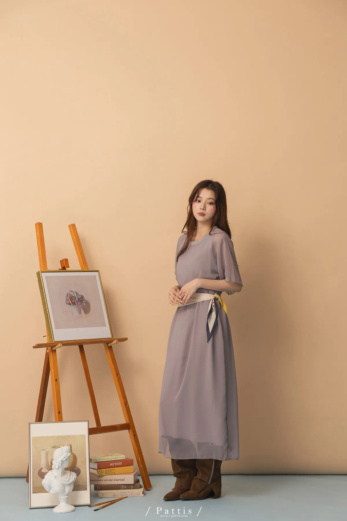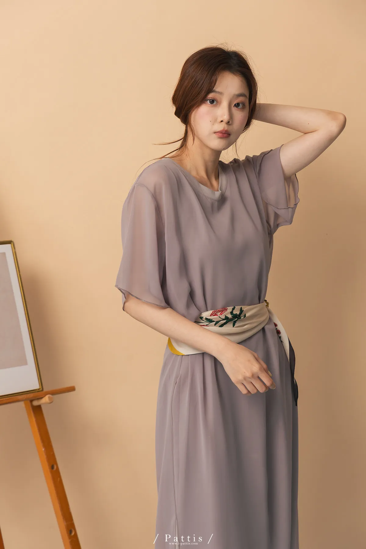 *特*雙層軟質透肌網紗圓領開叉洋裝(淺灰紫)