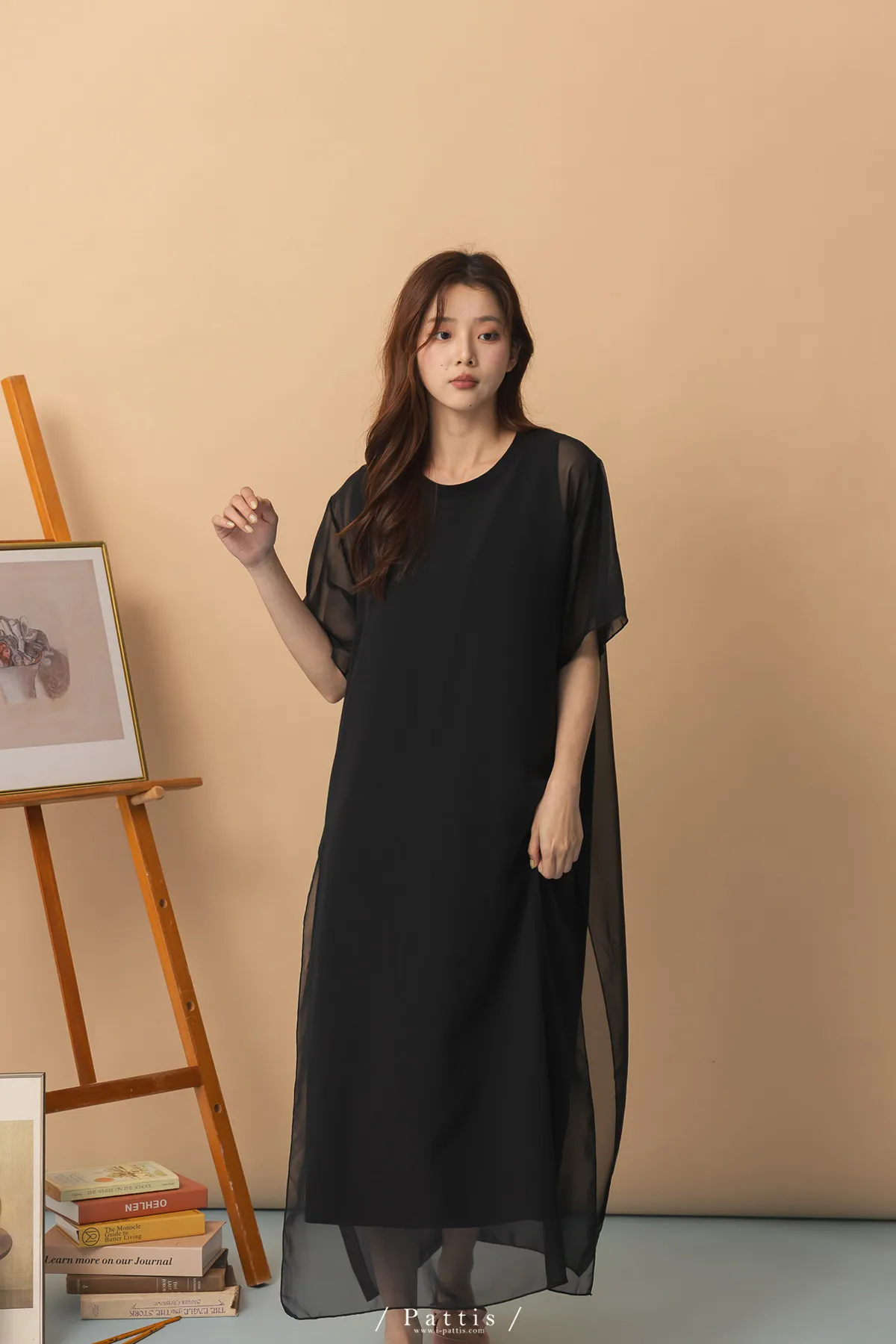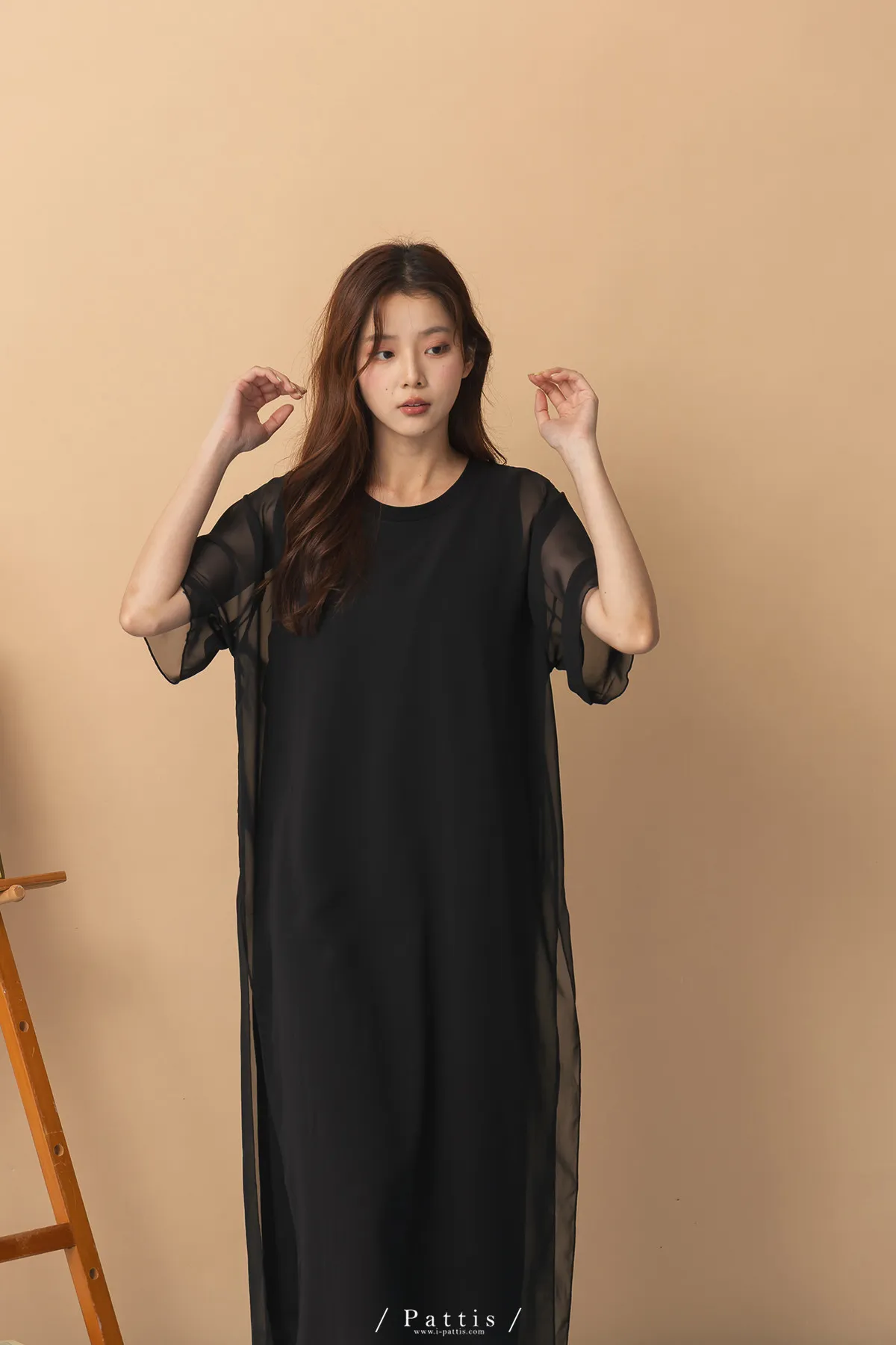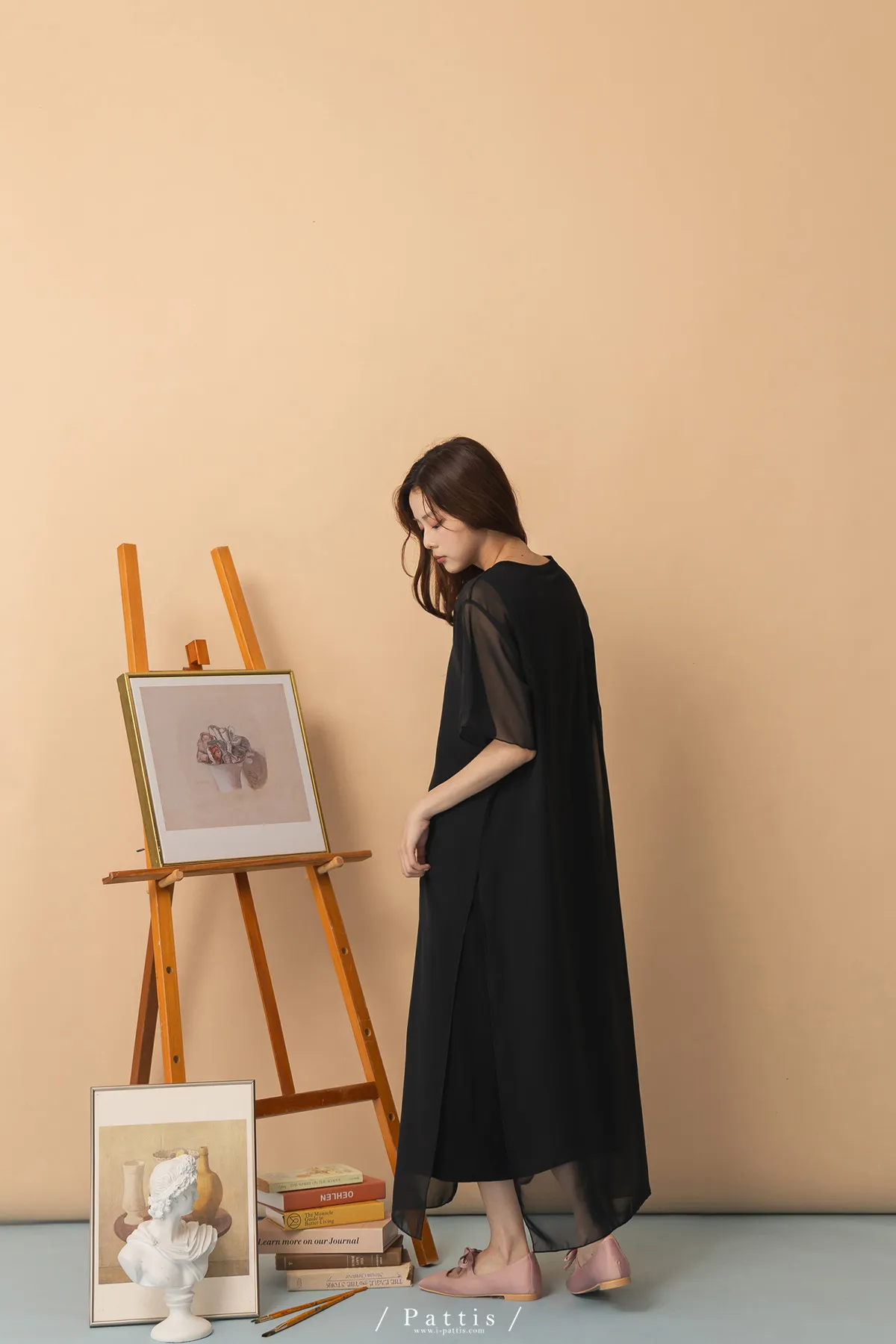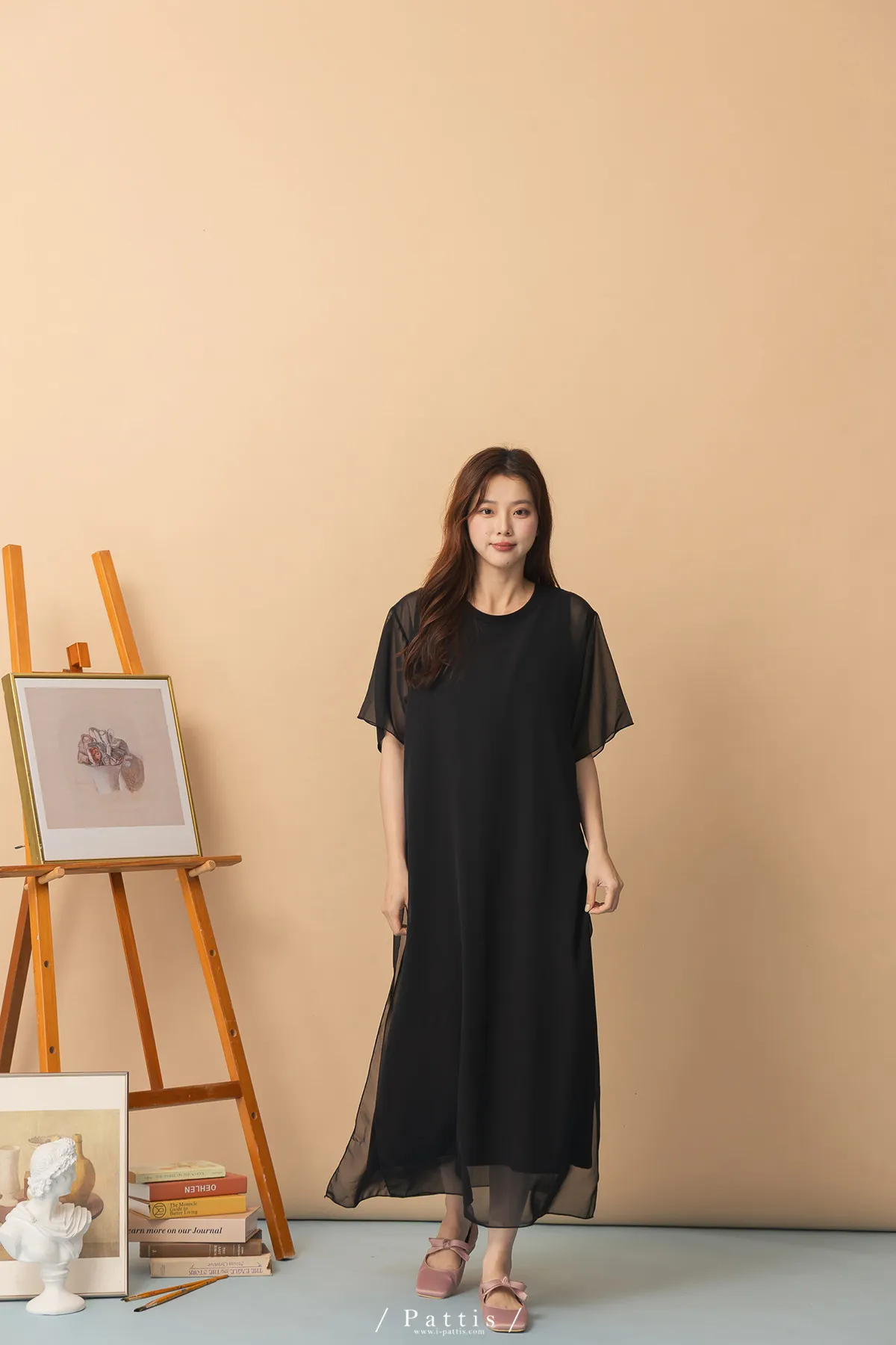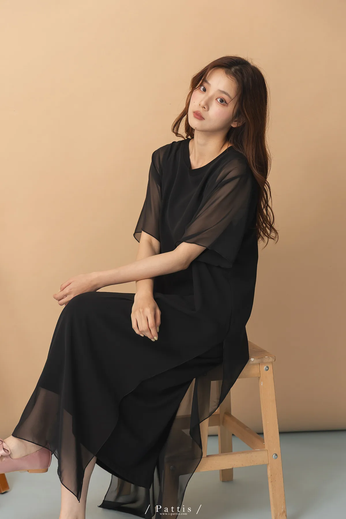 *特*雙層軟質透肌網紗圓領開叉洋裝(黑)