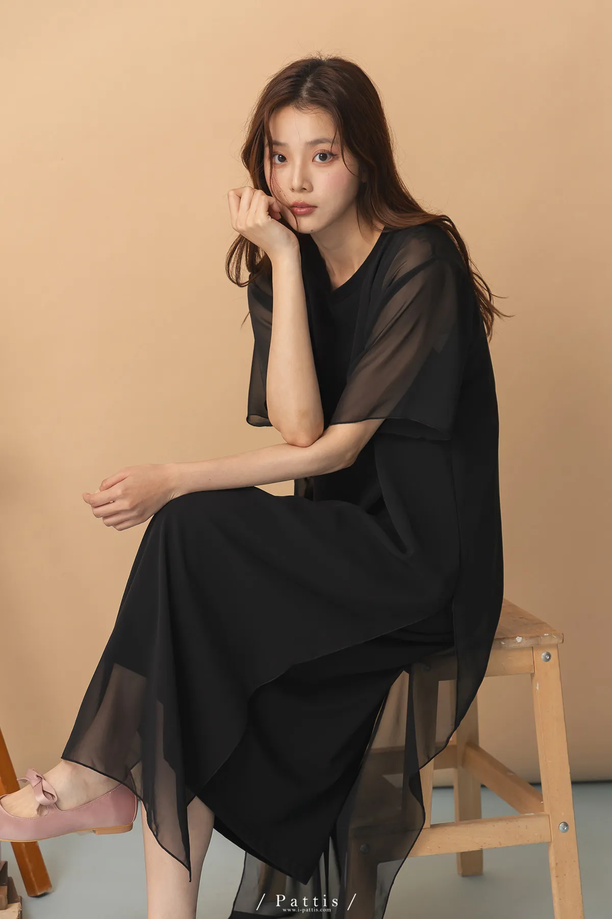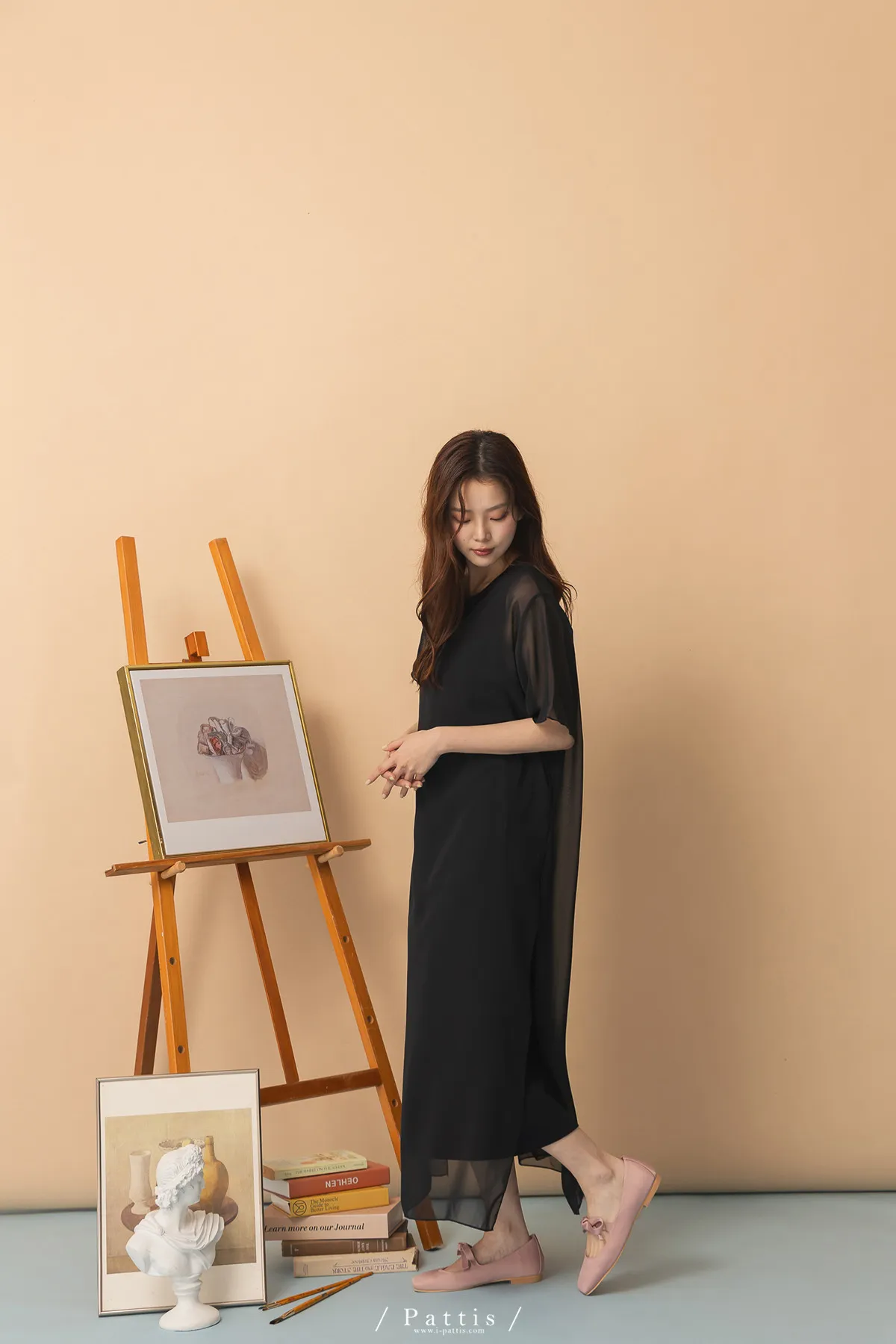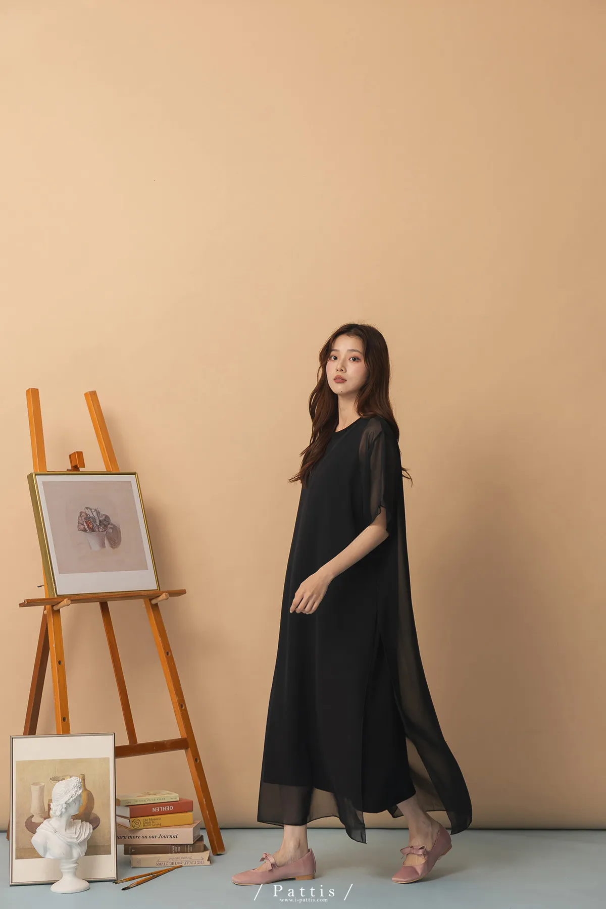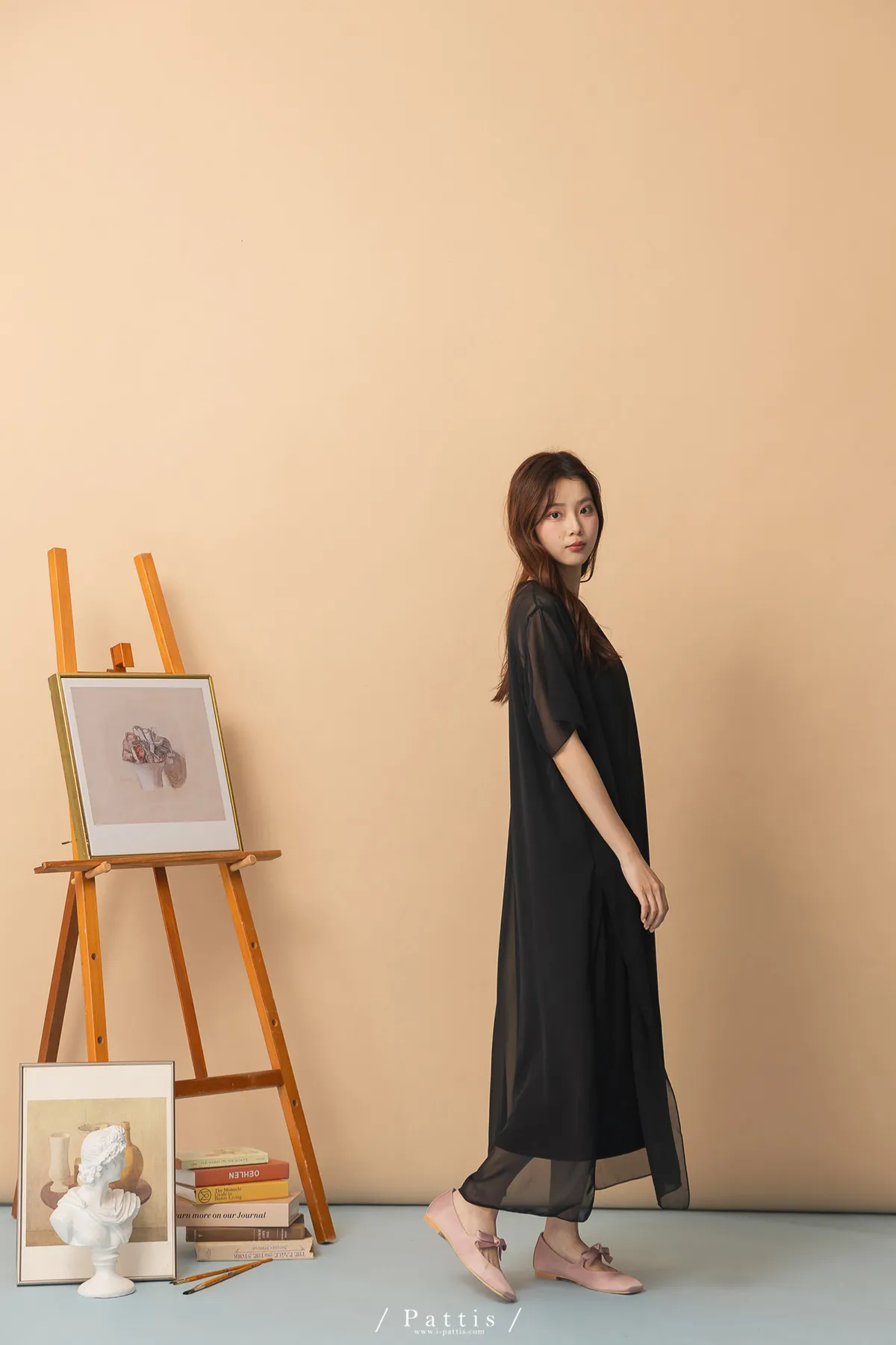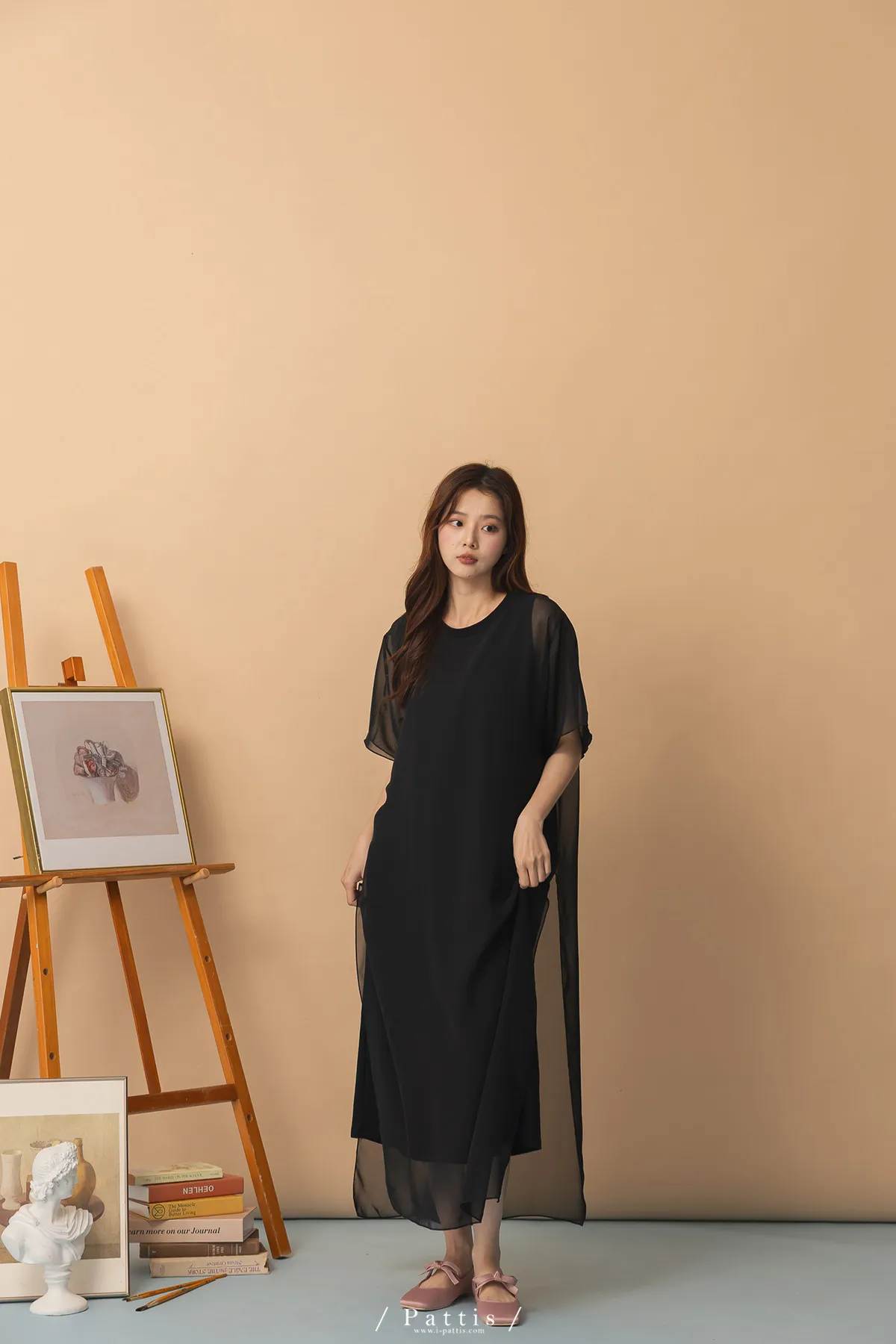 *特*雙層軟質透肌網紗圓領開叉洋裝(黑)